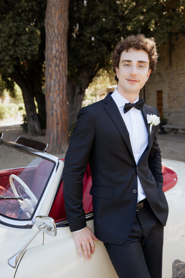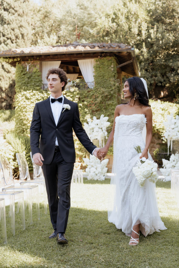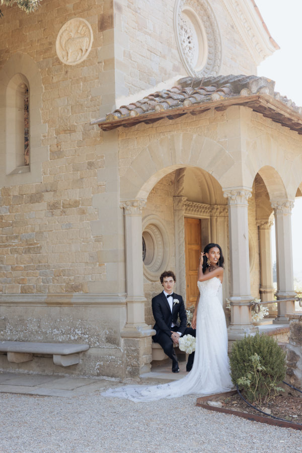 [field title=”Florals & Decor”]The florals by @sebastian_flowers_italy felt like poetry in bloom—loose, romantic arrangements that danced between structure and softness. The palette was rooted in warm neutrals with gentle hints of blush and muted greenery, echoing the aged beauty of the villa and the surrounding Tuscan landscape. Every floral element—from the asymmetrical ceremony installation to the hand-tied bridal bouquet—was designed with an artful eye and an organic spirit. It didn’t feel overdone; it felt felt, like nature had quietly curated the moment itself.