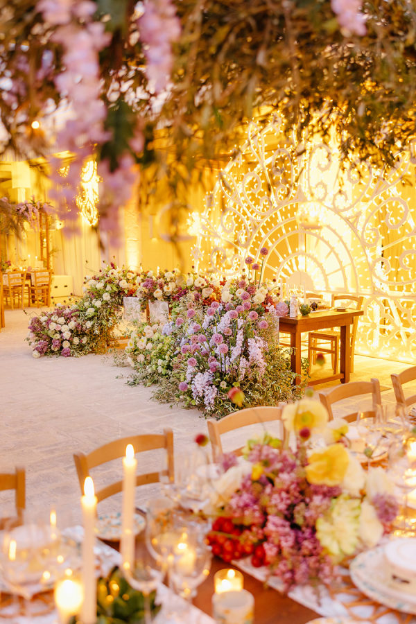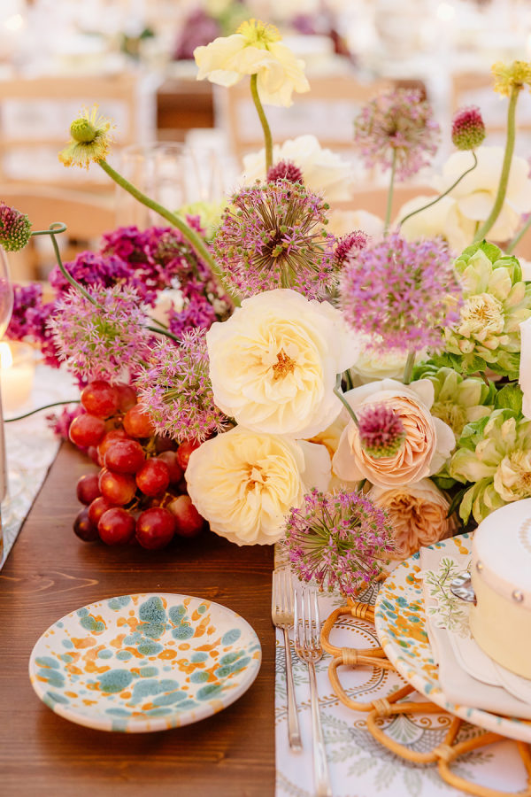 Inspired by the colors of the Italian countryside, the wedding color palette consisted of muted pastels like sage, ivory, mauve, and champagne. After the ceremony, the colors became slightly more saturated, incorporating pops of terracotta, lavender, red, and mulberry.