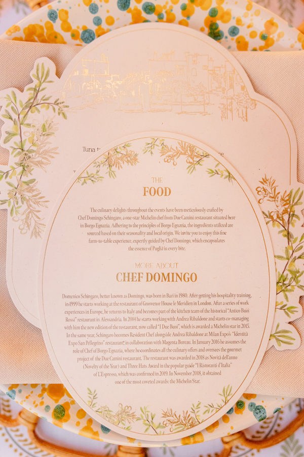 For cocktail hour, guests snacked on traditional Italian hors d’oeuvres, meats, and cheeses, while they watched artisans make the pasta for the night right in front of them! Guests were then treated to a meal created just for the occasion by Chef Domingo, a Michelin-star chef, crafted from local ingredients.