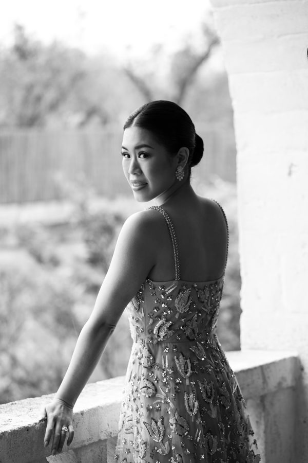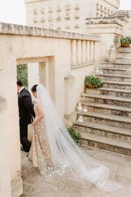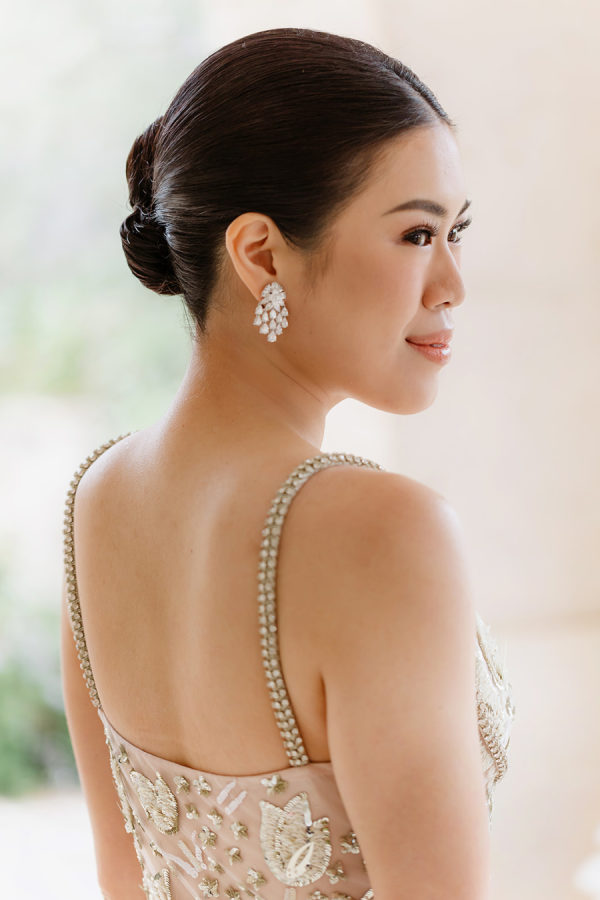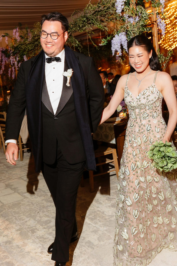 The bride’s custom Valentino gown is the stuff dreams are made of. It was a delicate A-line gown, made of beaded lace in an abstract floral motif with metallic accents. The light peach lining added a warm and unexpected surprise to the ethereal ensemble.