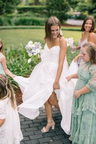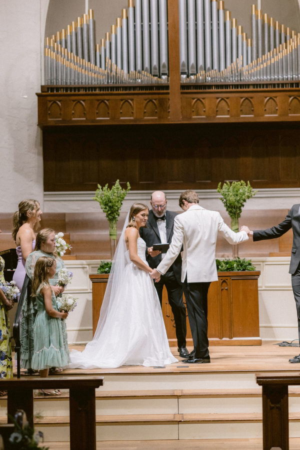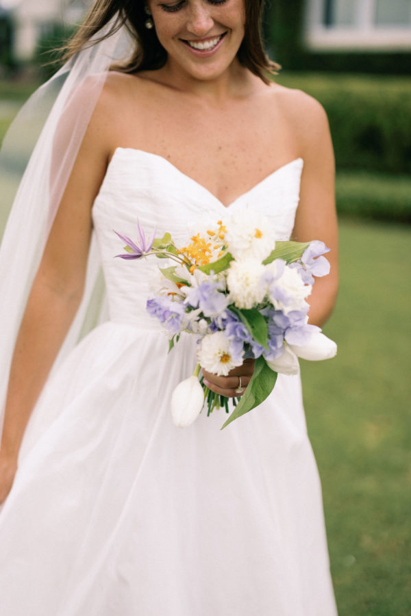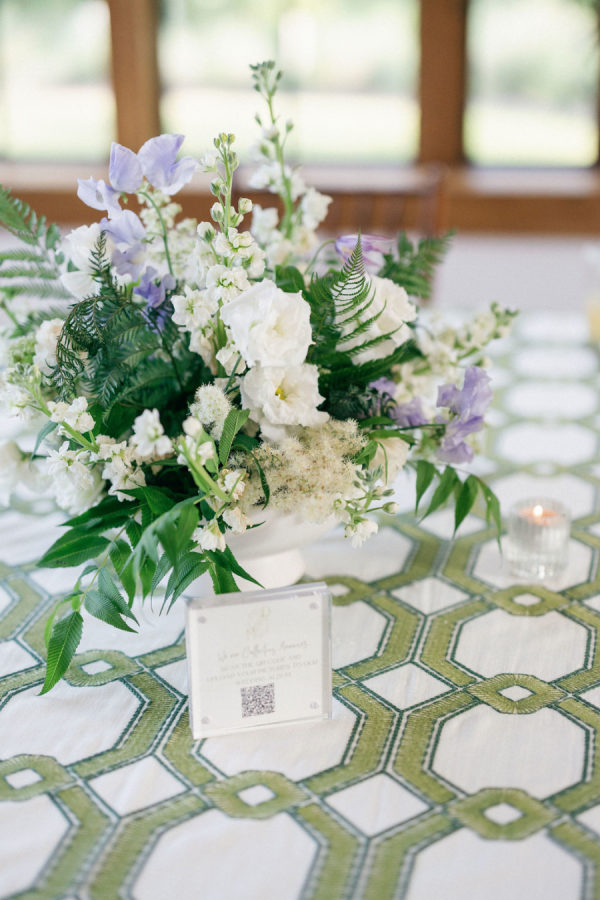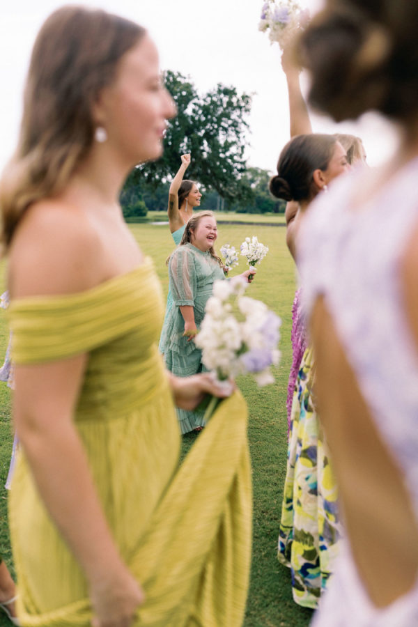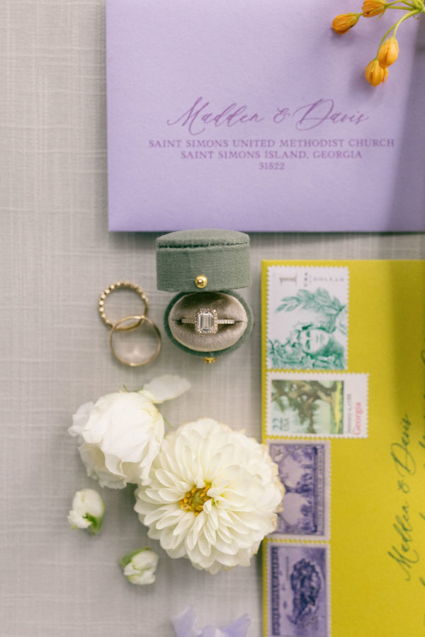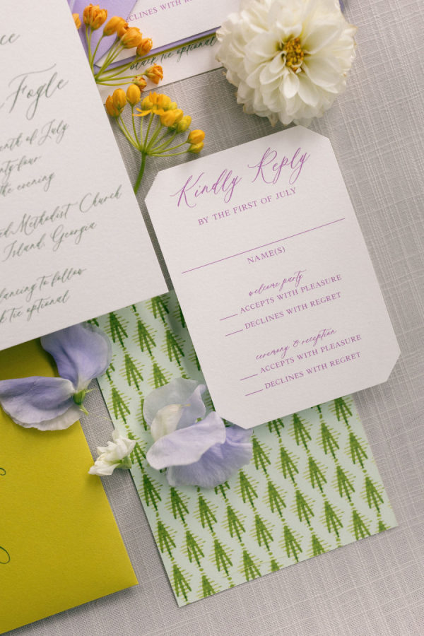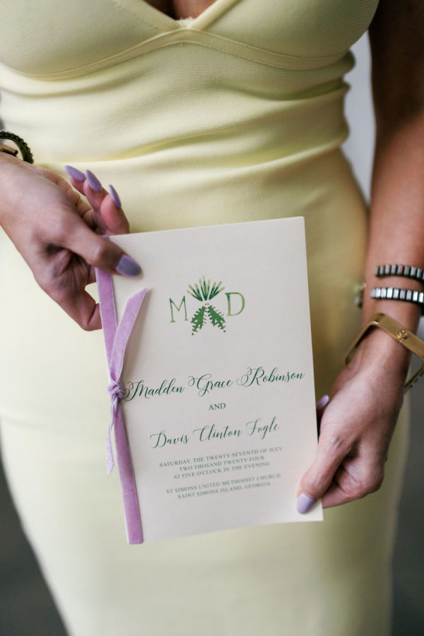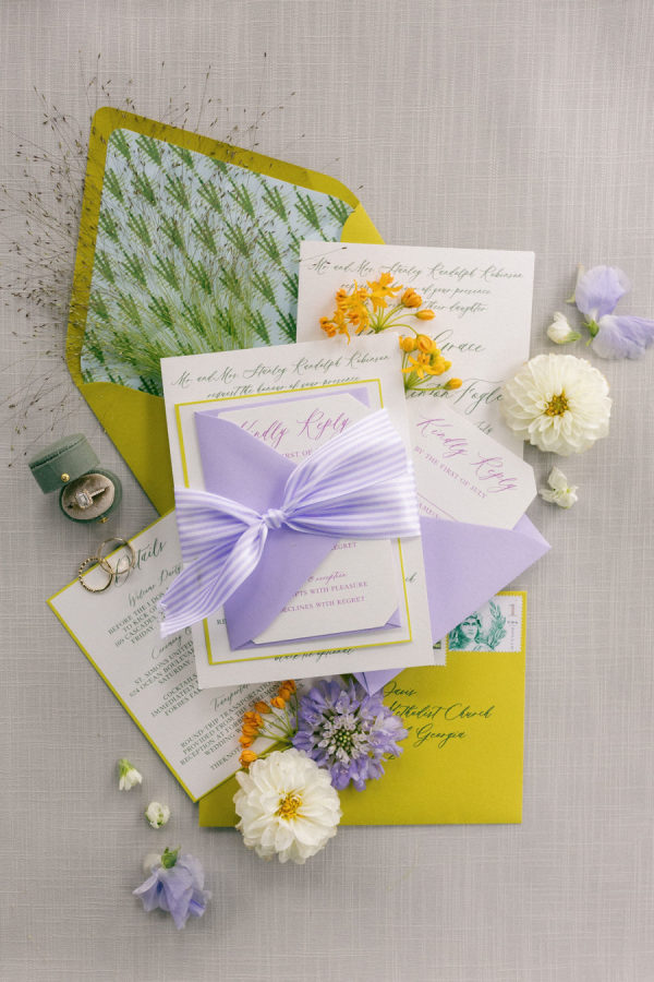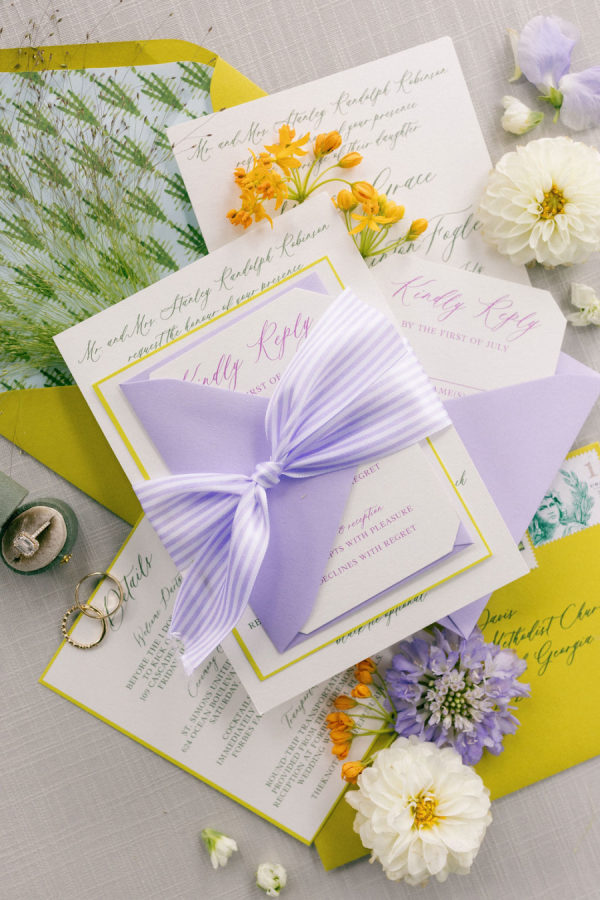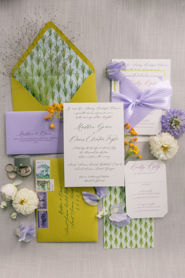 Madden and Davis’s wedding day was a vibrant celebration of color, with a fresh palette of lavender, chartreuse. The unexpected combination felt both playful and true to Madden’s personality, weaving through every detail from the florals to the stationery. These hues brought a garden-like charm to the celebration, perfectly reflecting the couple’s joyful, modern style.
