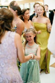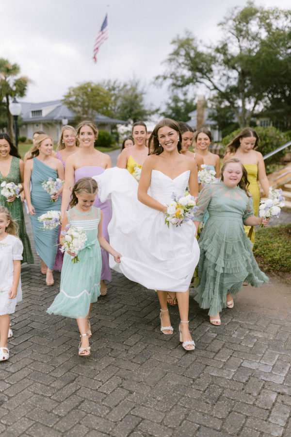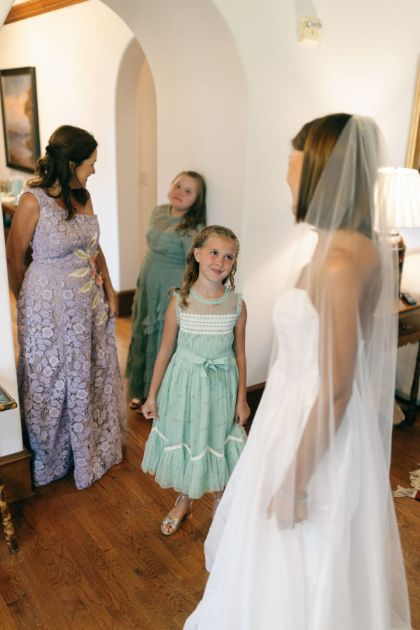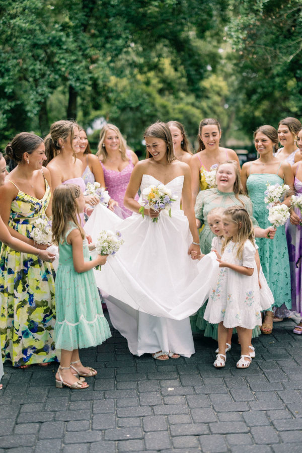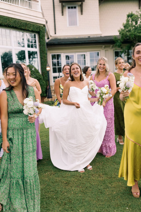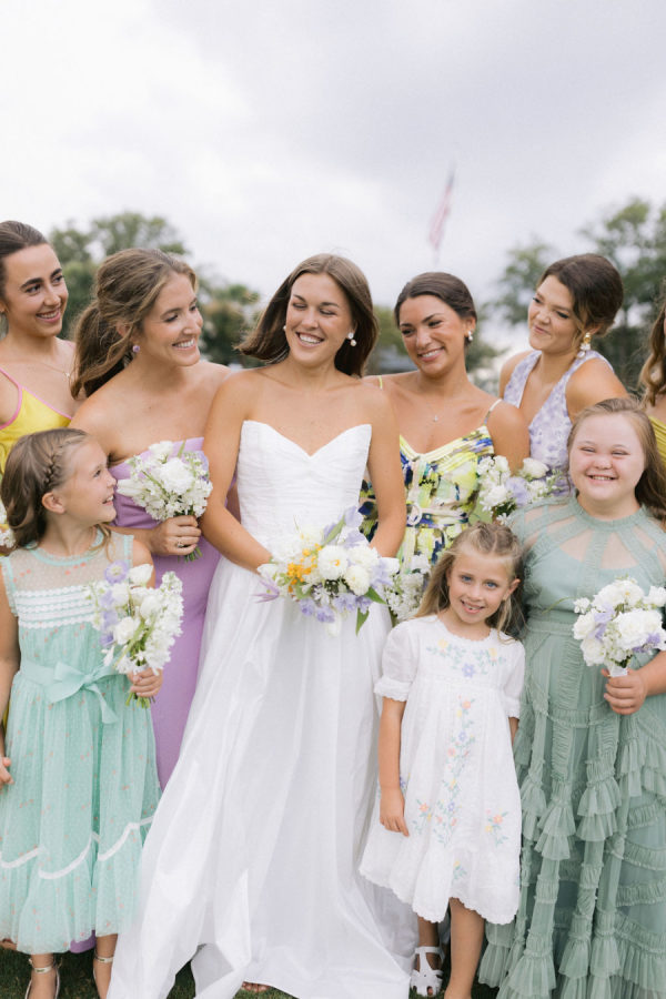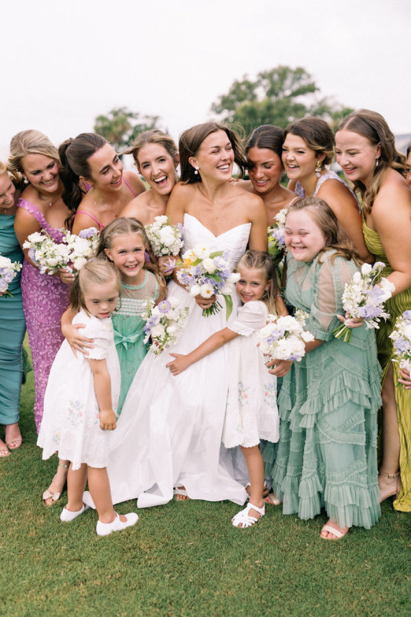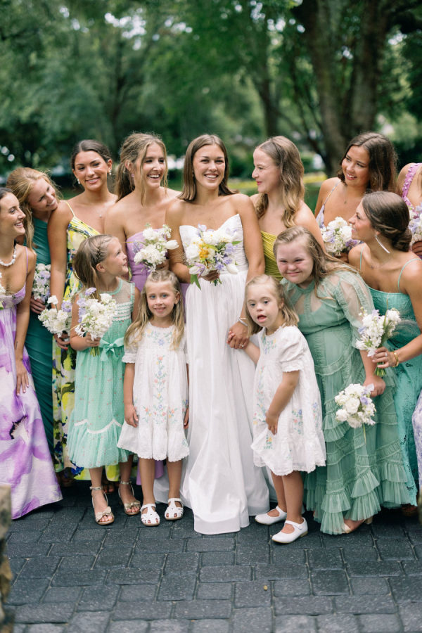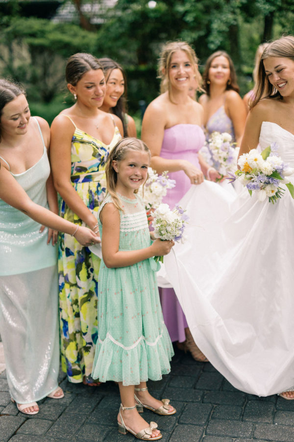 Madden gave her bridesmaids the freedom to choose their own dresses, drawing inspiration from the wedding’s fresh palette of lavender, chartreuse, and green. The result was a playful mix of textures and funky patterns that felt effortlessly cool and completely cohesive. Each look reflected the individual style of her friends while adding depth and personality to the overall aesthetic.
