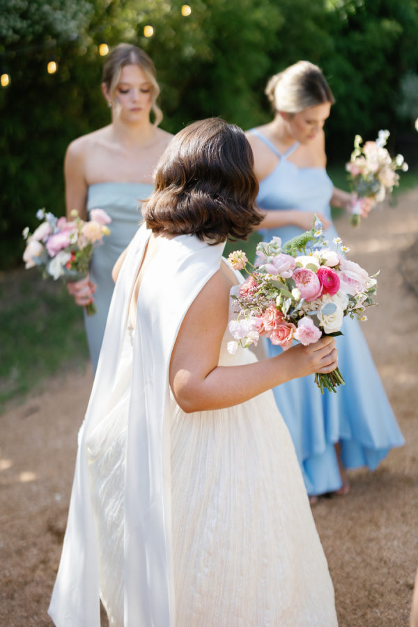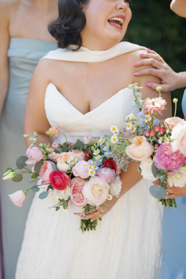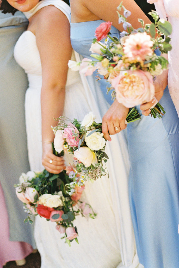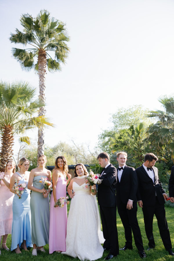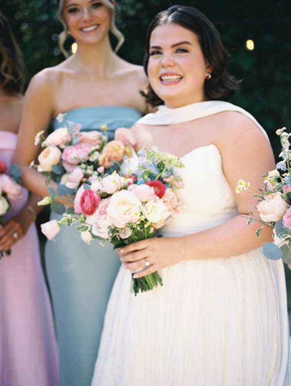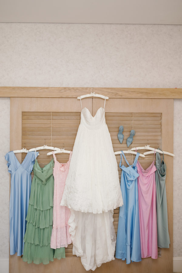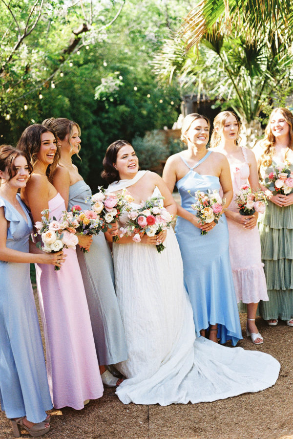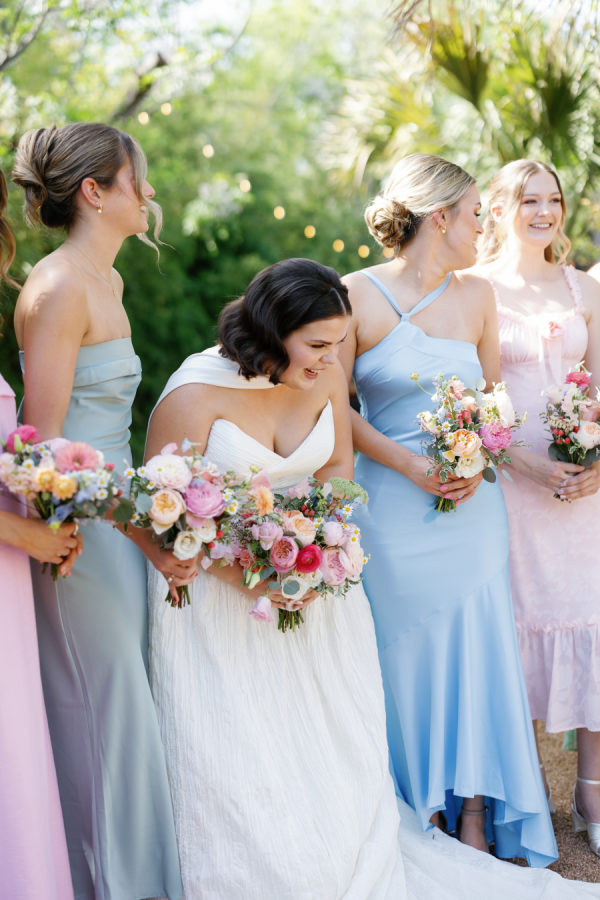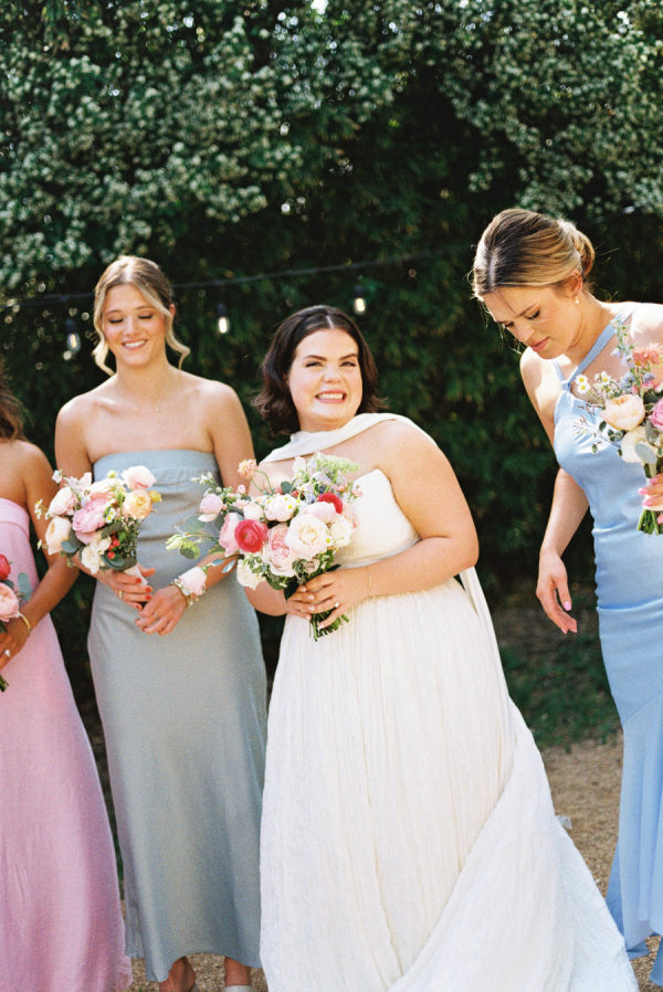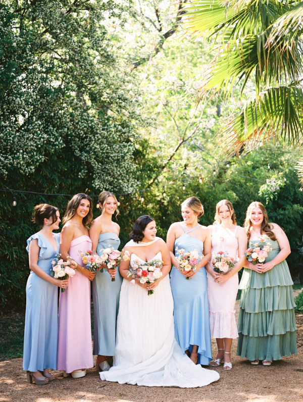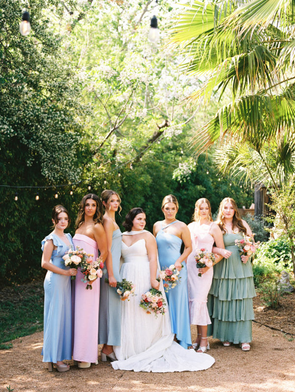 [field title=”Bridesmaid Dresses”]The bridesmaids wore a joyful mix of dresses in a range of pastel and jewel-toned hues—think soft blue, lavender, blush, and leafy green. Each dress had its own silhouette and texture, creating a perfectly un-matched look that felt playful, modern, and effortlessly cohesive. Their colorful styles added to the garden party feel and reflected the couple’s fun, personality-filled approach to the day.[/field]