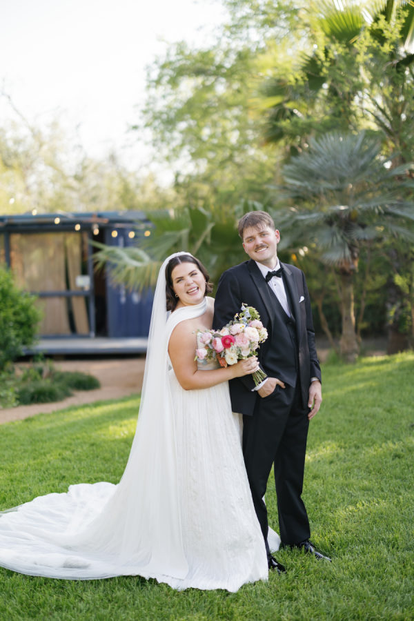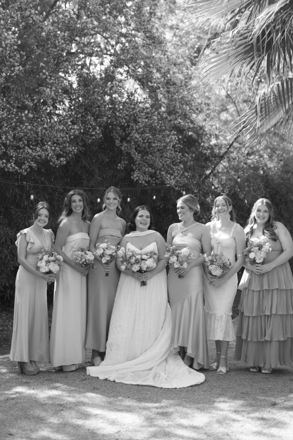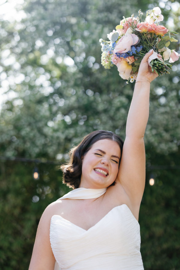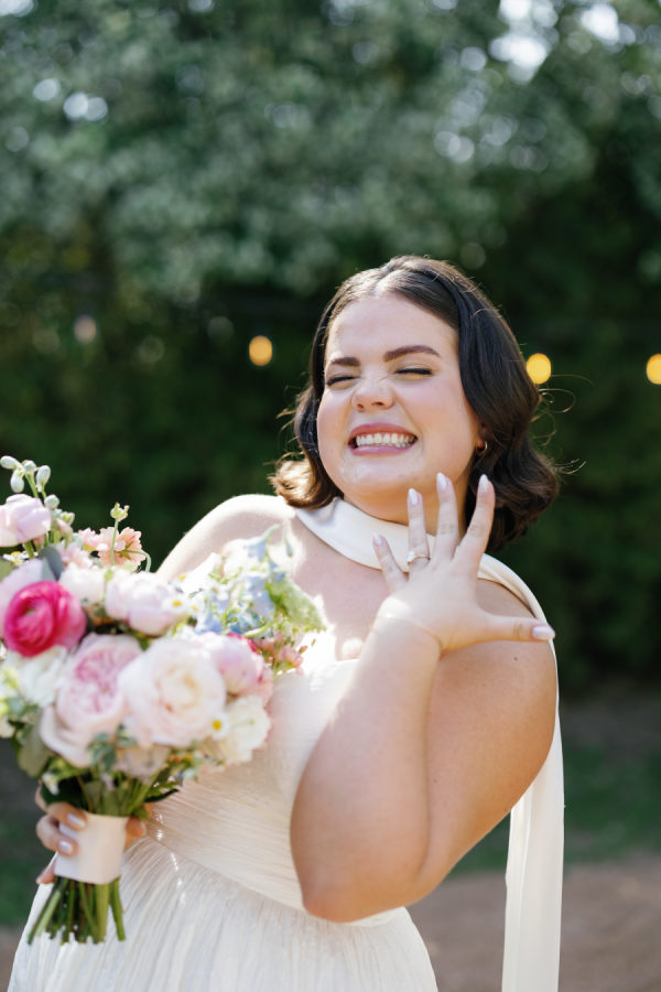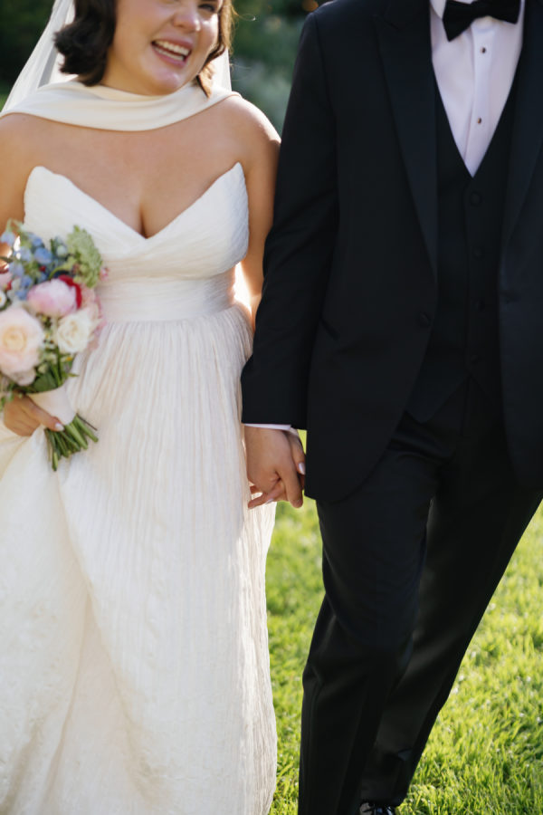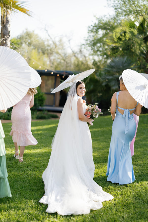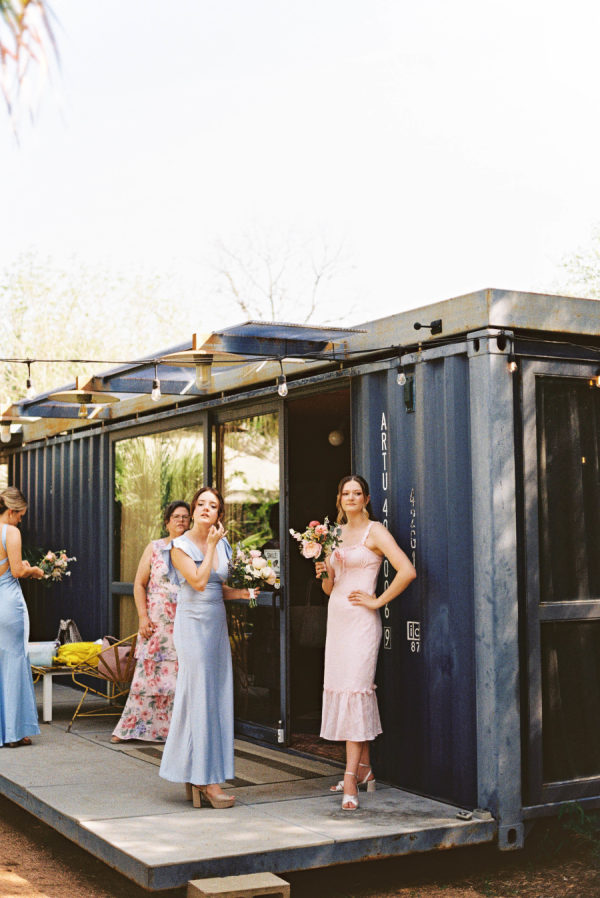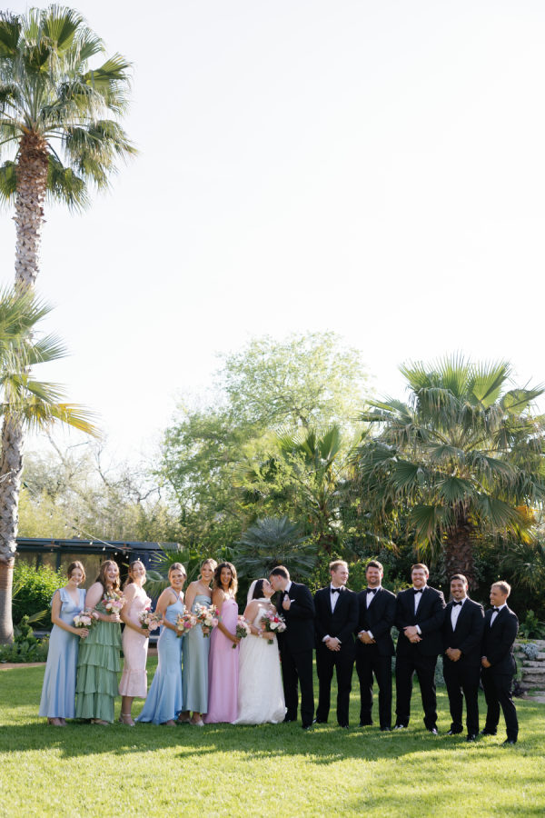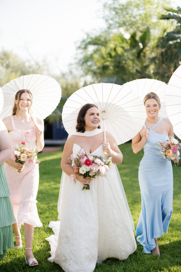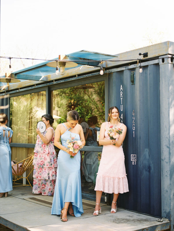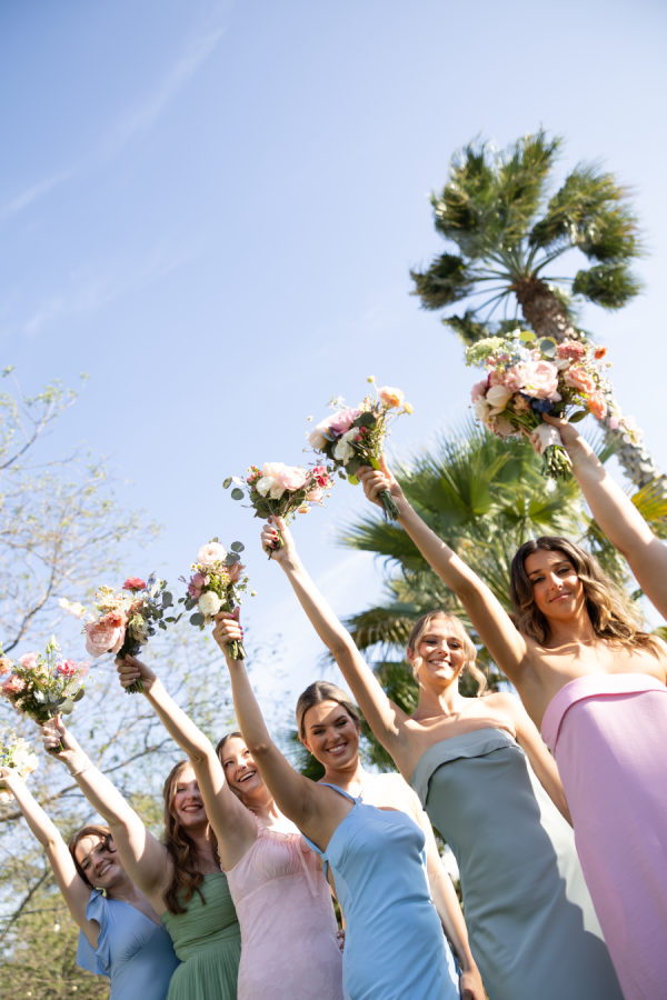[field title=”Bridesmaid Dresses”]The bridesmaids wore a joyful mix of dresses in a range of pastel and jewel-toned hues—think soft blue, lavender, blush, and leafy green. Each dress had its own silhouette and texture, creating a perfectly un-matched look that felt playful, modern, and effortlessly cohesive. Their colorful styles added to the garden party feel and reflected the couple’s fun, personality-filled approach to the day.[/field]