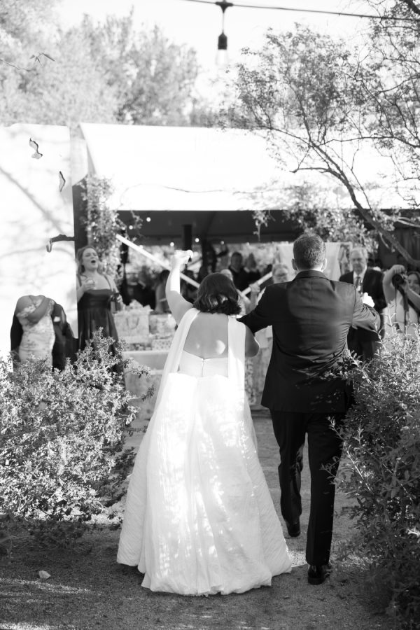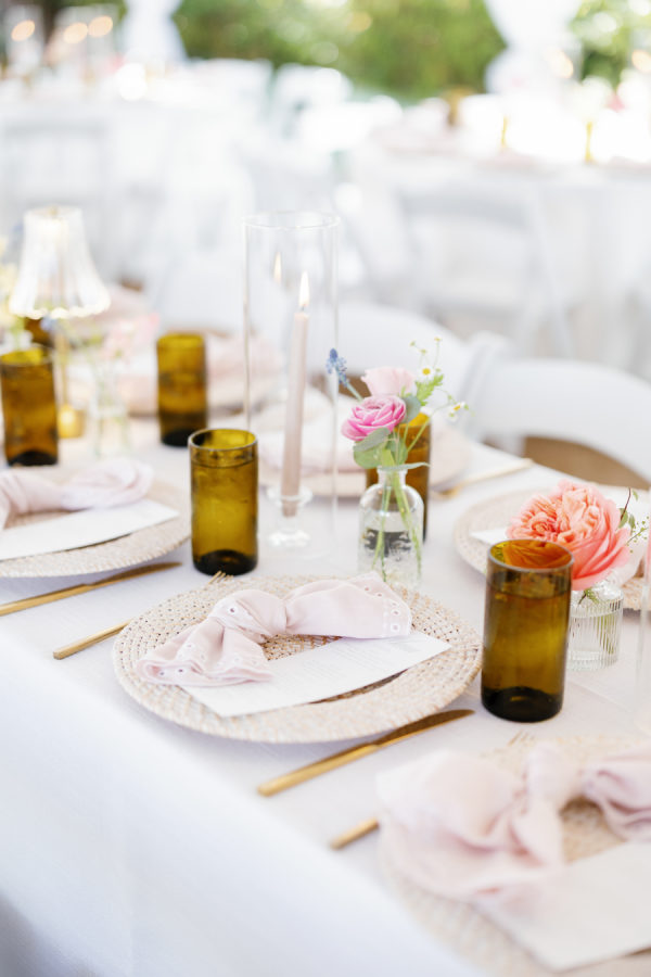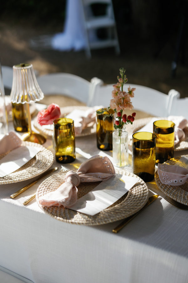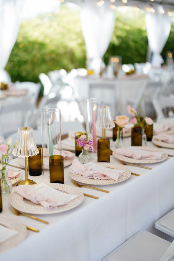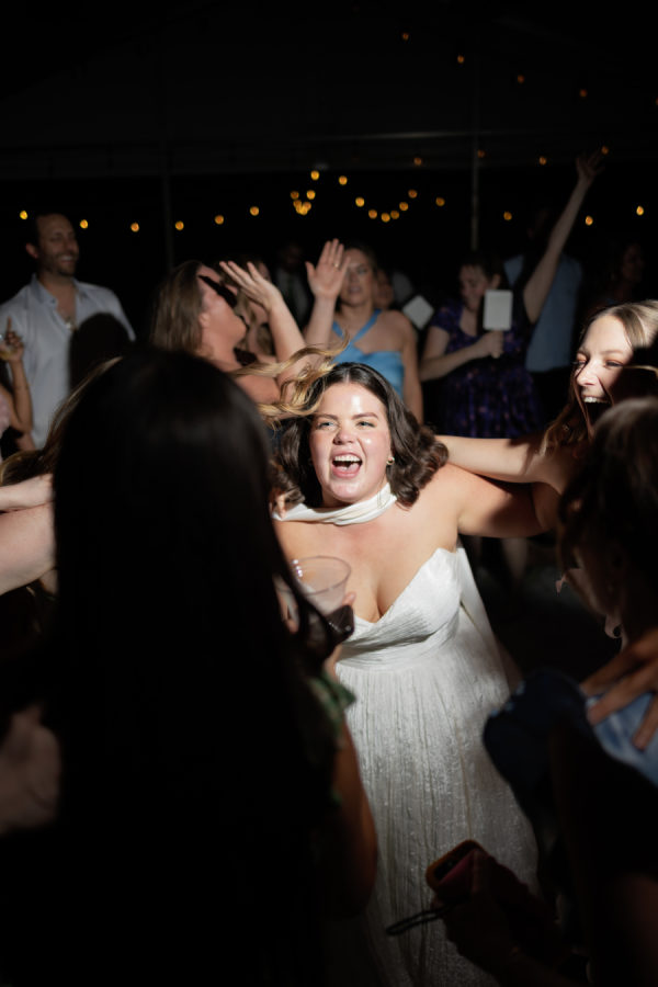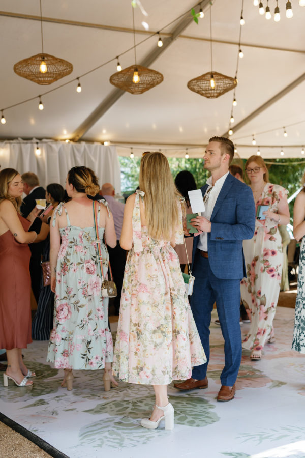 The overall design leaned into an elevated garden party aesthetic—effortlessly romantic with playful, modern touches. Tables were set with charming lamp-lit centerpieces, creating an intimate glow as the sun set. A custom floral dance floor served as a stunning focal point, blending beautifully with the lush blooms and natural surroundings. Every detail felt intentional yet relaxed, striking that perfect balance between whimsical charm and editorial sophistication.