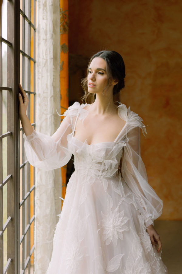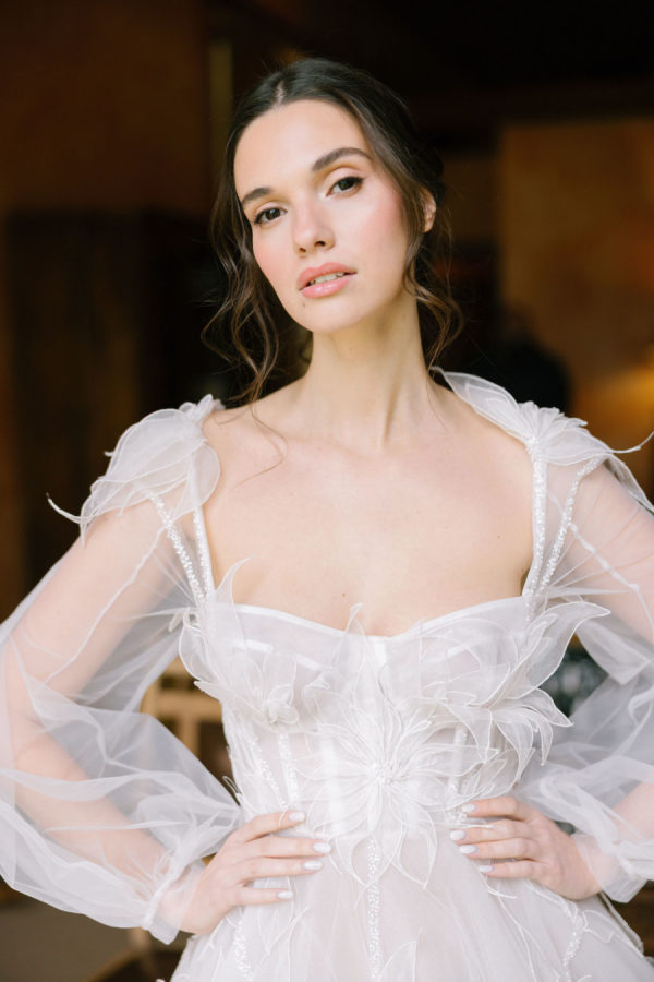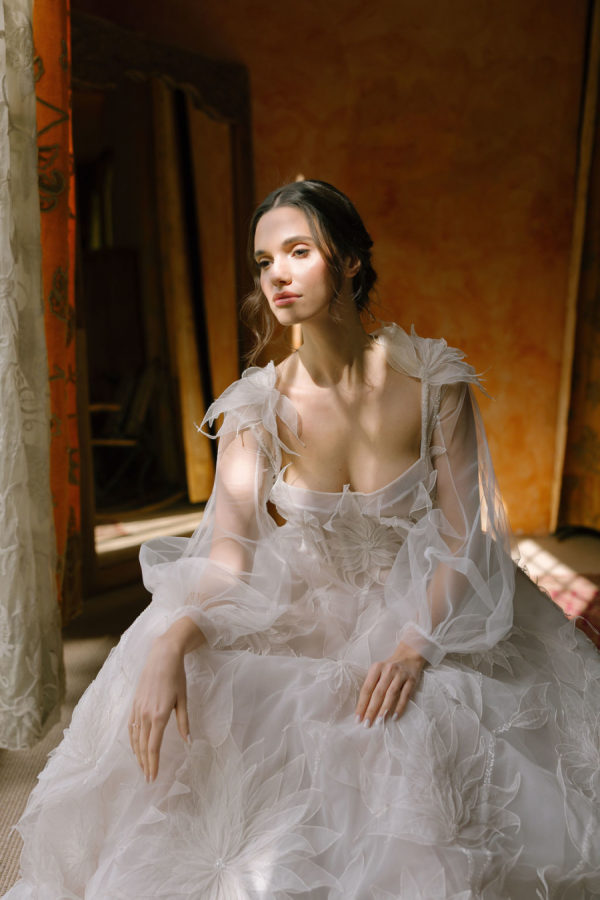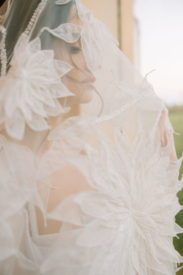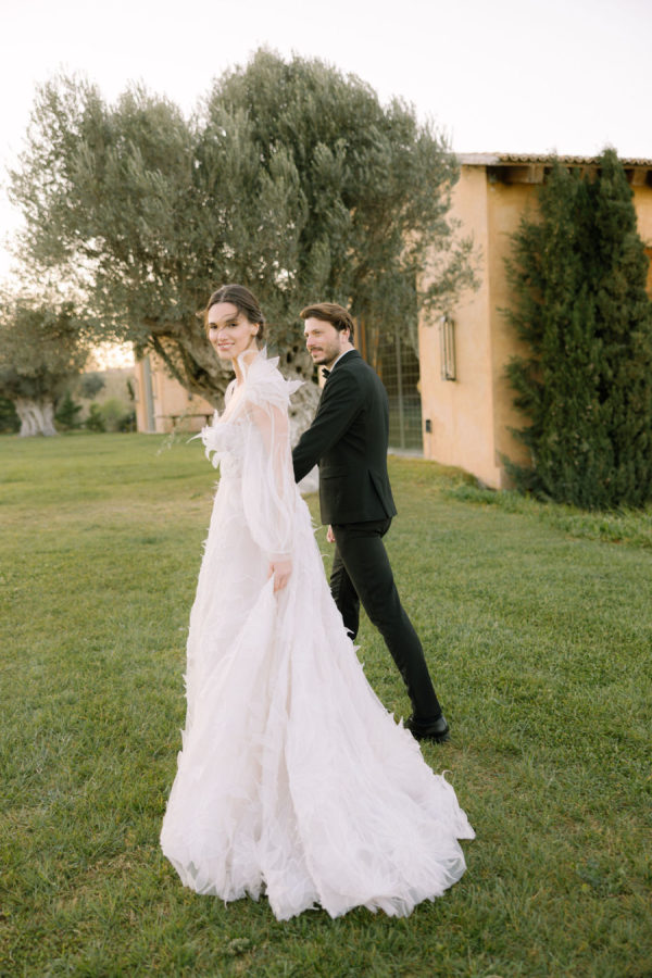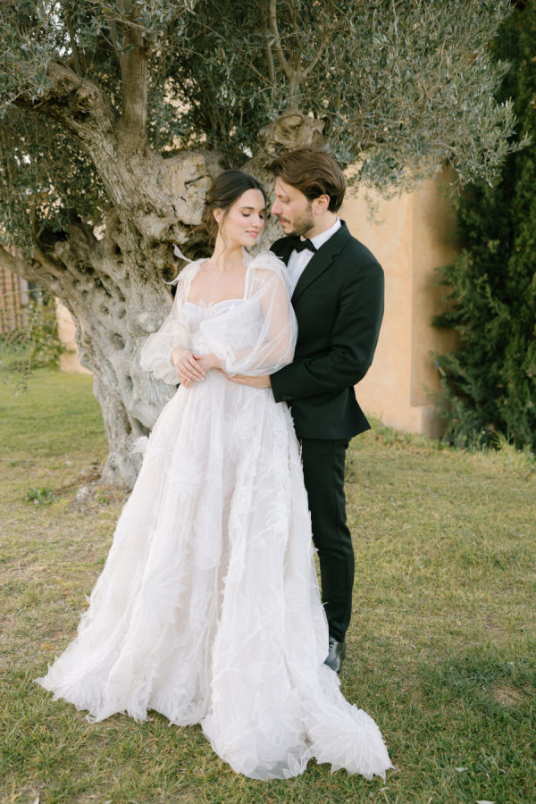 [field title=”Wedding Gown”]Fashion played an equally significant role in elevating the aesthetic. The bride wore a breathtaking high-fashion designer gown, embodying this year’s trend of bold floral embellishments. The voluminous blooms on her dress added an artistic and avant-garde touch, seamlessly blending with the organic surroundings. With its elegant silhouette and couture craftsmanship, the gown exuded both luxury and romance. The groom, maintaining a timeless appeal, opted for a classic black tie ensemble—chic, refined, and effortlessly sophisticated. His attire provided the perfect contrast to the ethereal bridal look, striking a balance between modern fashion and timeless elegance.