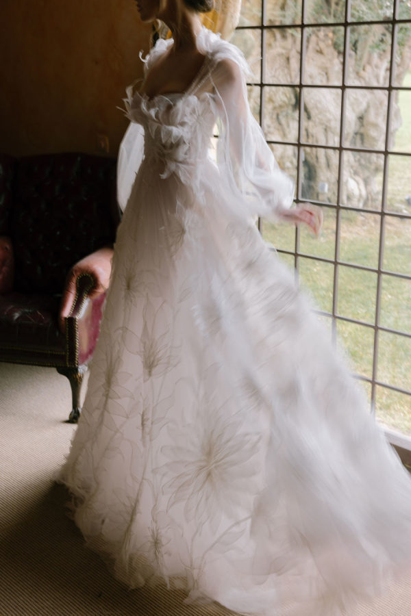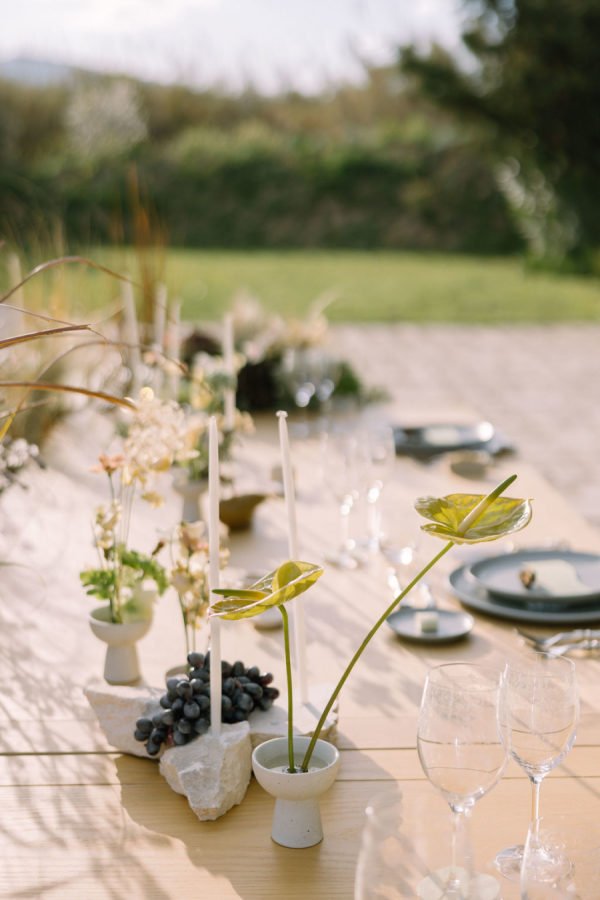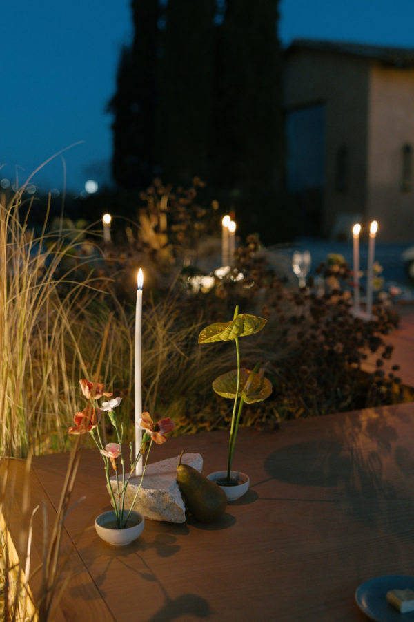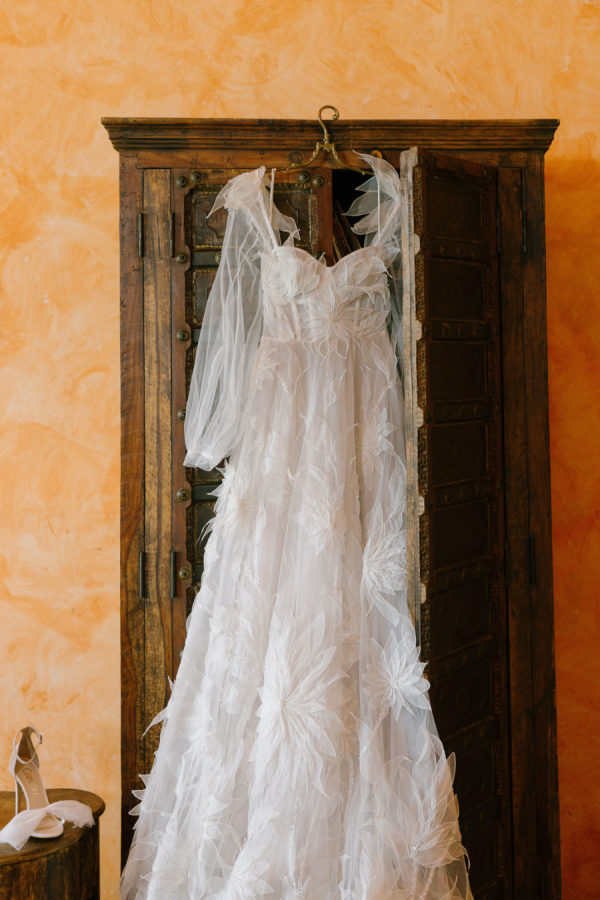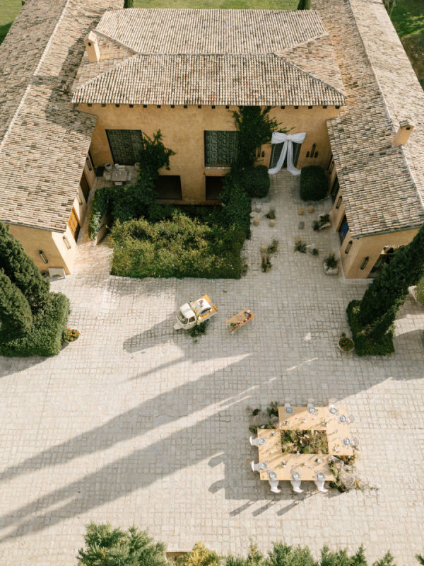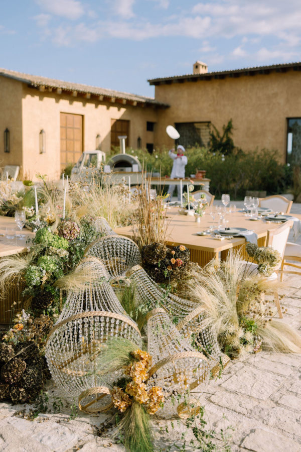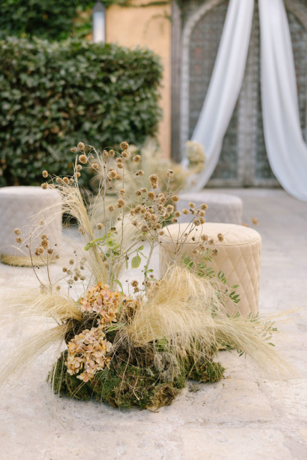 [field title=”Wedding Colors”]The floral design played a pivotal role in bringing this vision to life. We chose natural, organic flowers in a palette of earthy tones, soft blushes, and deep greens, adding a subtle yet dramatic touch to the setting. Inspired by Tuscany’s effortless charm, the ceremony space was adorned with “clouds” of delicate floral arrangements, carefully layered for depth and movement. Scattered stones, church-thin candles, and fresh fruits completed the aesthetic, evoking the romance of an old-world European celebration.[/field]