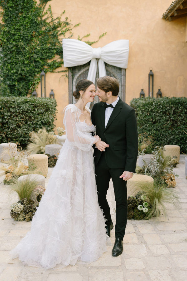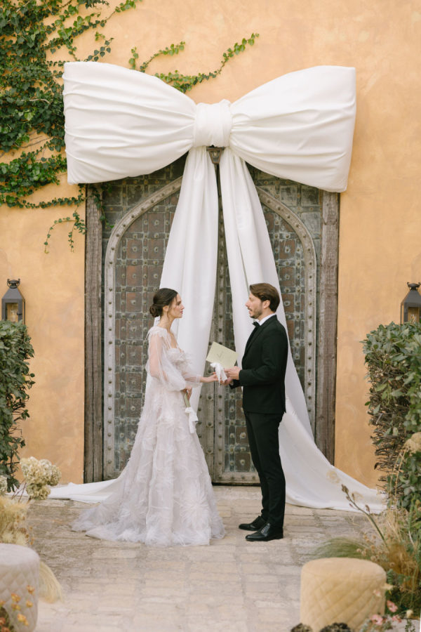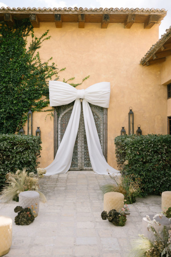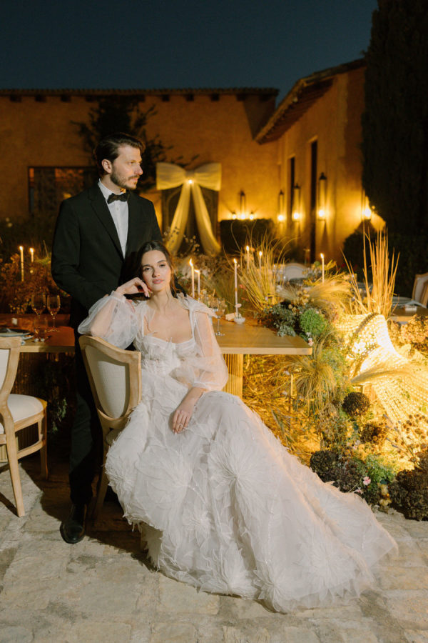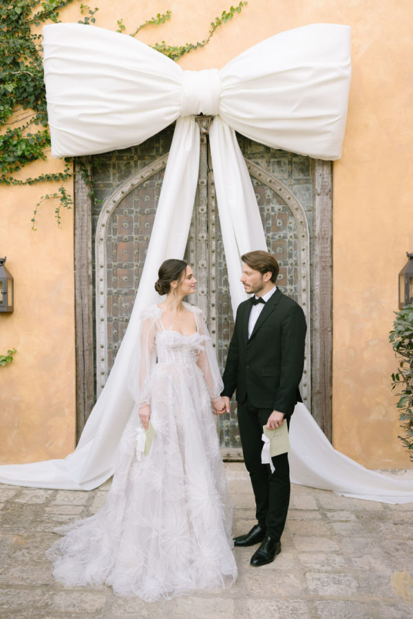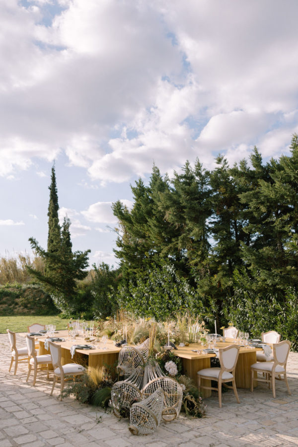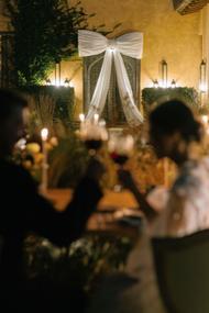 From floral arrangements inspired by the Mediterranean to exquisite organic Greek cuisine, every detail enhances the love story of each couple. Inspired by the timeless elegance of the venue and the growing trend of statement bows in weddings, Vicky Galata Weddings & Events envisioned a luxury organic theme where nature and refined design harmonize. At the heart of the ceremony space, a grand sculptural bow served as a breathtaking focal point, symbolizing unity and grace. Crafted from flowing, sustainable fabrics in soft neutral tones, it complemented the natural surroundings while making a bold statement. Vicky Galata, the wedding planner, created a breathtaking focal point with a grand, oversized bow, symbolizing elegance and unity, placed as the centerpiece of the space. Surrounding the bow, she arranged luxurious velvet stools for seating, offering a comfortable yet chic touch for guests. To add an ethereal quality, she incorporated “clouds” of flower arrangements, soft and delicate, creating a dreamy atmosphere for the couple to exchange vows. The combination of these elements sets the stage for a romantic and unforgettable ceremony, where every detail speaks to beauty and love. The couple and their guests enjoyed an exquisite fine dining experience, set beneath a canopy of soft candlelight and stunning chandeliers suspended low over the floor. The ambiance was both romantic and dramatic, with the flicker of candle flames casting a warm glow over the elegant table settings. Wine flowed freely, complementing the delicious meal, while music played loudly, adding energy and vibrancy to the evening. The atmosphere was electric yet intimate, perfectly capturing the spirit of celebration and love.