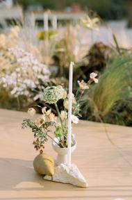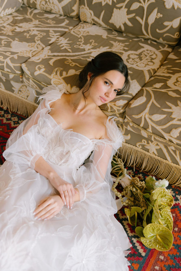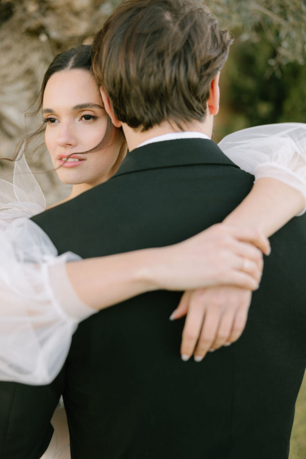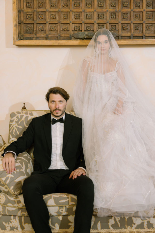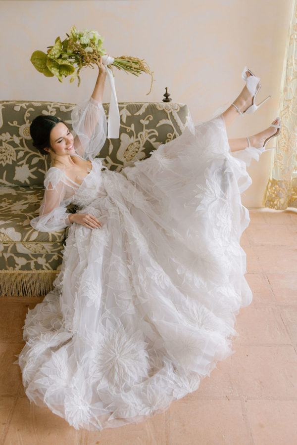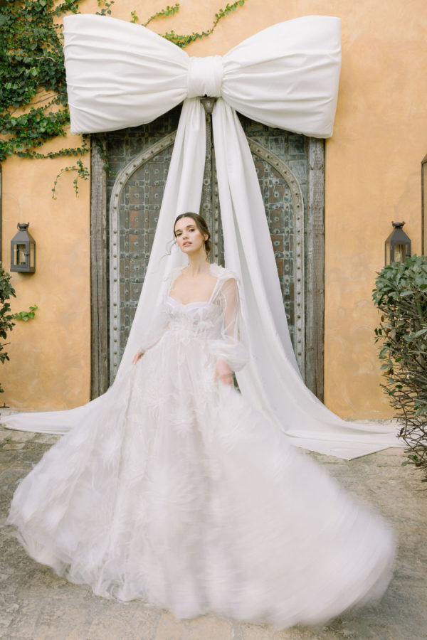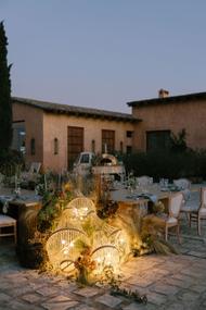From floral arrangements inspired by the Mediterranean to exquisite organic Greek cuisine, every detail enhances the love story of each couple. Inspired by the timeless elegance of the venue and the growing trend of statement bows in weddings, Vicky Galata Weddings & Events envisioned a luxury organic theme where nature and refined design harmonize. At the heart of the ceremony space, a grand sculptural bow served as a breathtaking focal point, symbolizing unity and grace. Crafted from flowing, sustainable fabrics in soft neutral tones, it complemented the natural surroundings while making a bold statement. Vicky Galata, the wedding planner, created a breathtaking focal point with a grand, oversized bow, symbolizing elegance and unity, placed as the centerpiece of the space. Surrounding the bow, she arranged luxurious velvet stools for seating, offering a comfortable yet chic touch for guests. To add an ethereal quality, she incorporated “clouds” of flower arrangements, soft and delicate, creating a dreamy atmosphere for the couple to exchange vows. The combination of these elements sets the stage for a romantic and unforgettable ceremony, where every detail speaks to beauty and love. The couple and their guests enjoyed an exquisite fine dining experience, set beneath a canopy of soft candlelight and stunning chandeliers suspended low over the floor. The ambiance was both romantic and dramatic, with the flicker of candle flames casting a warm glow over the elegant table settings. Wine flowed freely, complementing the delicious meal, while music played loudly, adding energy and vibrancy to the evening. The atmosphere was electric yet intimate, perfectly capturing the spirit of celebration and love.