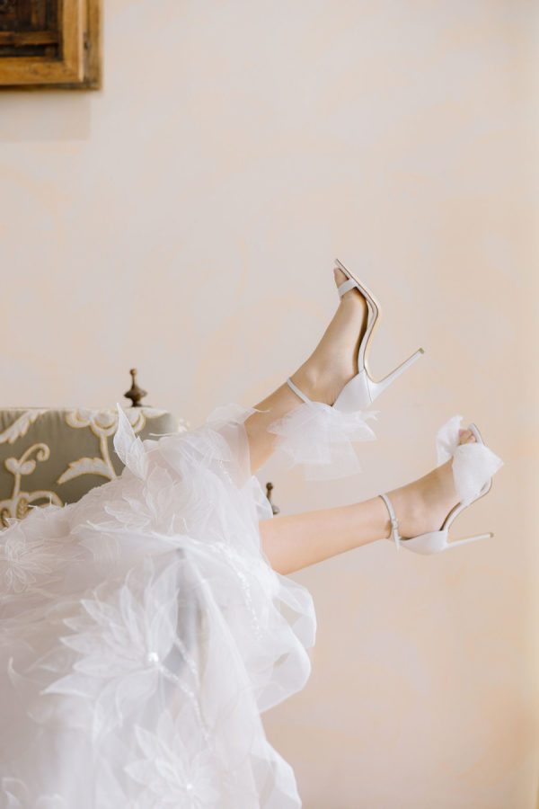 Custom-made white leather shoes featured oversized bows on each shoe, designed to complement the main bow of the ceremony outfit. The bows were elegant and bold, matching the style and fabric of the ceremony’s key bow, creating a cohesive and refined look. Perfect for adding a personalized, sophisticated touch to any formal event.