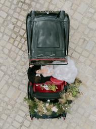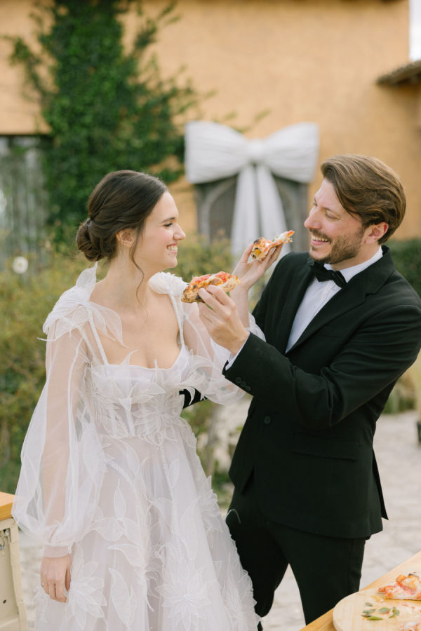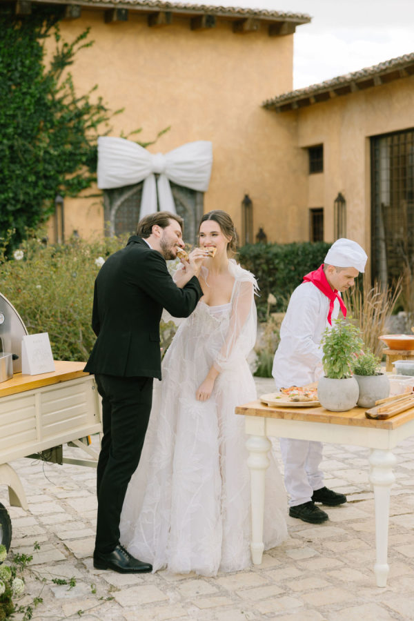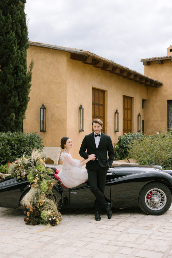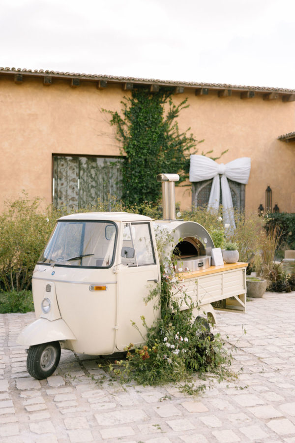 For a truly unique touch at the wedding, we introduced a live pizza truck that became an unforgettable part of the experience. The truck, stationed in a prime location, was not just a food station—it was an experience in itself. Throughout the day, guests watched as skilled chefs prepared fresh, artisanal pizzas right before their eyes, offering a deliciously interactive and engaging dining experience. This vintage Triumph, adorned with cascading blooms, exudes the effortless romance inspired by the Tuscan countryside. The florals draped over the car’s elegant curves creating a dreamlike entrance for the couple. The blend of old-world charm and nature’s organic beauty evokes a timeless, whimsical atmosphere—one of leisurely drives through sun-drenched roads carrying the scent of wildflowers, and love stories written in the heart of Greece. It’s a vision of rustic elegance and poetic nostalgia, setting the perfect tone for a celebration as enchanting as the landscape that inspired it.