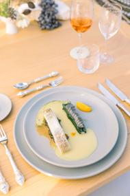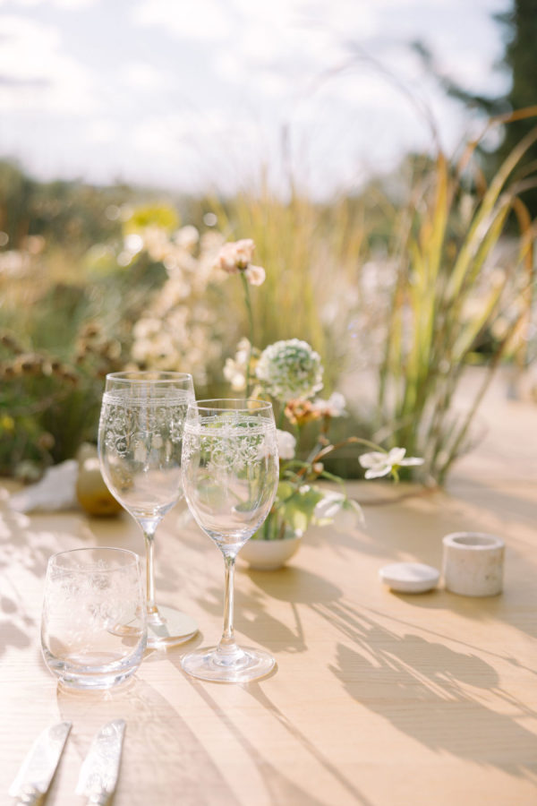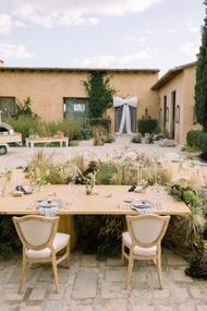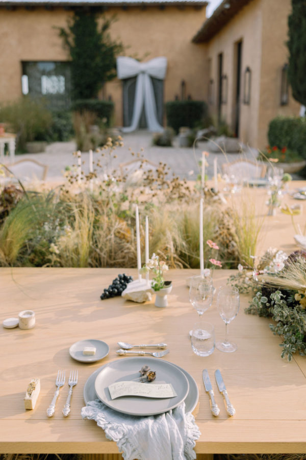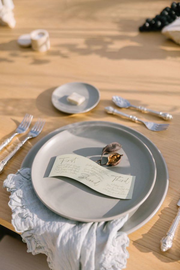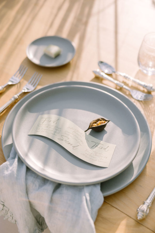 This tablescape embodies an elegant green sage monochromatic theme, exuding a refined yet organic charm. The table setting is grounded in soft sage hues, layered with natural textures and vintage details that create a timeless and harmonious aesthetic.The vintage silver flatware introduces an element of old-world sophistication, enhancing the overall nostalgic appeal. Complementing this, the laced glassware adds delicate intricacy, refracting light beautifully to elevate the table’s elegance. Thoughtfully chosen natural favors, such as artisanal floral-infused soaps, reinforce the organic, sensory experience of the evening. Meanwhile, marble travertine from Italy, subtly embedded with salt details for the dinner, provides a textural and culinary delight, merging aesthetics with function. A striking design feature, the serpentine-shaped menus, gracefully winding along the table, introduce a fluid, artistic element, breaking away from traditional rigid layouts. To personalize the setting further, name tags affixed to the base of wine glasses offer a stylish and unexpected detail, ensuring each guest feels considered. Altogether, this composition achieves a captivating balance between vintage refinement and modern organic elegance, making the tablescape not just a setting but a statement.