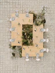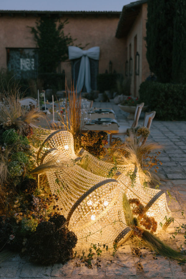 The reception design embraced an unconventional and artistic approach, featuring a uniquely shaped table arrangement. The open rectangular layout encouraged intimacy while drawing the eye toward the breathtaking floral installation at its center—designed to resemble a lush, growing garden. Wild greenery, delicate blooms, and organic textures blended effortlessly, bringing nature to the heart of the celebration. Chandeliers, instead of hanging overhead, were elegantly placed on the floor, casting a soft, golden glow that enhanced the ethereal ambiance. The juxtaposition of refined elegance with raw, organic elements created a striking yet harmonious balance, perfect for a luxury wedding infused with natural beauty.