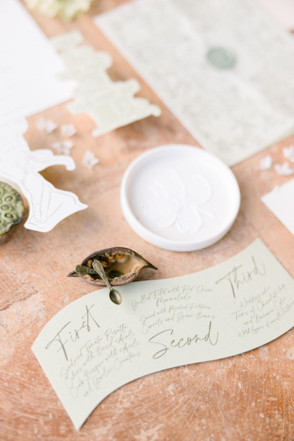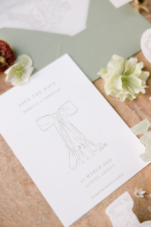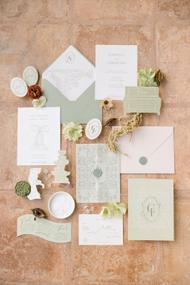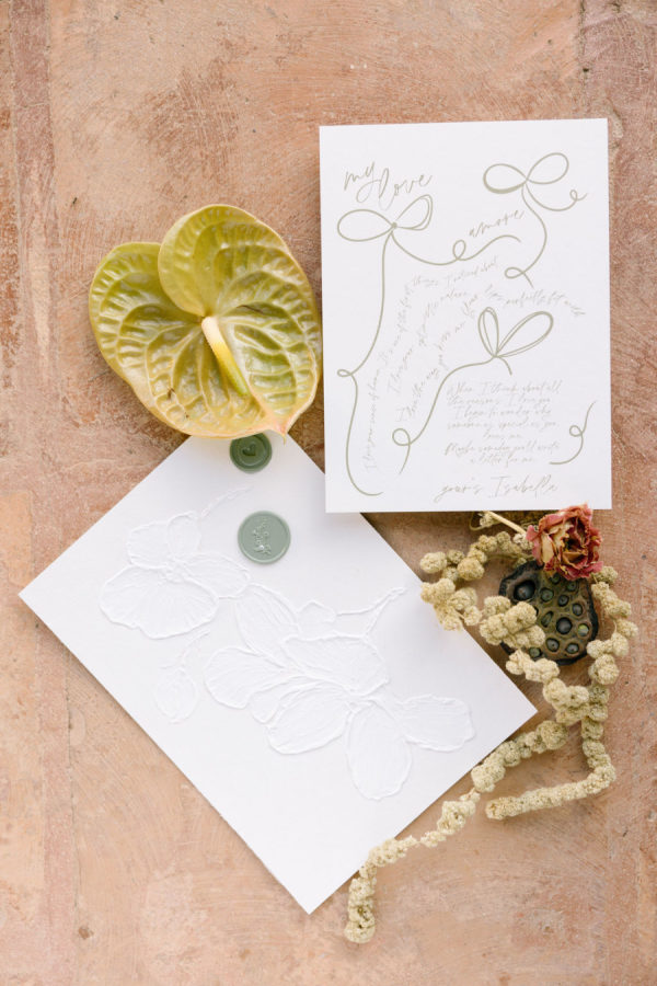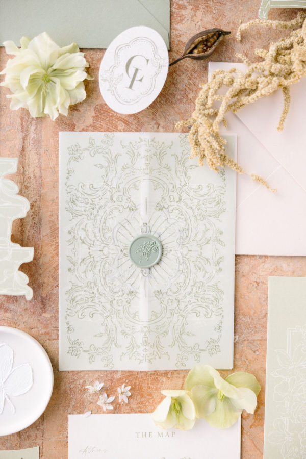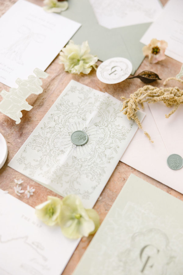 [field title=”Tips To Pull Off The Look”]The stationery perfectly reflected the event’s elegant and romantic aesthetic. Designed in soft sage green and ivory, it featured hand-drawn illustrations, delicate script, and embossed details. A grand bow motif tied into the wedding’s theme, while wax seals, filigree patterns, and custom venue sketches added a personal touch. Floral accents and natural elements enhanced the presentation, mirroring the ceremony’s dreamy ambiance. Thoughtfully curated, the suite set the tone for a celebration of timeless beauty.[/field]
