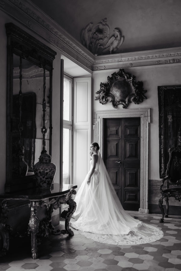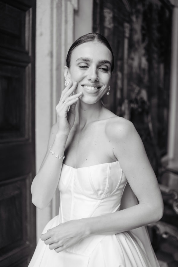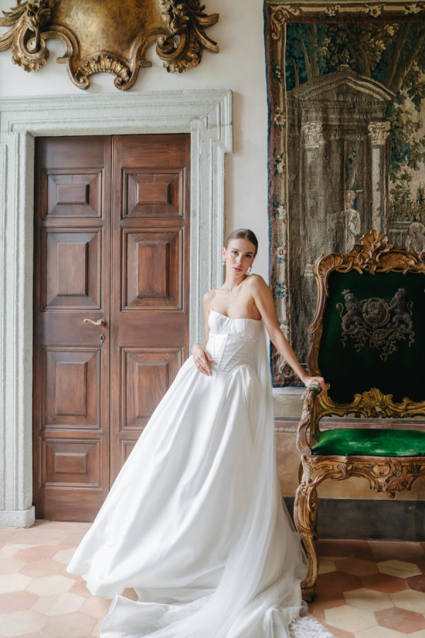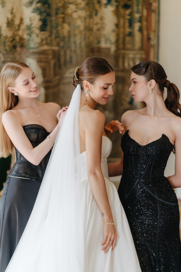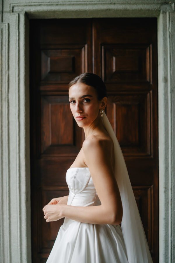 [field title=”Wedding Gown”]The bride chose a structured princess gown by Wona Concept, embodying modern elegance with clean lines and a timeless silhouette. The fabric offered just the right amount of volume and architectural presence, making it ideal for a bride seeking sophistication without excessive embellishment. Its contemporary cut allowed her to feel poised and confident throughout the day, from the ceremony to the lakeside portraits.[/field]