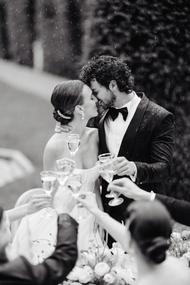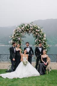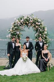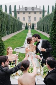 The vision for this celebration was to bring to life the timeless elegance of a micro wedding on Lake Como. The creative direction embraced a minimalist yet refined approach, opting for a monochrome palette that would elevate the natural beauty of the venue. The floral arrangements featured green and white tones, while the couple and their guests wore classic black and white attire, creating a harmonious and sophisticated atmosphere. Though the day ended under the soft patter of rain, the warm climate allowed for an unforgettable boat tour across the lake and a joyful outdoor apéritif—a moment of pure Italian romance.
