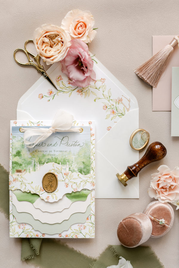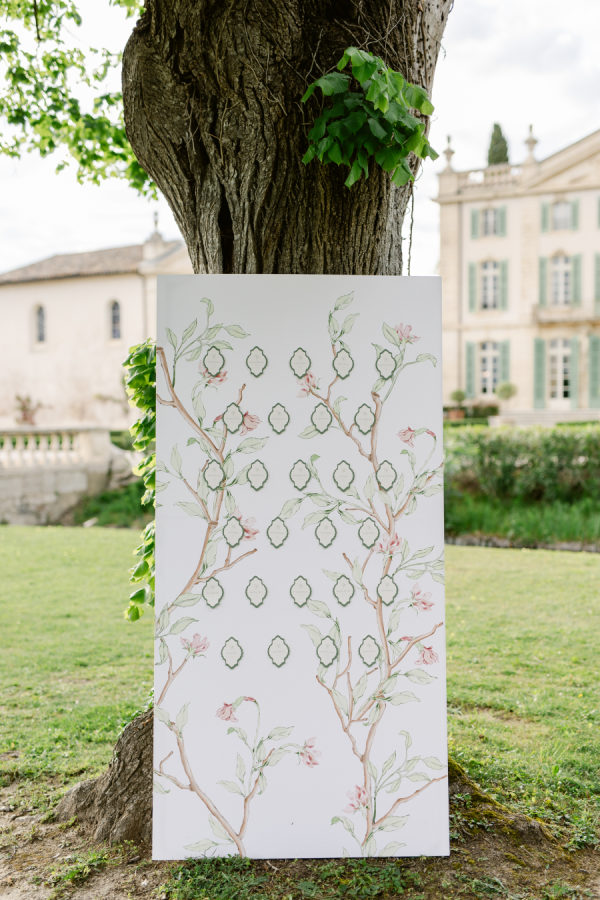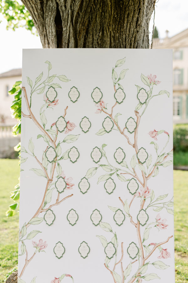The chosen palette was a delicate mix of blush pink, ivory, soft lavender, and hints of sage green. These colors were carefully selected to complement the timeless architecture of Château de Tourreau and the lush greenery of its gardens. The floral designs were a harmonious blend of roses, peonies, and hydrangeas in soft pastel tones, contrasted with rich foliage for added depth. This gentle palette contributed to the dreamy and romantic atmosphere of the entire event.