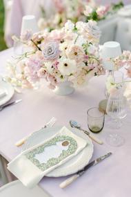 Floral design played a central role in elevating the ambiance of the event. Lush arrangements of peonies, roses, hydrangeas, and delphiniums in soft pastel shades framed each setting, from the ceremony aisle to the reception tables. The design concept focused on creating a flow of natural elegance, with floral installations cascading onto tables and intertwining with chandeliers. The reception area, styled with white and blush linens, was adorned with crystal chandeliers and luxurious tableware, capturing the essence of refined French luxury.