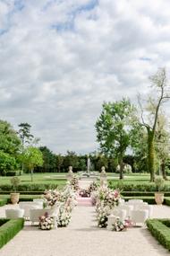 Château de Tourreau, located in the heart of Provence, is the epitome of French elegance. Its grand façade, adorned with pastel green shutters and stone-carved details, sets the perfect backdrop for a luxury wedding. The expansive gardens, featuring manicured pathways, fountains, and symmetrical hedges, add to the sense of grandeur. For this editorial, the ceremony was beautifully staged in the gardens, with a floral arch and a chic seating arrangement that seamlessly blended with the estate’s timeless beauty.