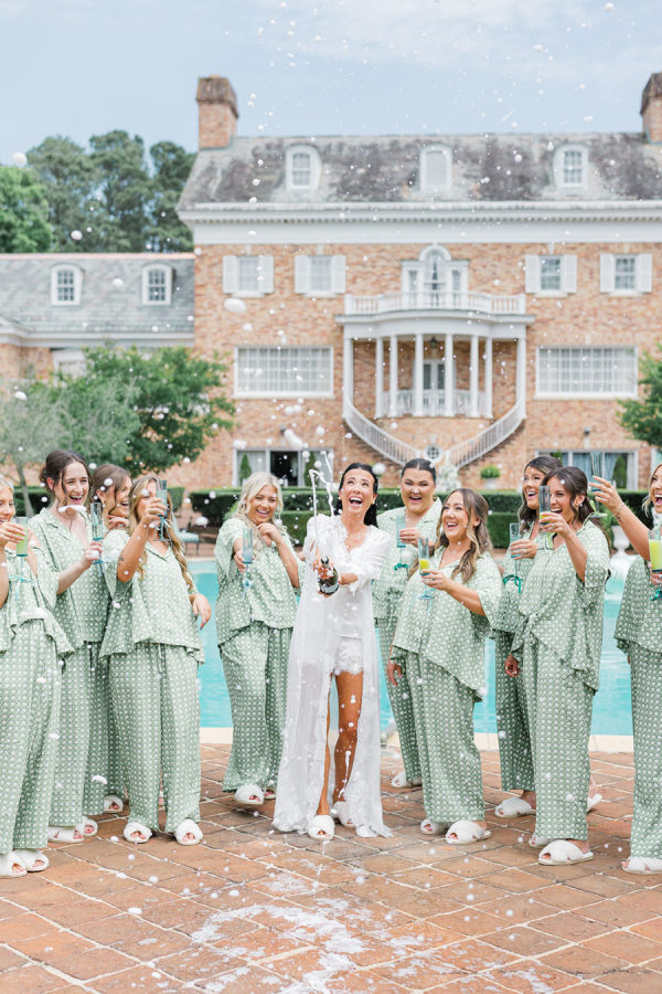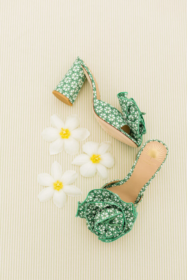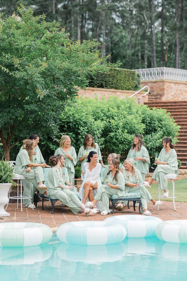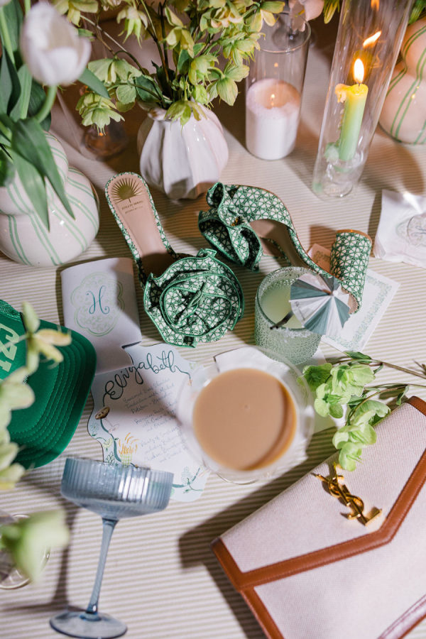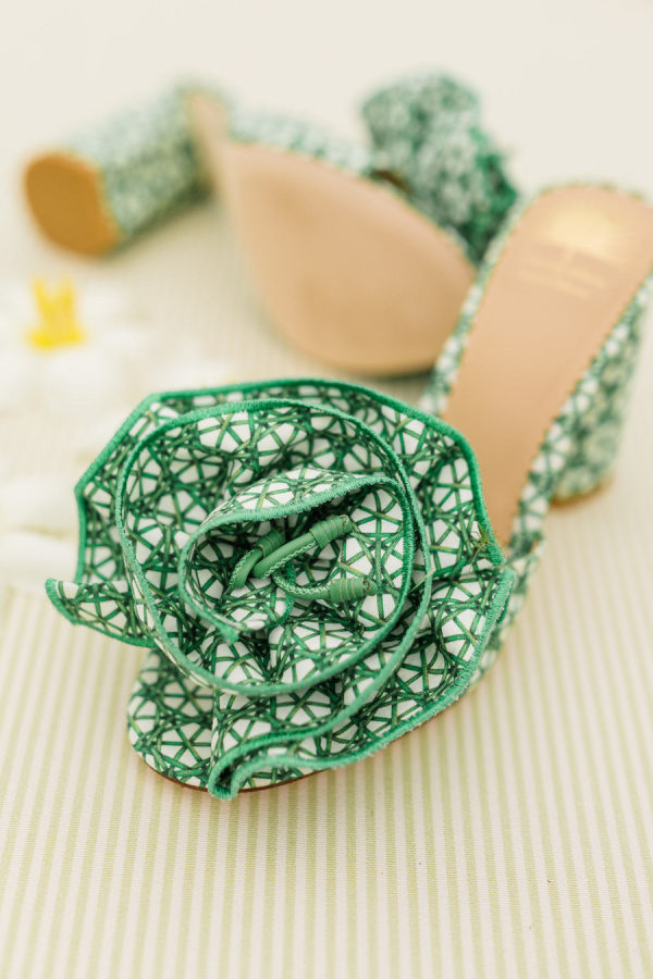 The light blue bridesmaids’ dresses from Bella Bridesmaids were the perfect shade of blue to complement the wedding color palette. Elizabeth also selected bridesmaids’ PJs to get ready in that perfectly matched the design of her wedding shoes with a bold green lattice design.
