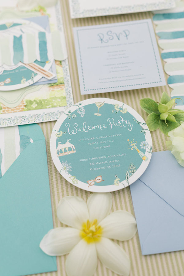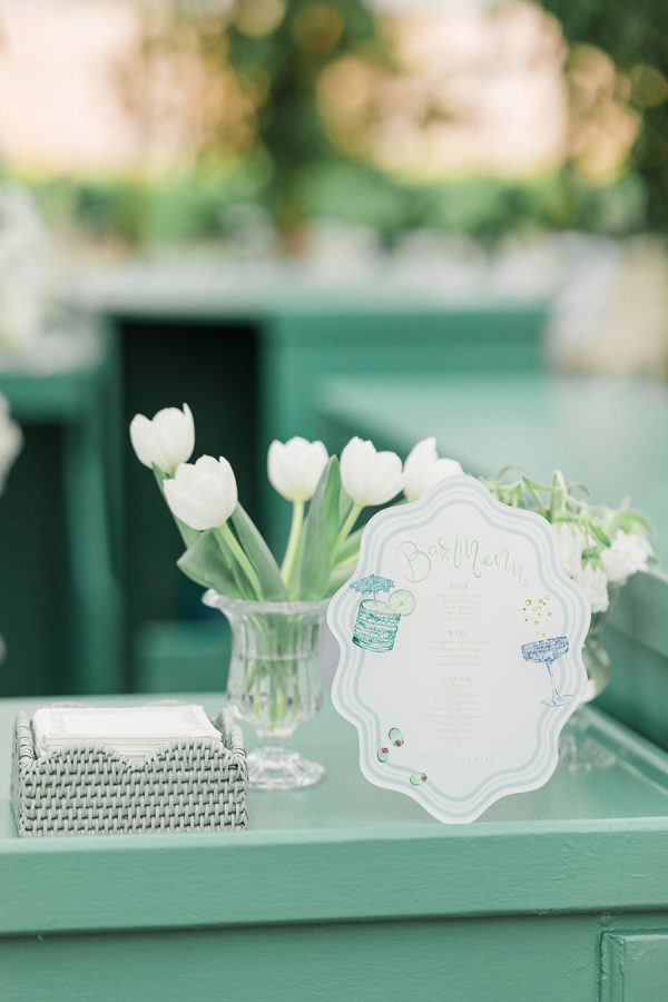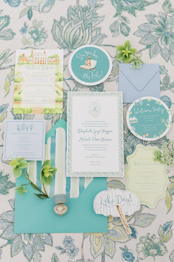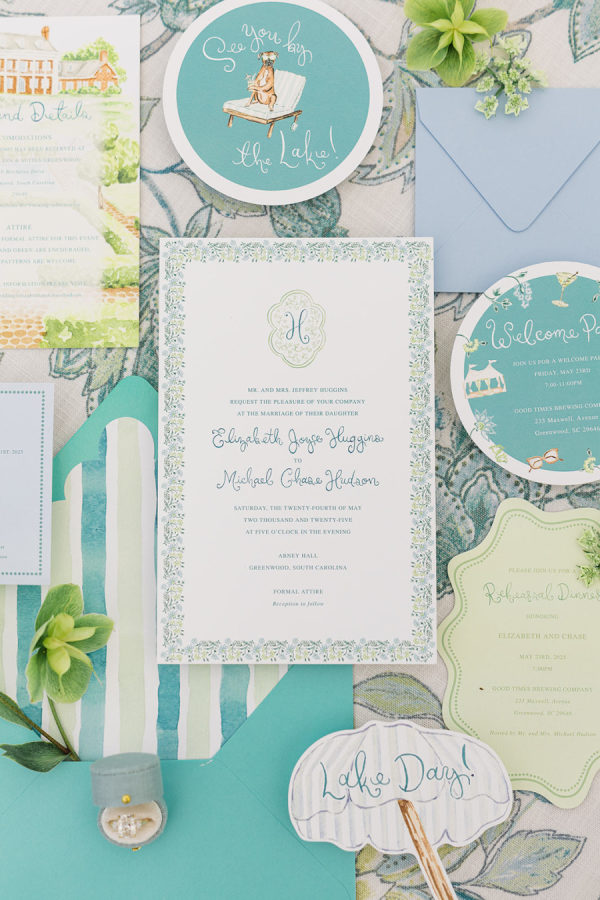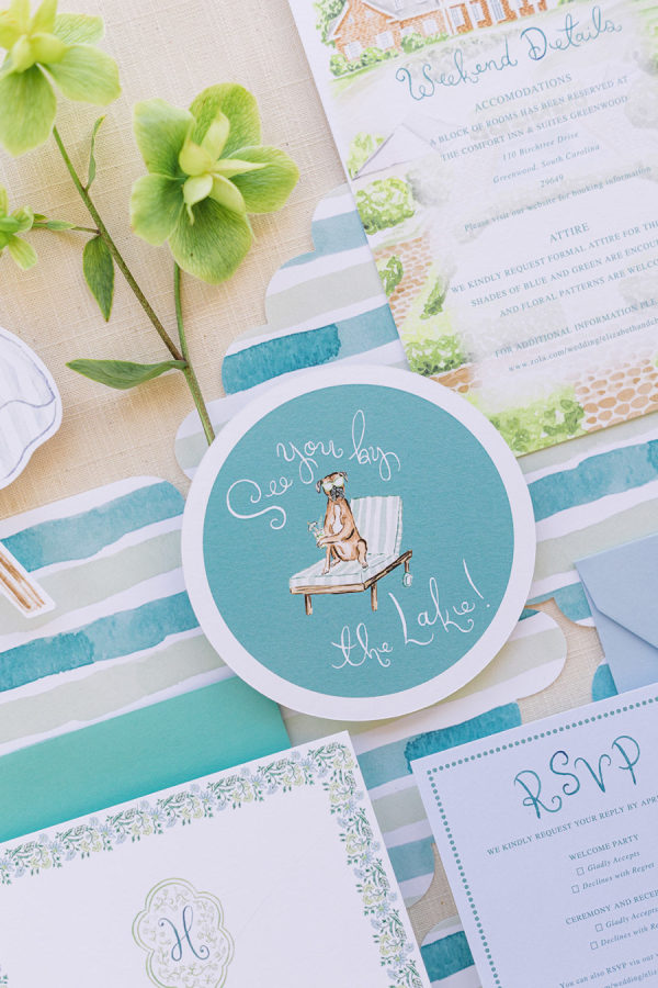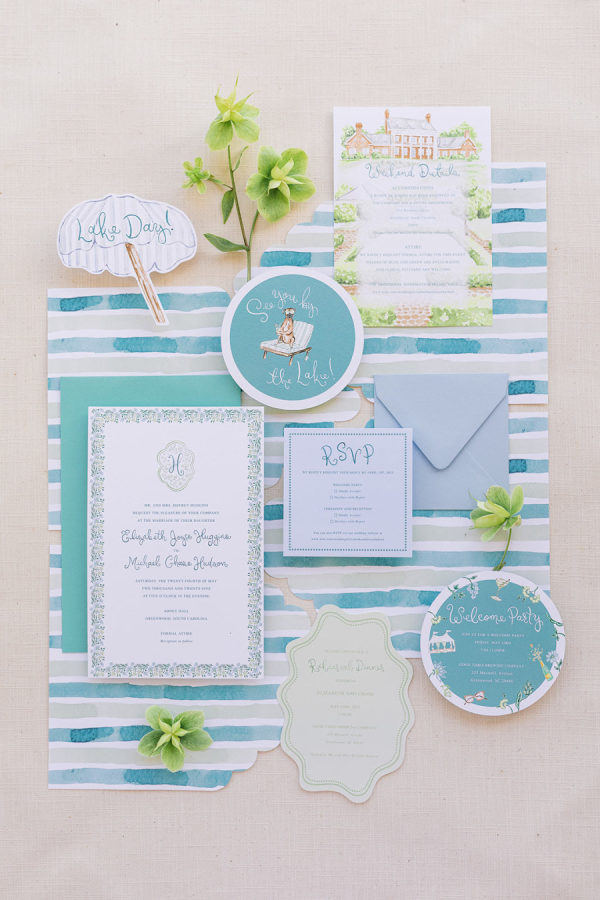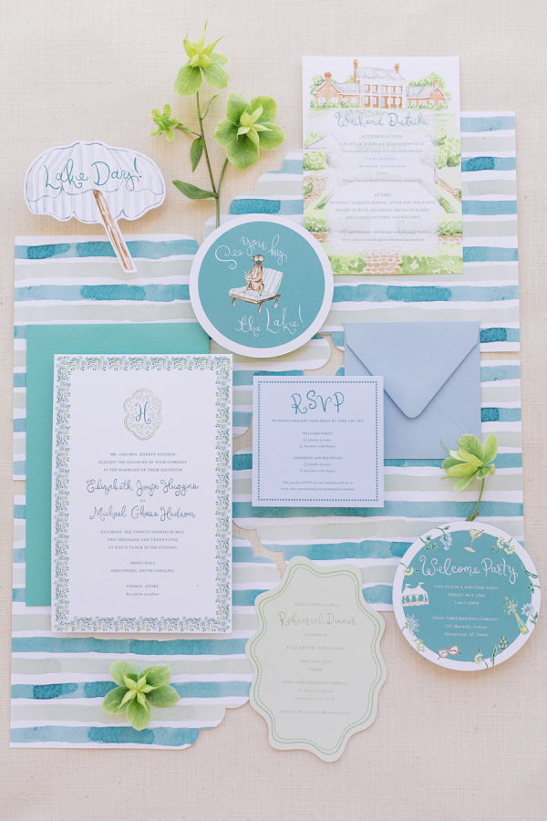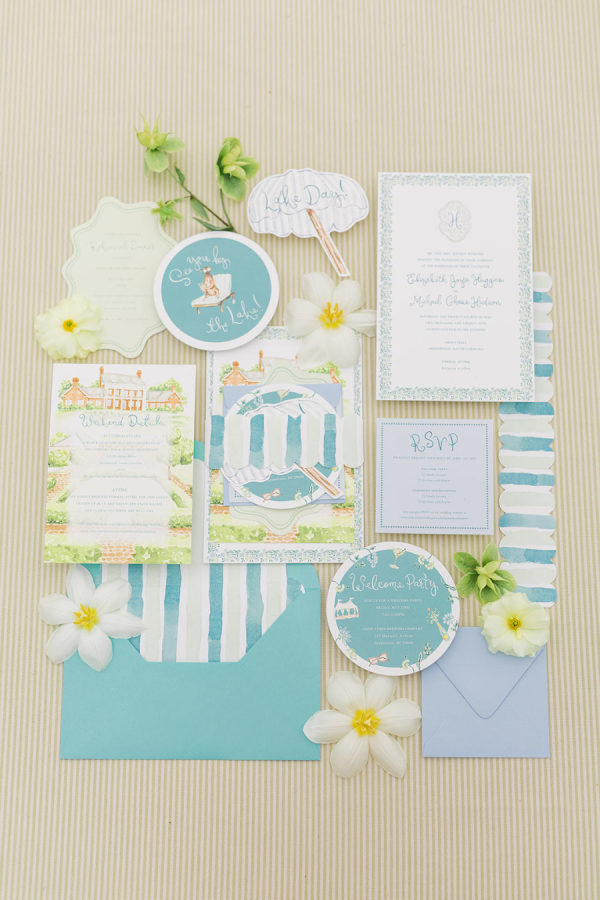 One of our favorite aspects of Elizabeth’s wedding was her curated stationery. Her custom scallop menu cards with watercolor-scripted names at the top were one of a kind. And her umbrella Lake Day invitation, combined with vibrant invitation suite elements, set the tone for the whole weekend.