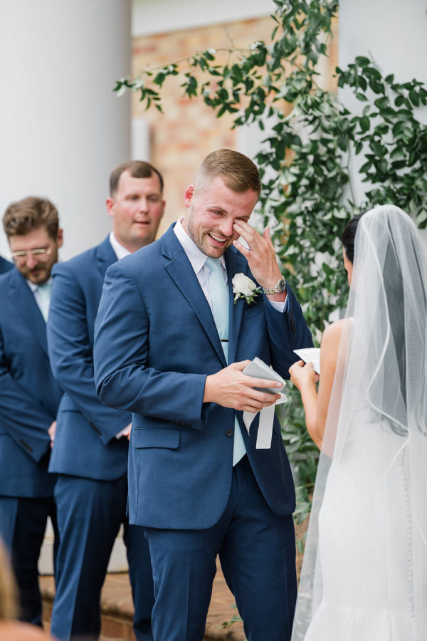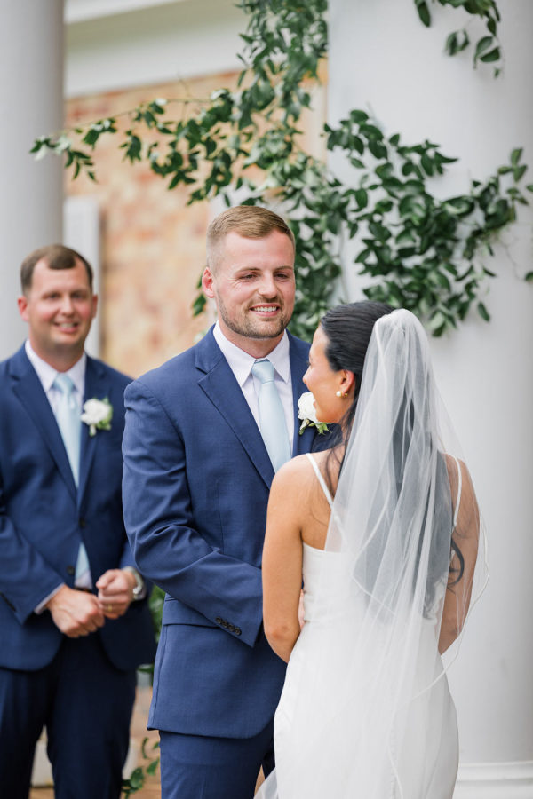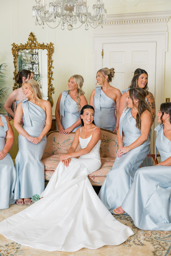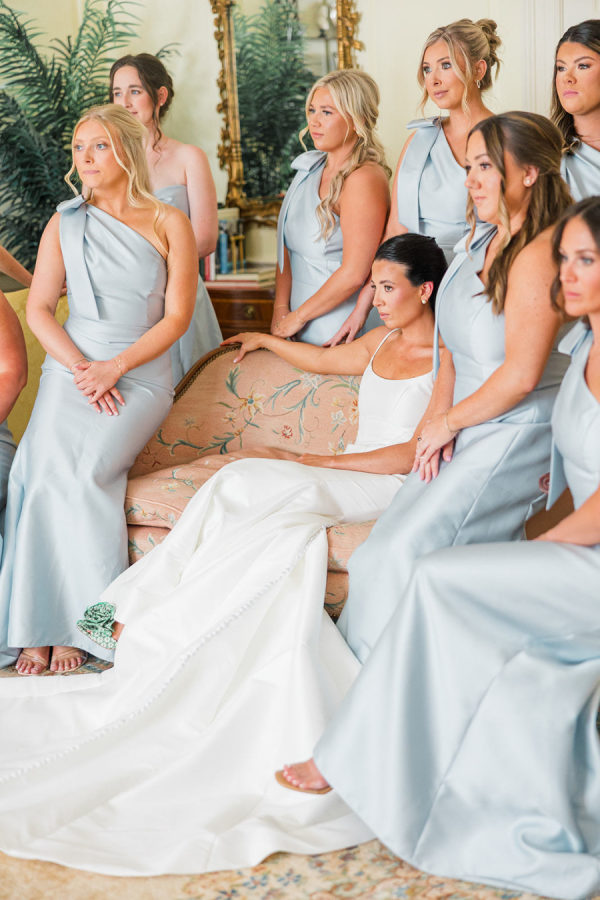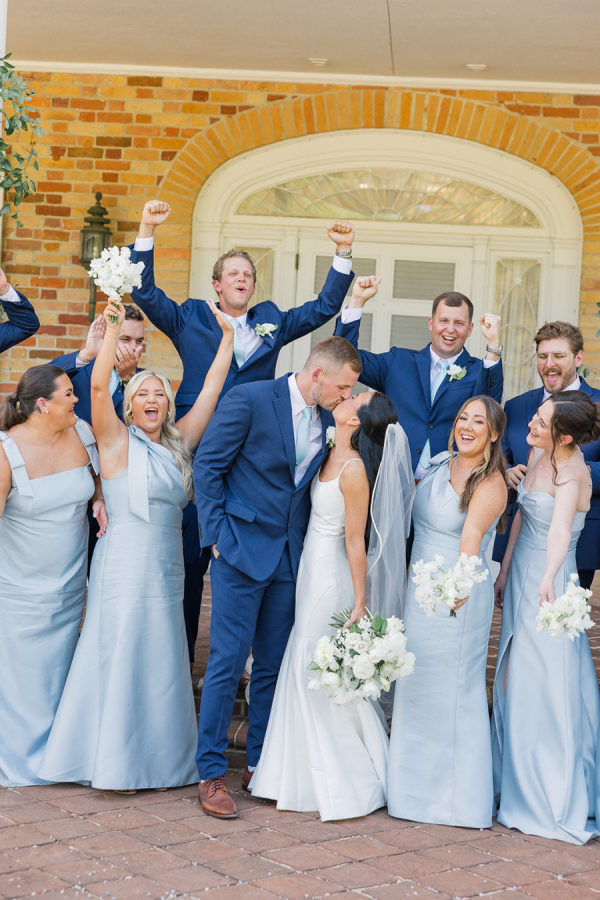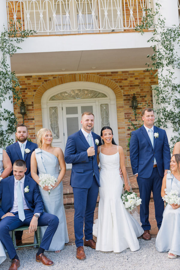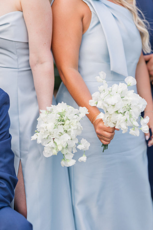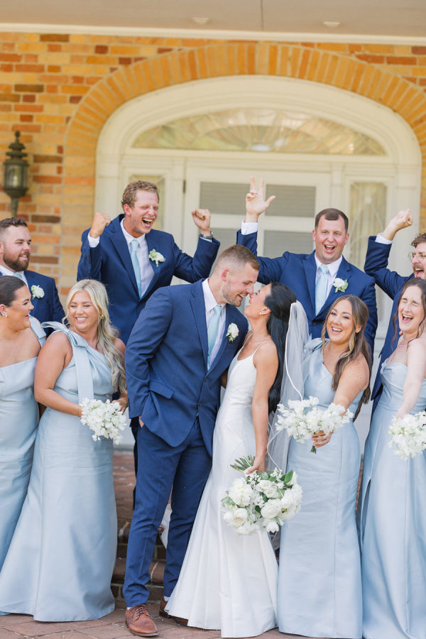 Groomsmen wore slate blue suits and light blue ties to complement the wedding design and the bridesmaids’ dresses.