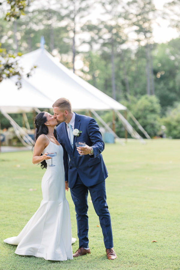 From the passed espresso martinis to the custom scallop serving trays, there was never a dull moment in the food and beverage category of this event. We brought the subtle motif of Elizabeth’s save the date pattern through to the base of the serving platters and on the backs of the bar shelving in the stunning central bar of the sailcloth tent. Guests enjoyed specialty cocktails in carefully curated glassware to match the aesthetic of the event.