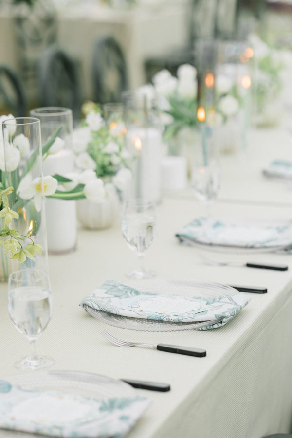 The most important element of the stunning sailcloth tent design was the tree installations on each sailcloth tent pole. These trees, expertly fabricated by Becca Zorn Design, brought the event ambience to the next level. BBJ La Tavola’s stunning Josephine Sage linen was the foundation of the wedding design. This linen included every single color in Elizabeth’s palette, and inspired the muted teal ecustom-painted central bar and fun pops of light chartreuse in the napkins and stationery.