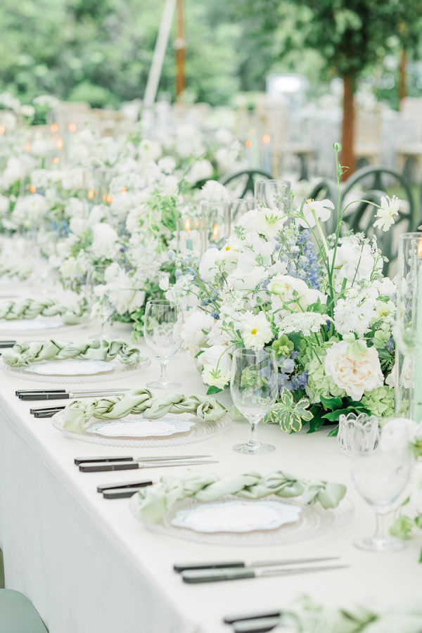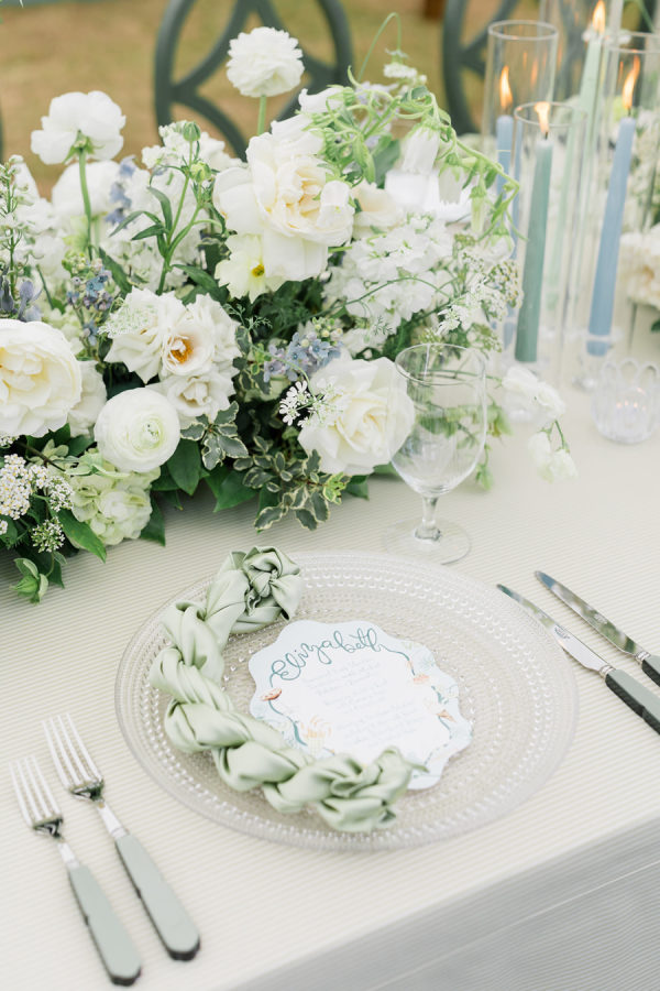 Elizabeth’s head table napkin was a custom creation by the planning team combining two light chartreuse napkins, twisting them, and creating a bubble braid effect to give the appearance of scalloped edges.