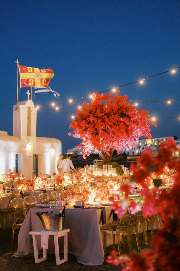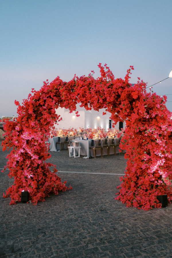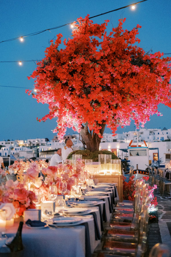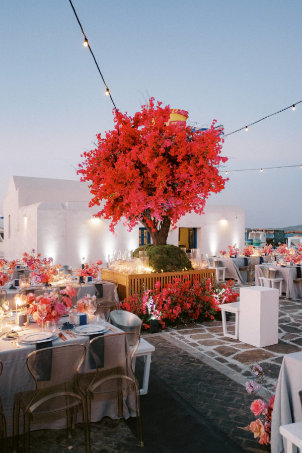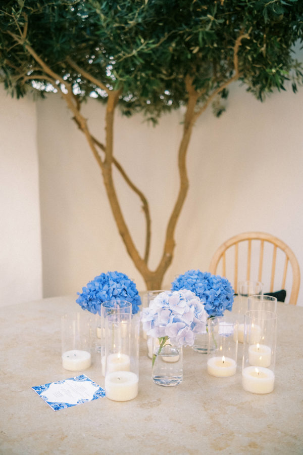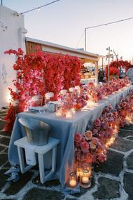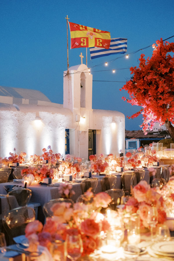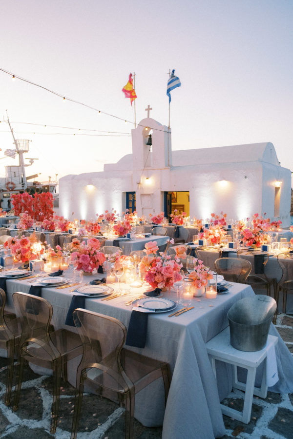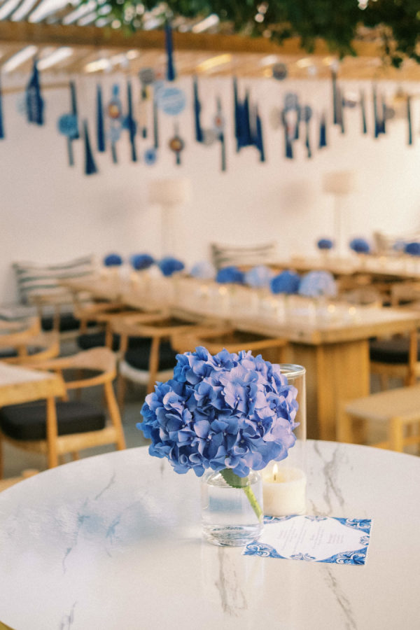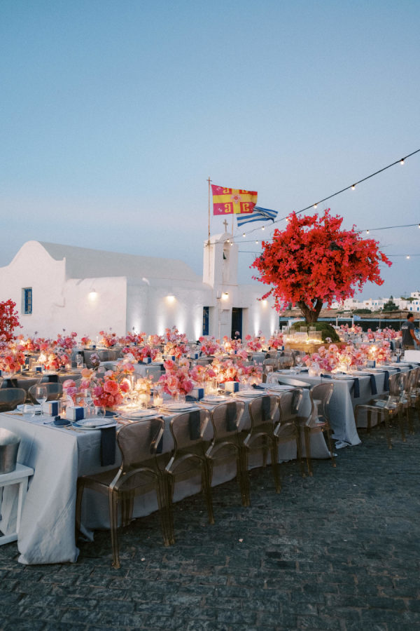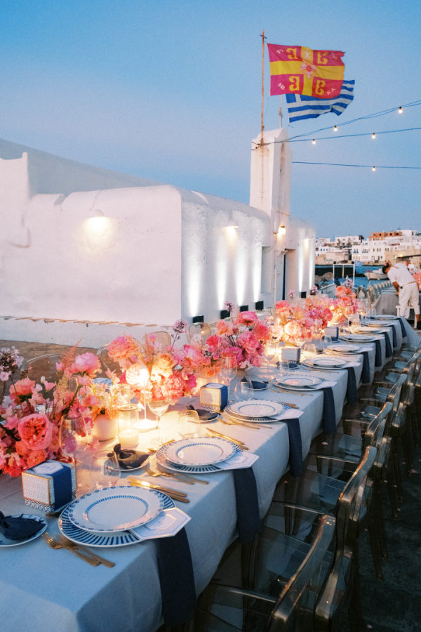 The floral design was both romantic and editorial in its execution. Lush arrangements of garden roses, peonies, hydrangeas, and vivid bougainvillea cascaded throughout the venue, echoing the vibrant nature of the Cycladic landscape. The floral palette mirrored the wedding’s dual-toned theme, with blue and white blooms gracing the ceremony, and pink hues taking center stage at the reception. Textured linens, contemporary tableware, and carefully grouped floral compositions brought structure and storytelling to the tablescapes. Each guest was welcomed with a custom-designed menu and a thoughtfully curated favor—elements that added a deeply personal and luxurious touch. The décor harmonized island charm with bold artistic direction. Geometric patterns and layered design moments created a space that felt simultaneously organic and elevated—ideal for couples dreaming of a luxury wedding in Greece.