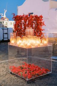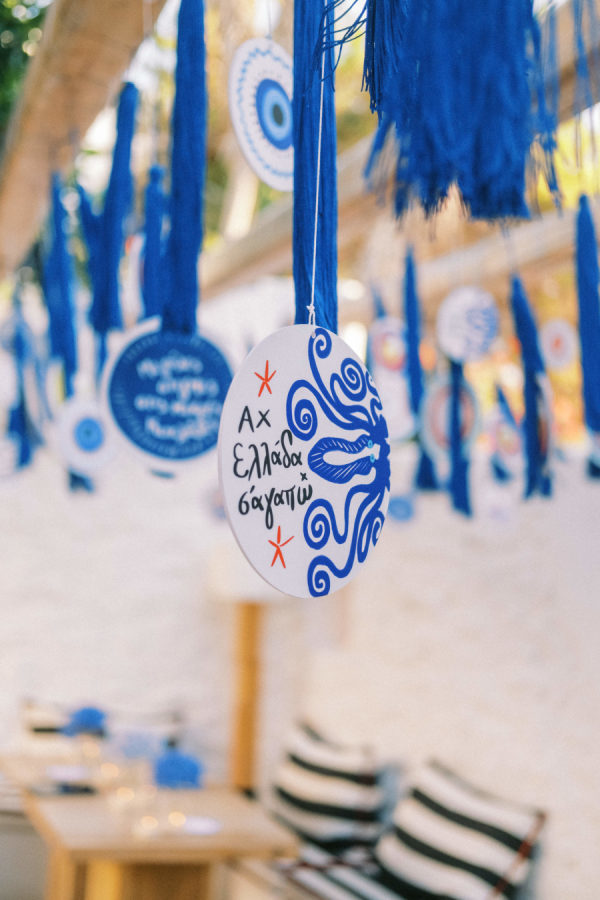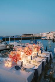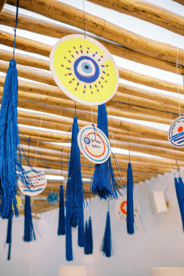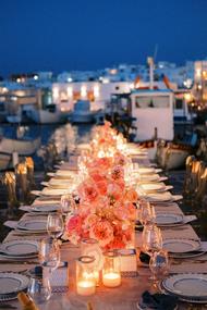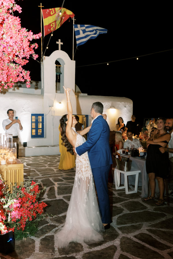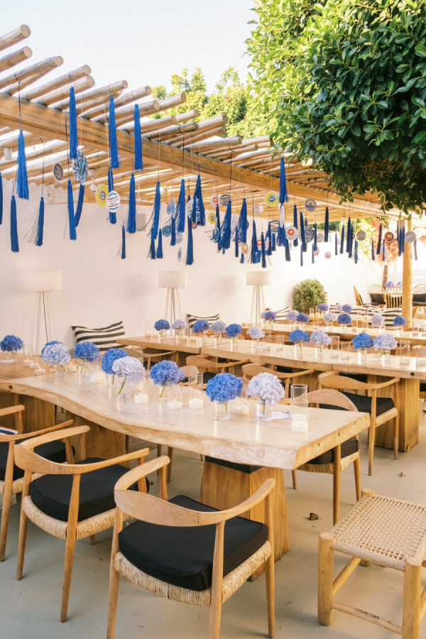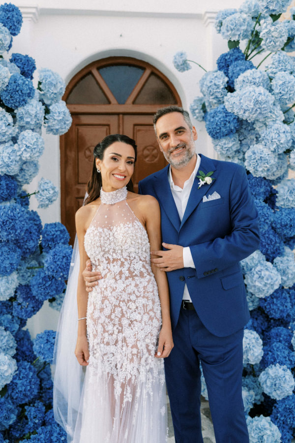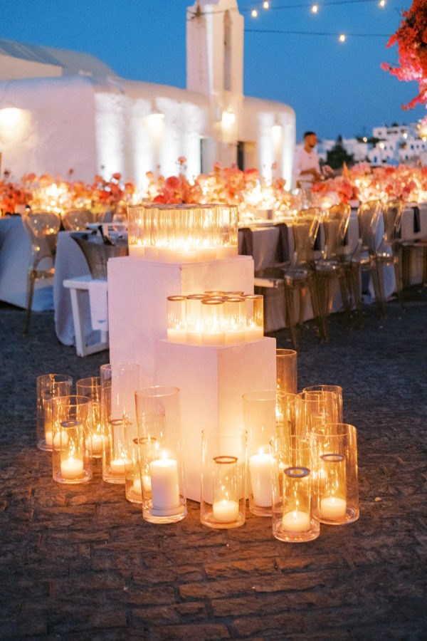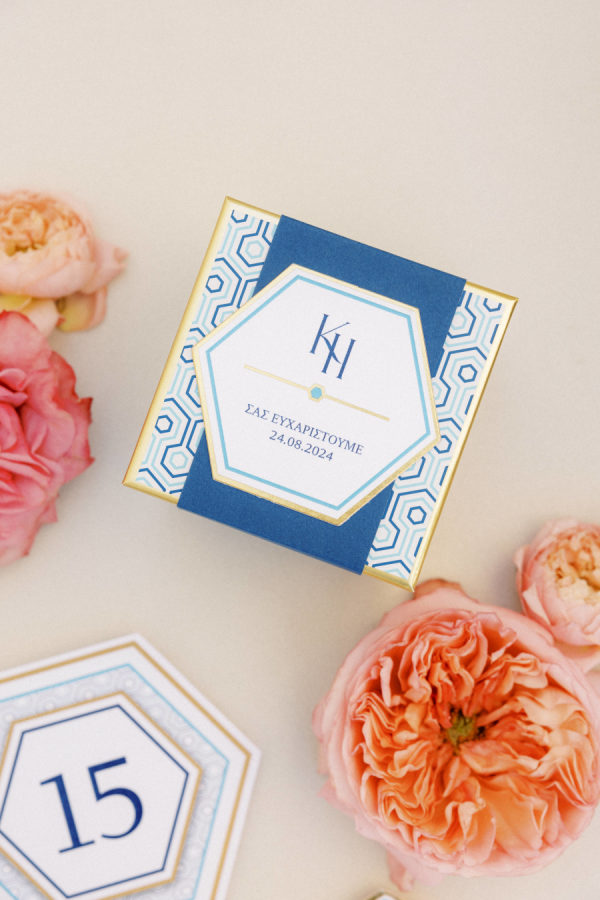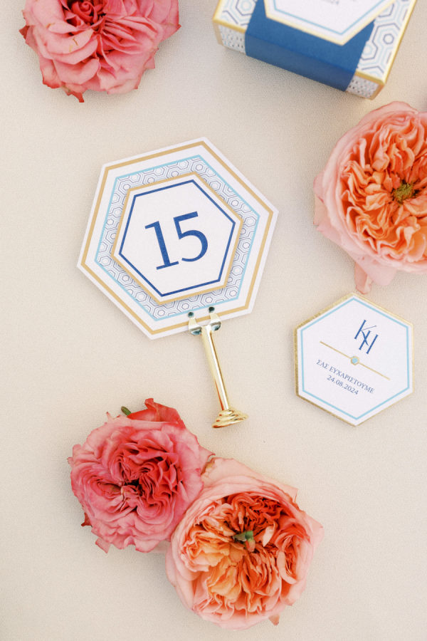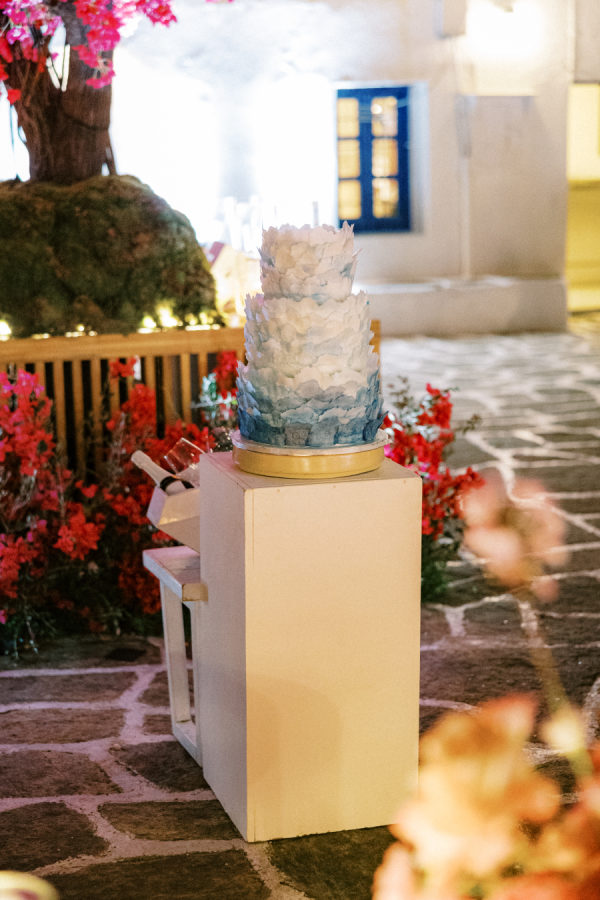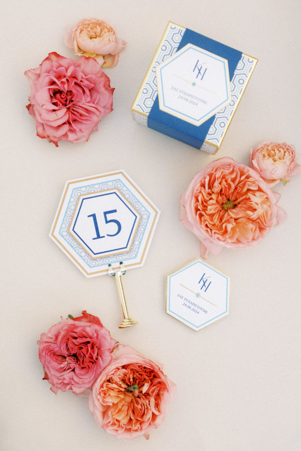The floral design was both romantic and editorial in its execution. Lush arrangements of garden roses, peonies, hydrangeas, and vivid bougainvillea cascaded throughout the venue, echoing the vibrant nature of the Cycladic landscape. The floral palette mirrored the wedding’s dual-toned theme, with blue and white blooms gracing the ceremony, and pink hues taking center stage at the reception. Textured linens, contemporary tableware, and carefully grouped floral compositions brought structure and storytelling to the tablescapes. Each guest was welcomed with a custom-designed menu and a thoughtfully curated favor—elements that added a deeply personal and luxurious touch. The décor harmonized island charm with bold artistic direction. Geometric patterns and layered design moments created a space that felt simultaneously organic and elevated—ideal for couples dreaming of a luxury wedding in Greece.