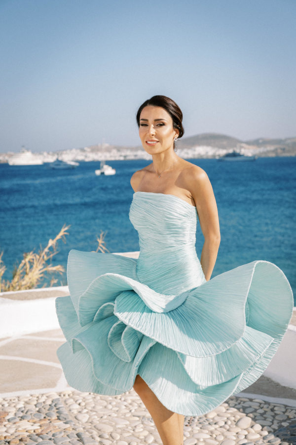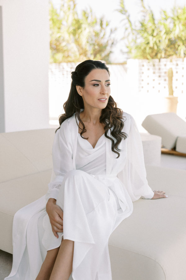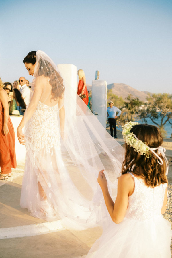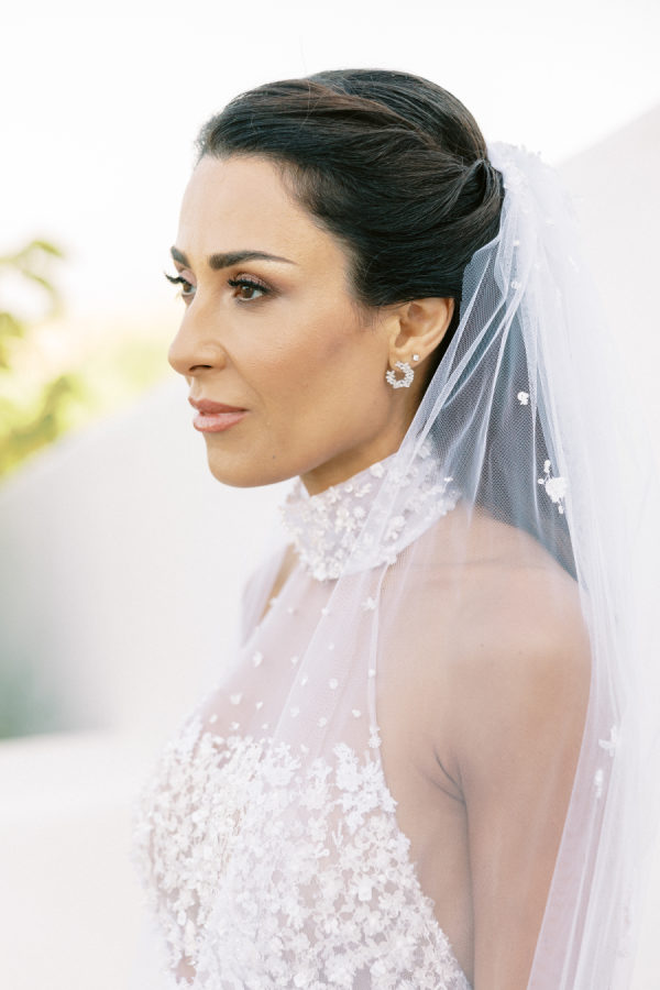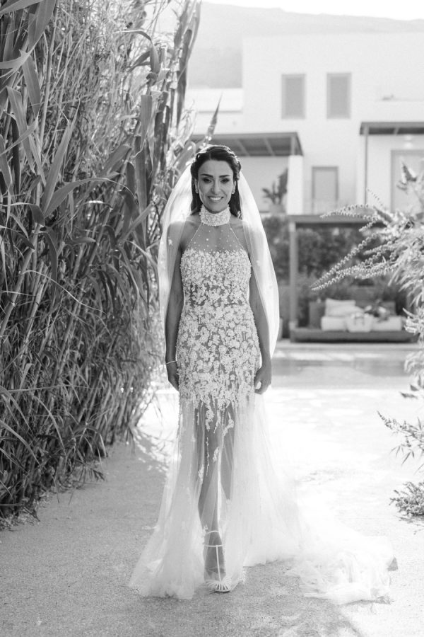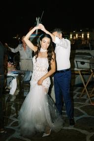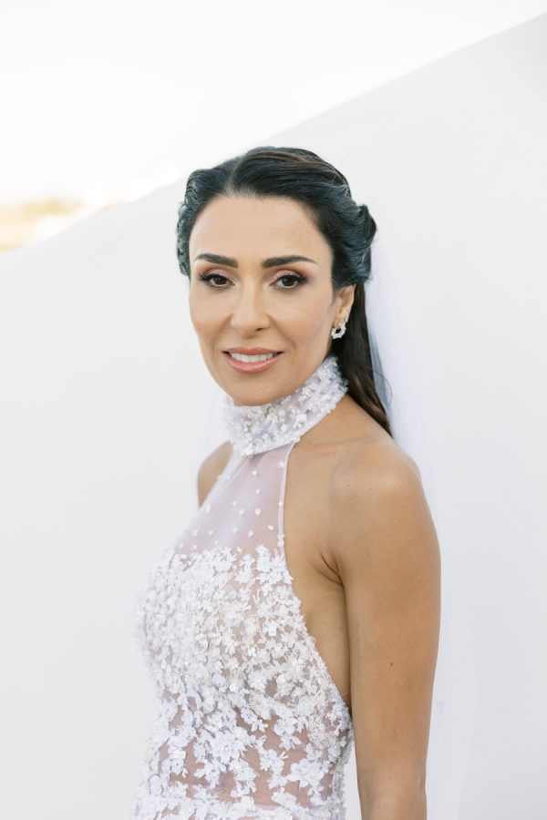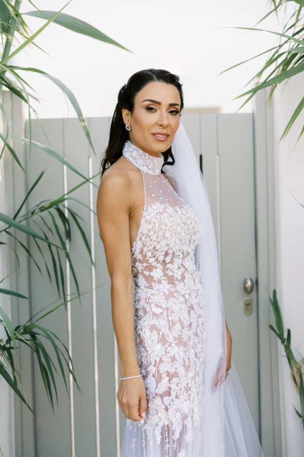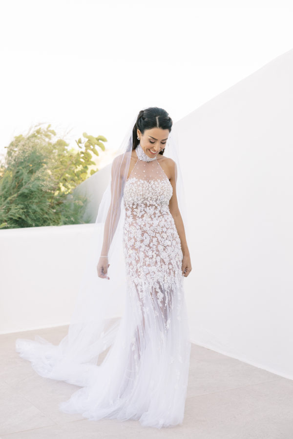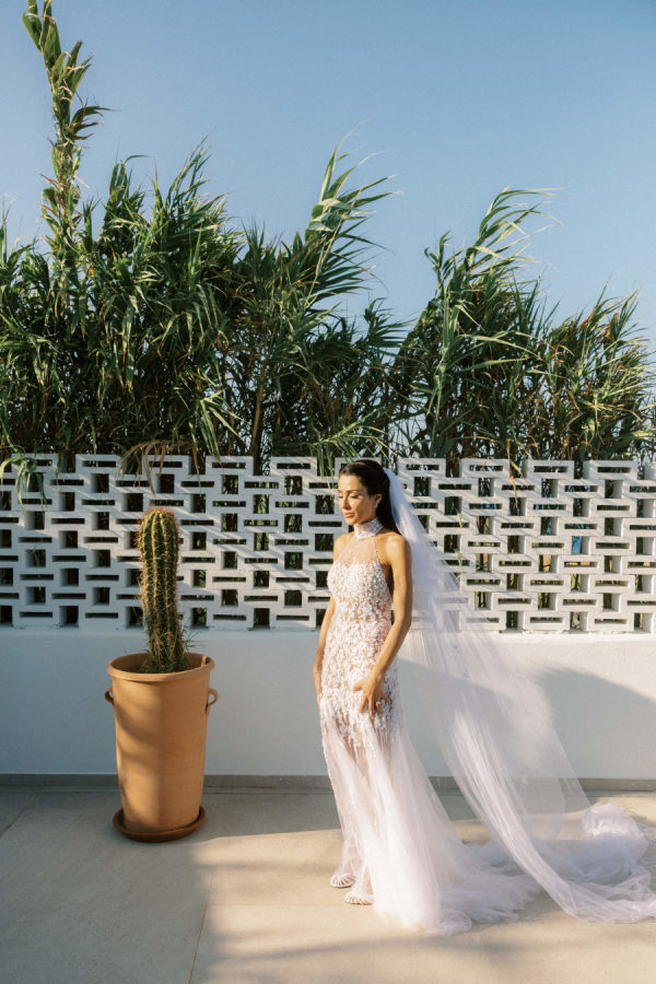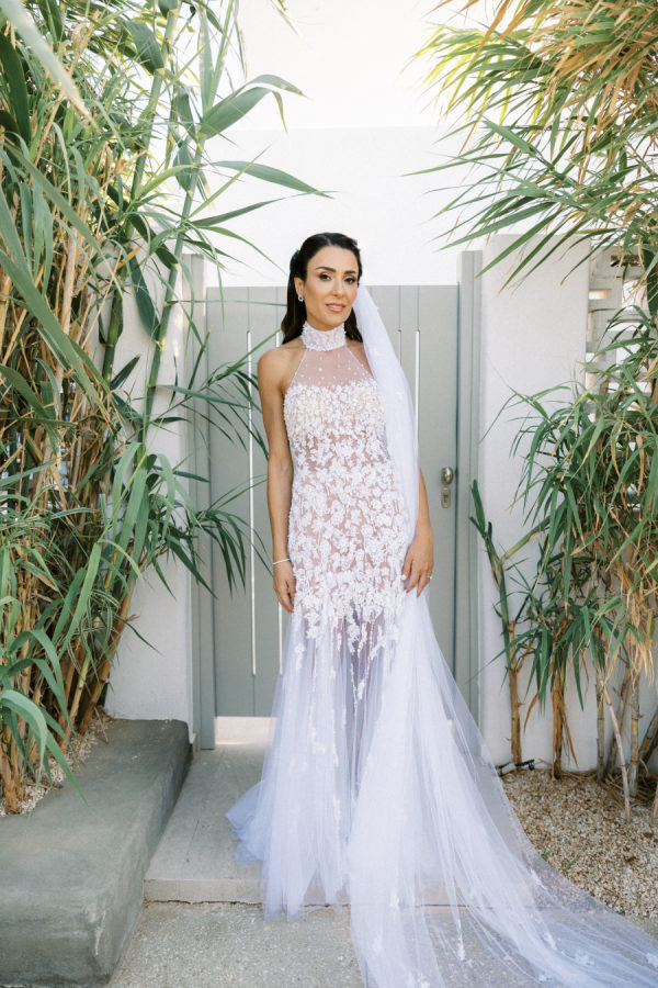 [field title=”Wedding Gown”]The bride, Ilianna Strouthou, wore a custom-designed gown by renowned Greek haute couture designer Celia Kritharioti—an ethereal creation that perfectly balanced sophistication and softness. Crafted with delicate semi-sheer fabrics that offered a subtle hint of skin, the gown was both graceful and modern, never overtly sexy, but always captivating. It was the kind of bridal look that felt tailored for a woman of elegance and intellect—after all, Ilianna is a doctor—and it allowed her to move with a divine lightness throughout the day. With its airy silhouette and goddess-like essence, she looked as though she had stepped out of a myth, embodying the perfect harmony between refined beauty and effortless island charm.[/field]
