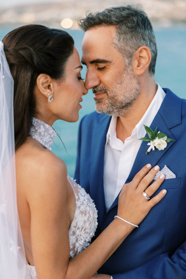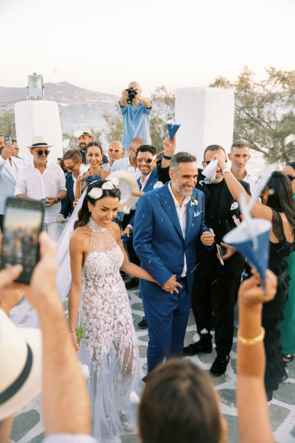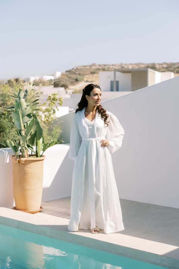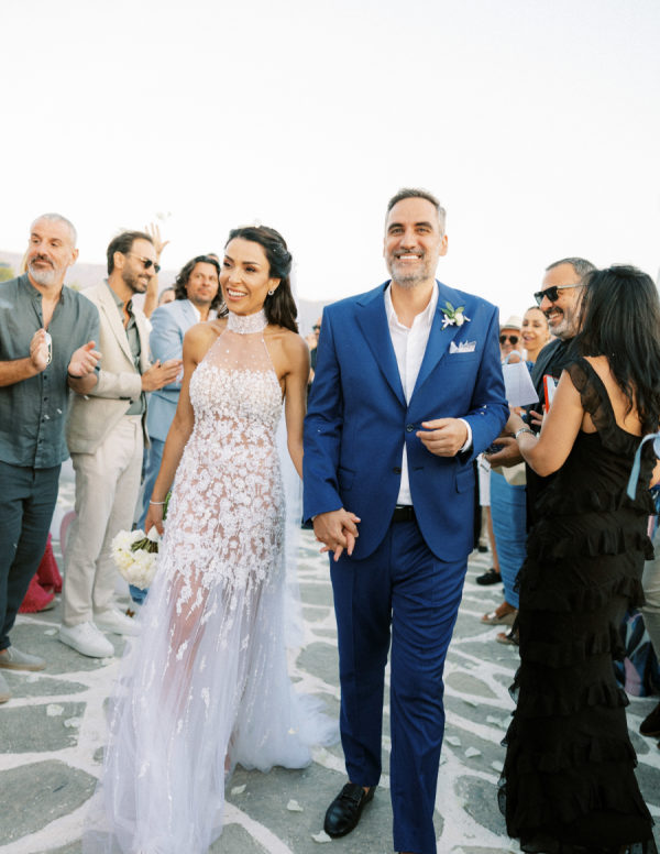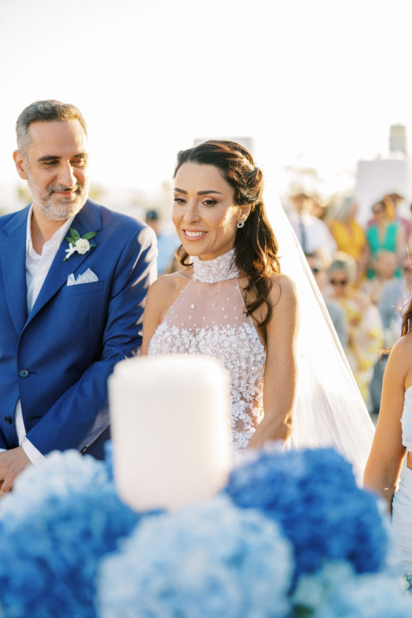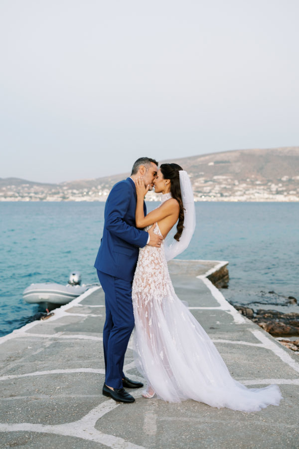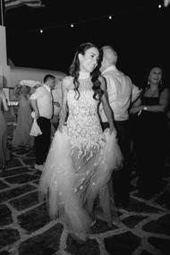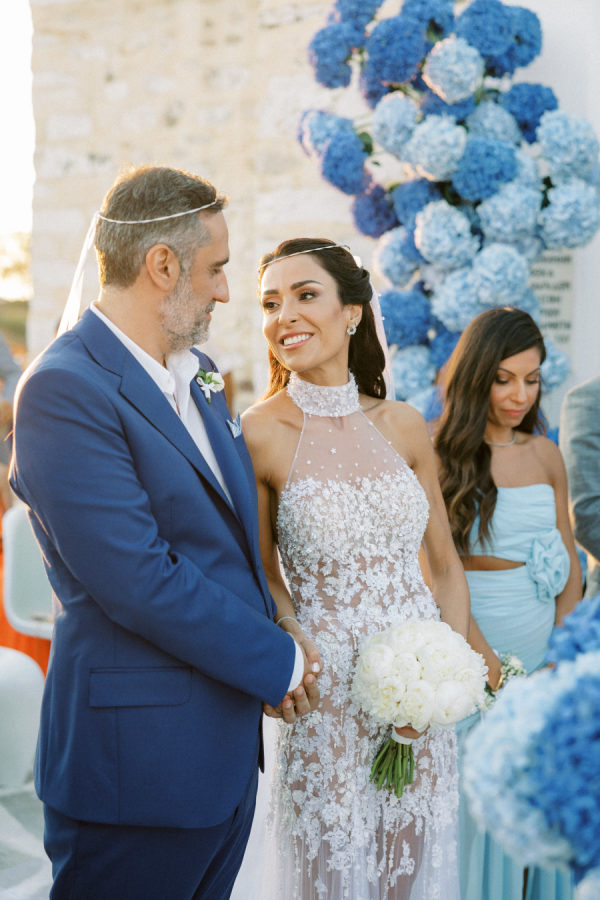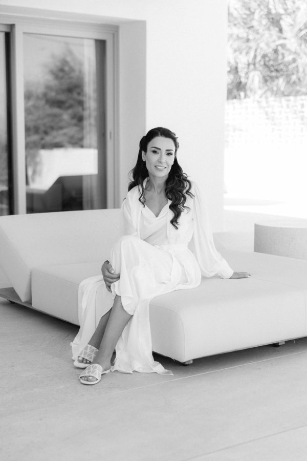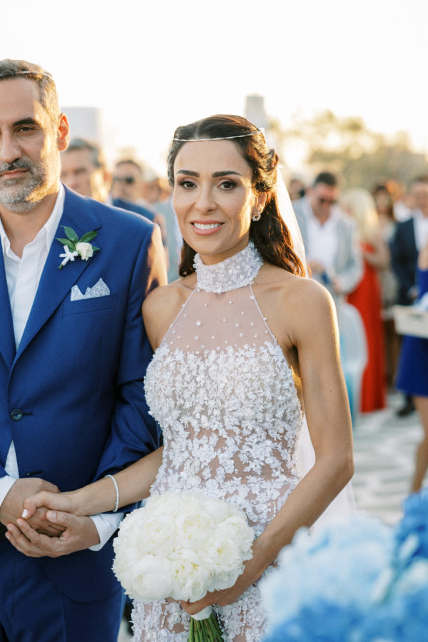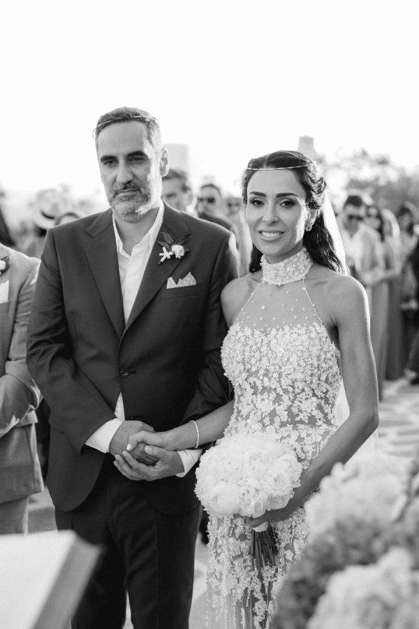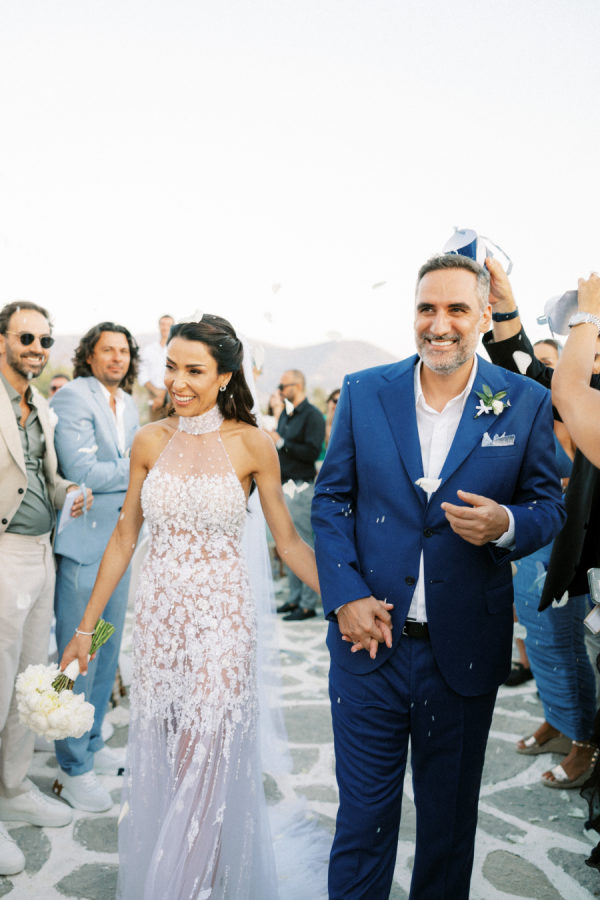 [field title=”Wedding Gown”]The bride, Ilianna Strouthou, wore a custom-designed gown by renowned Greek haute couture designer Celia Kritharioti—an ethereal creation that perfectly balanced sophistication and softness. Crafted with delicate semi-sheer fabrics that offered a subtle hint of skin, the gown was both graceful and modern, never overtly sexy, but always captivating. It was the kind of bridal look that felt tailored for a woman of elegance and intellect—after all, Ilianna is a doctor—and it allowed her to move with a divine lightness throughout the day. With its airy silhouette and goddess-like essence, she looked as though she had stepped out of a myth, embodying the perfect harmony between refined beauty and effortless island charm.[/field]