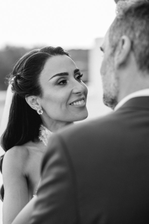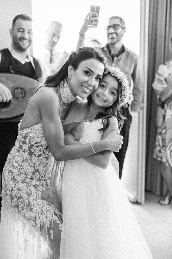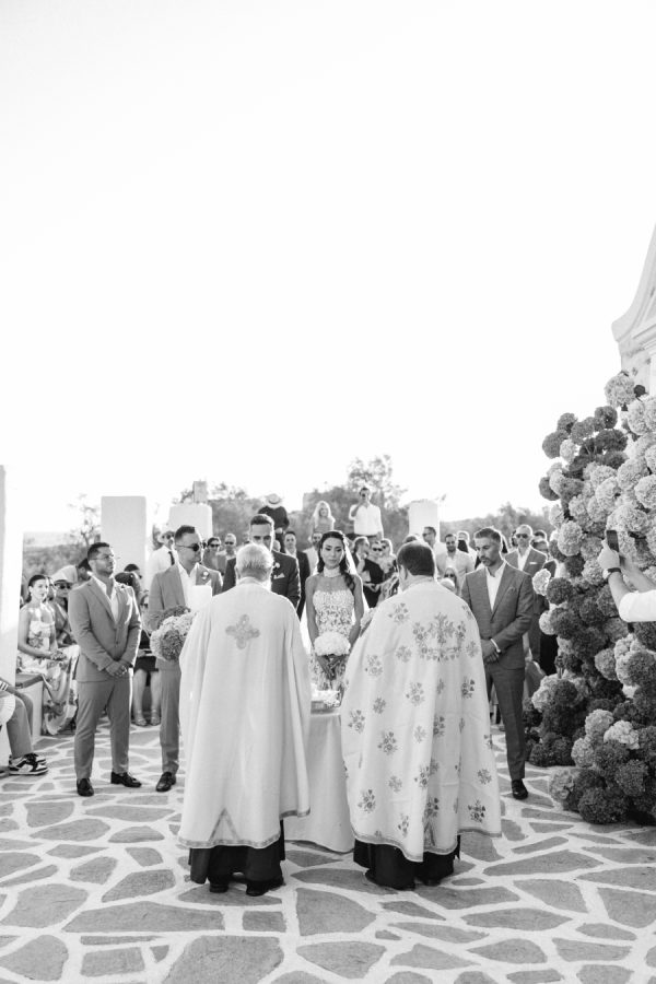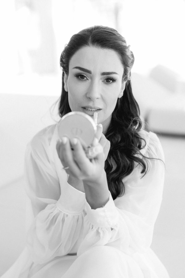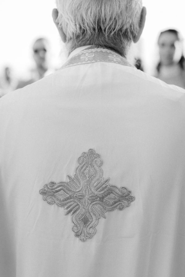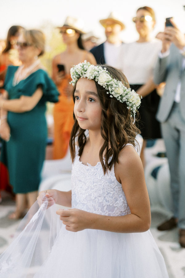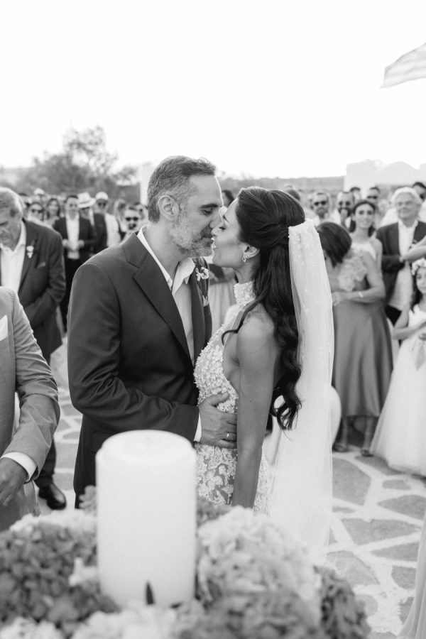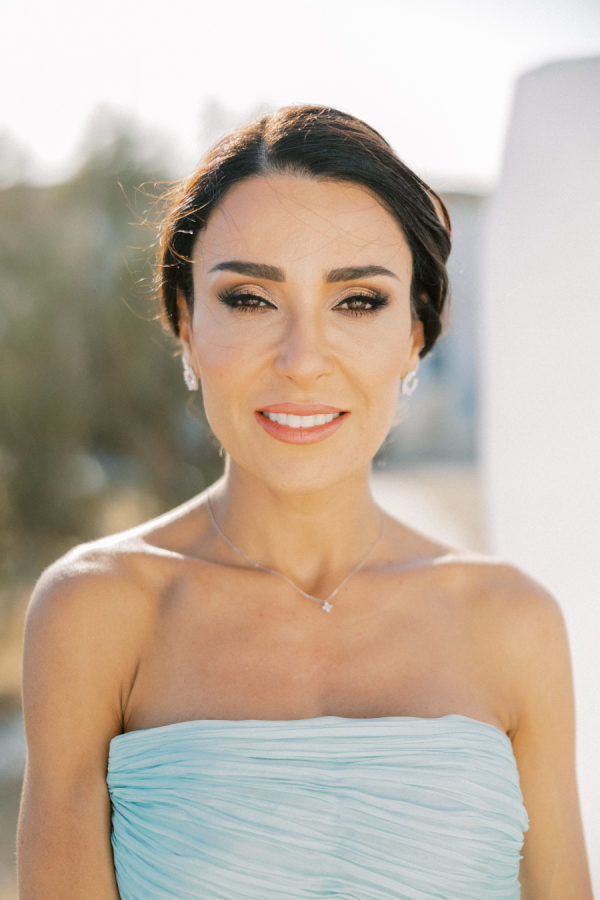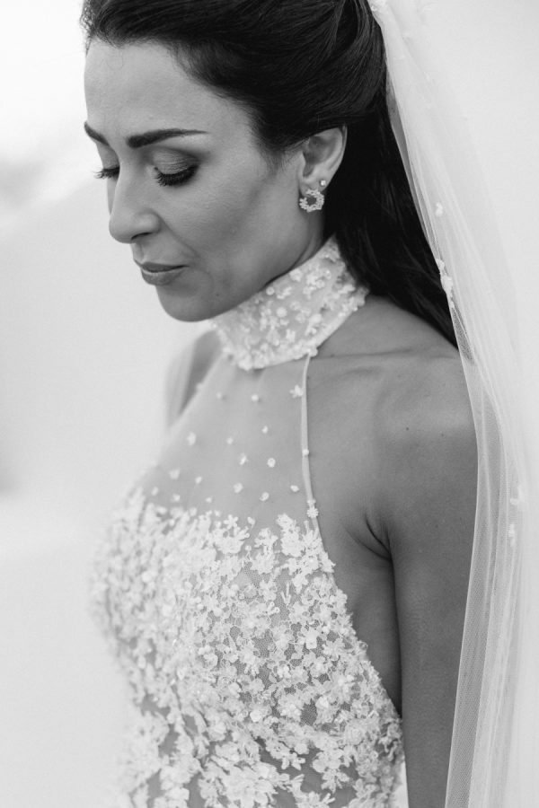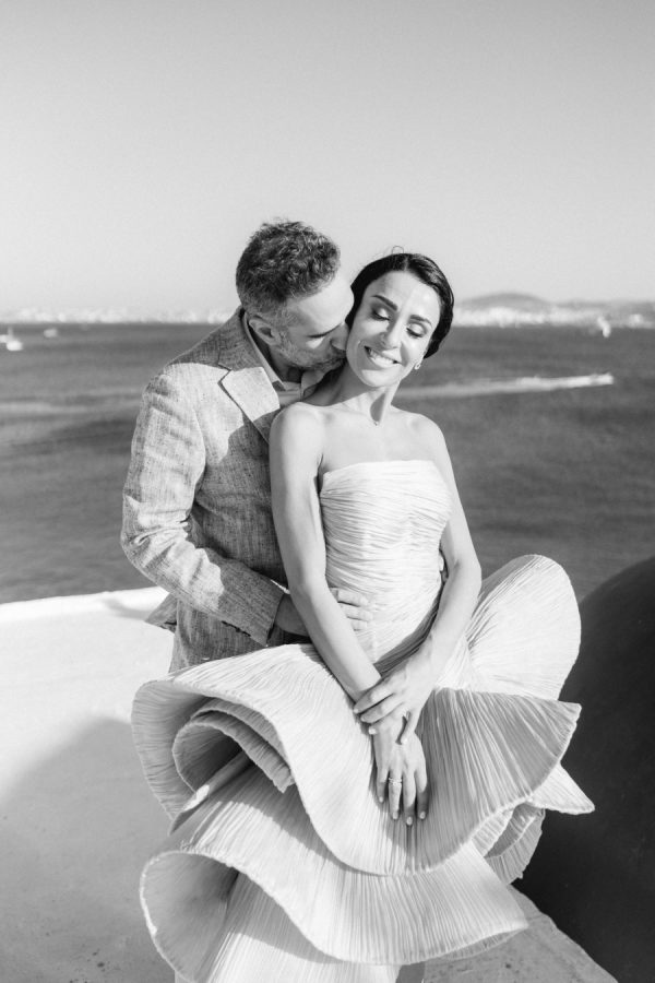 [field title=”Wedding Gown”]The bride, Ilianna Strouthou, wore a custom-designed gown by renowned Greek haute couture designer Celia Kritharioti—an ethereal creation that perfectly balanced sophistication and softness. Crafted with delicate semi-sheer fabrics that offered a subtle hint of skin, the gown was both graceful and modern, never overtly sexy, but always captivating. It was the kind of bridal look that felt tailored for a woman of elegance and intellect—after all, Ilianna is a doctor—and it allowed her to move with a divine lightness throughout the day. With its airy silhouette and goddess-like essence, she looked as though she had stepped out of a myth, embodying the perfect harmony between refined beauty and effortless island charm.[/field]