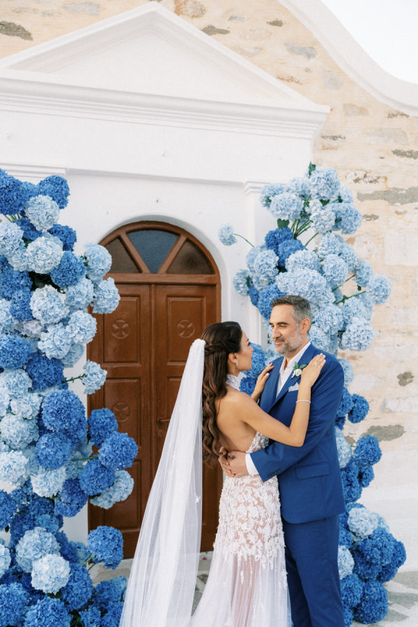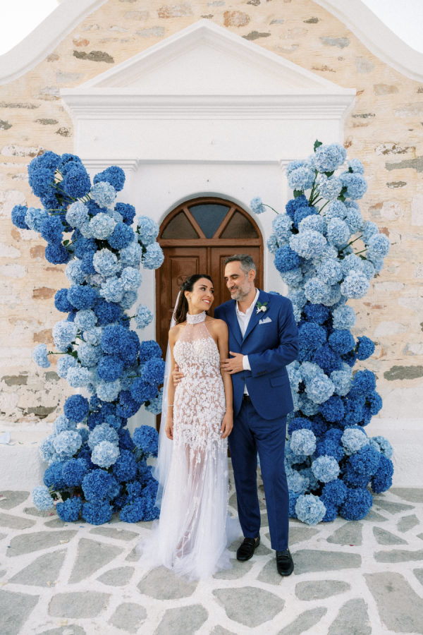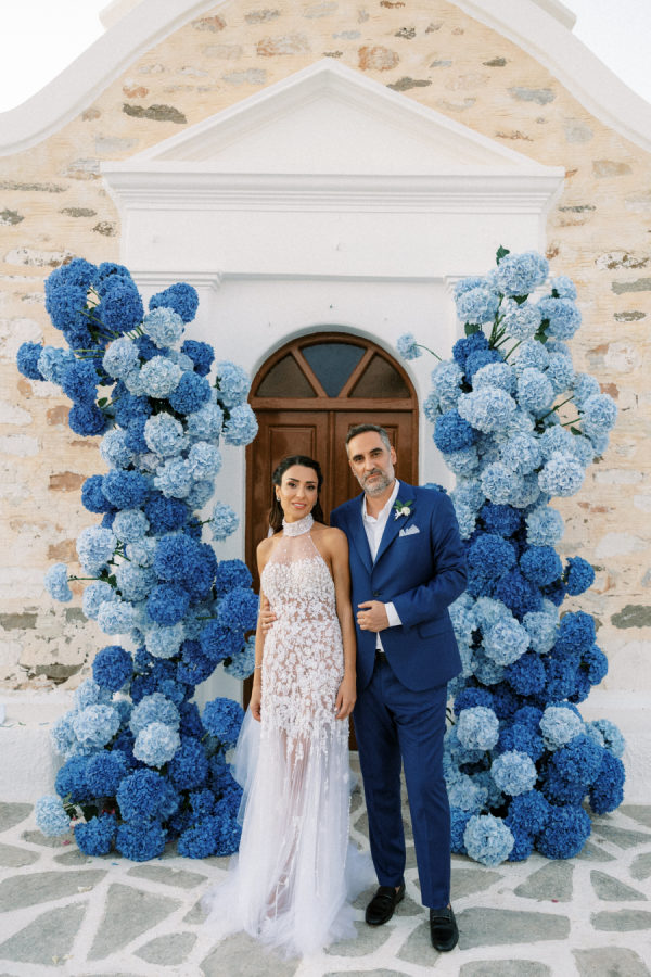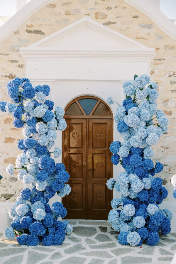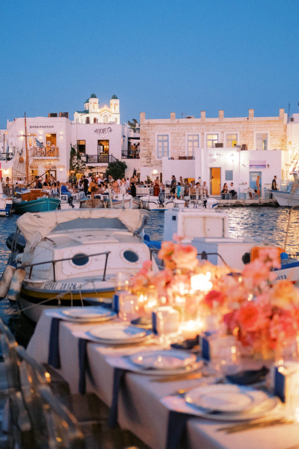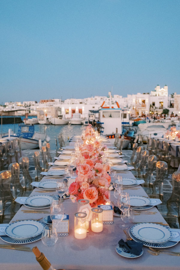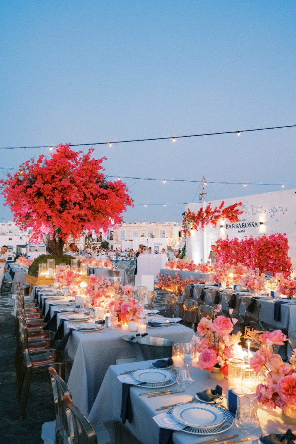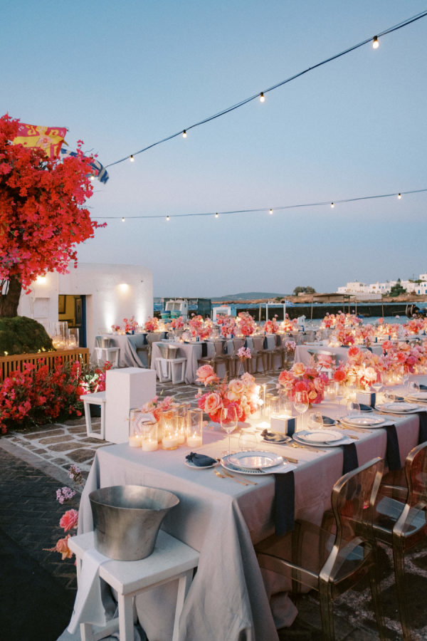 The wedding’s palette was a masterclass in elegance and Mediterranean vibrance. For the ceremony, the design embraced timeless tones of Aegean blue and crisp white—a direct nod to the iconic Greek island landscape of Paros. As the day unfolded into the evening, the palette transitioned into an ethereal spectrum of pinks—from the softest blush to bold fuchsia—bringing warmth, romance, and a modern touch to the reception setting. This dynamic use of color served as the perfect foundation for a stylish, joy-filled destination wedding in Greece.