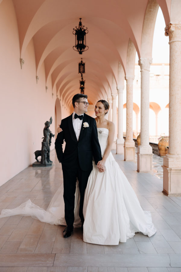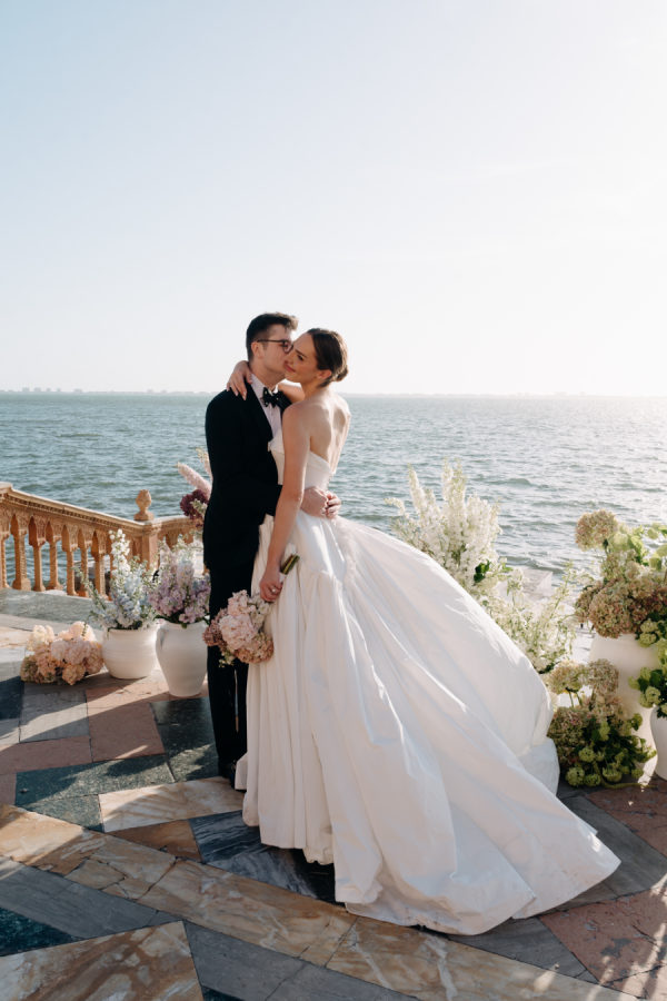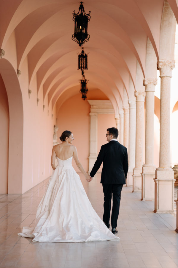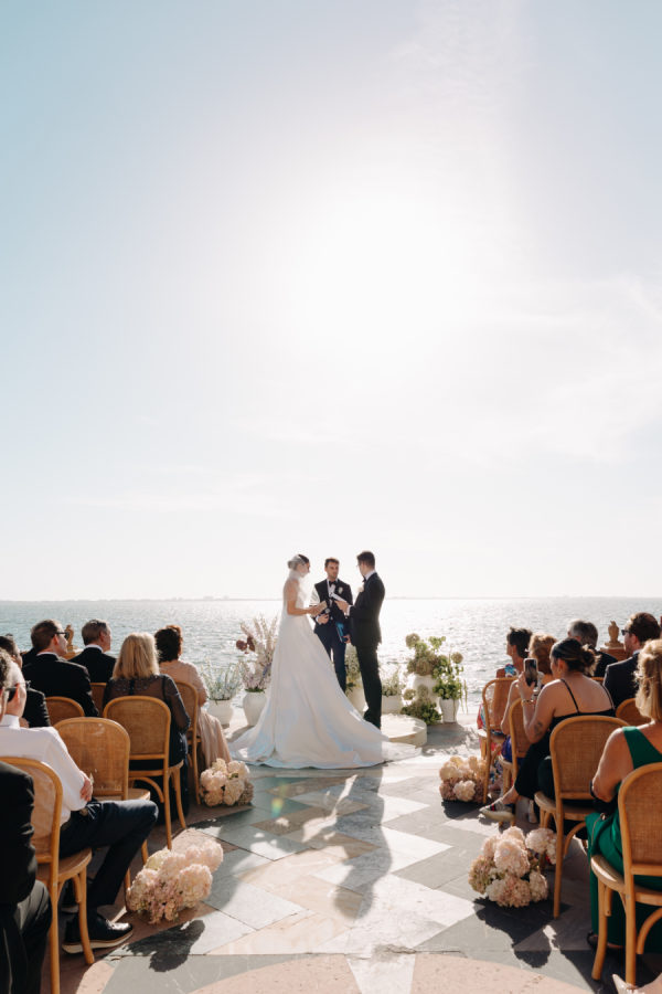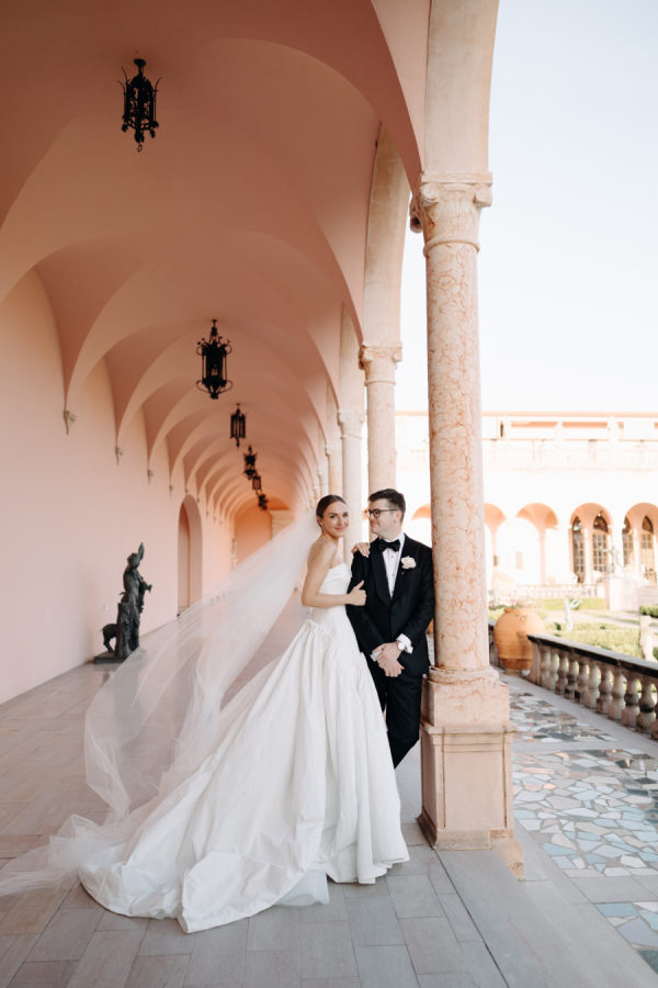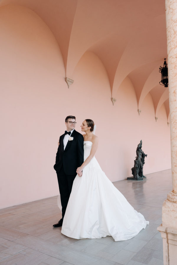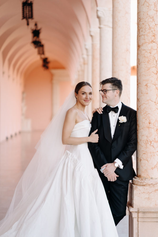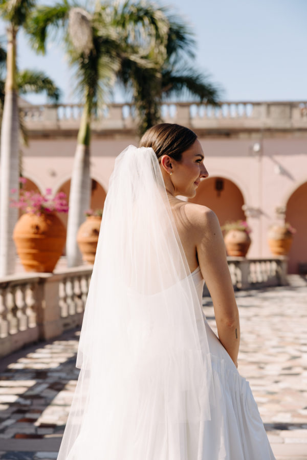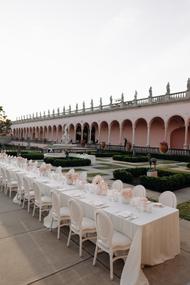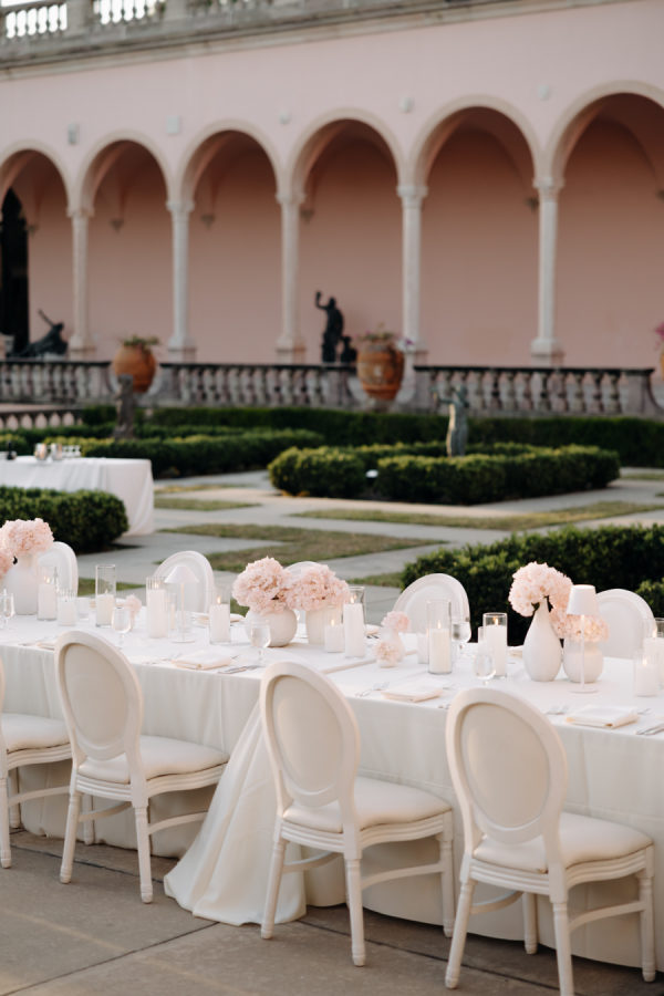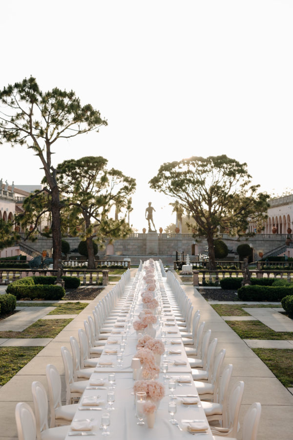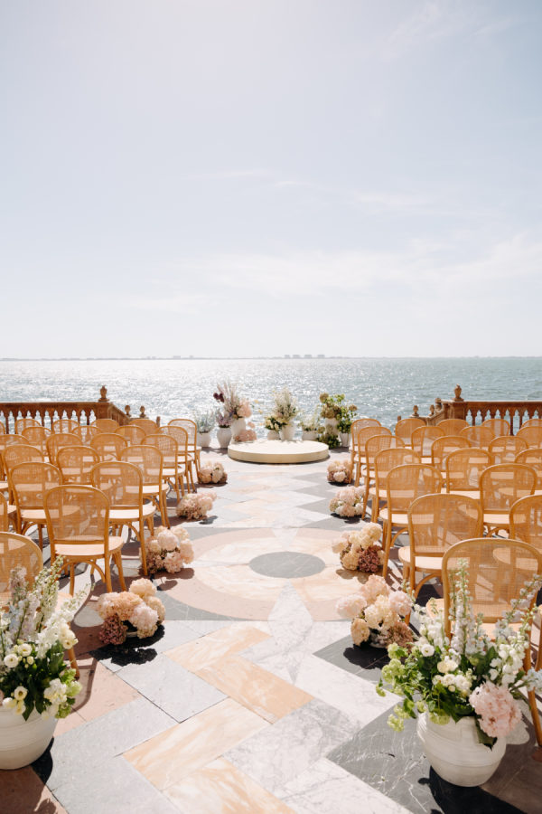 We wanted a wedding which was formal but not stuffy, traditional but memorable! A stateside destination wedding was the perfect fit for us. My (Alyssa) parents spend their winters in Sarasota, and Tim’s (groom) parents spend their winters in Bonita Springs, so we narrowed our search to the Gulf Coast. Luckily, the John and Mable Ringling Museum of Art was right under our noses in Sarasota. Its European architecture felt just as special on our wedding day as it did the first time we saw it — there are “wow” factors everywhere you turn. We didn’t want our decor to detract from (or compete with) the museum in any way, so we kept our decor complementary to each space. At our ceremony, for example, the chairs mimicked the rounded shapes and chestnut colors of the Ca’ d’Zan façade, and the florals emphasized light pink and cream tones in the terrace’s tiles. As a result, we did not have “wedding colors”. The “theme” we were always striving for was more of a feeling. Put as simply as I can, we wanted a refined and perfect balance of: simple yet memorable, European yet Florida, formal yet fun, traditional yet updated, Summery yet Spring!