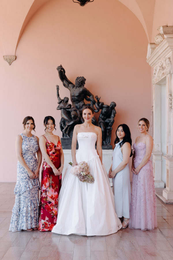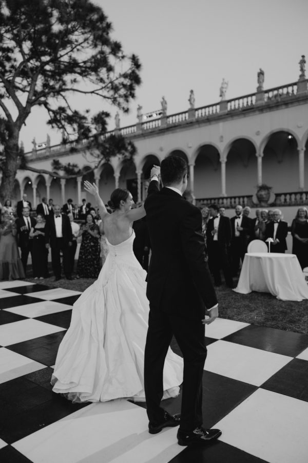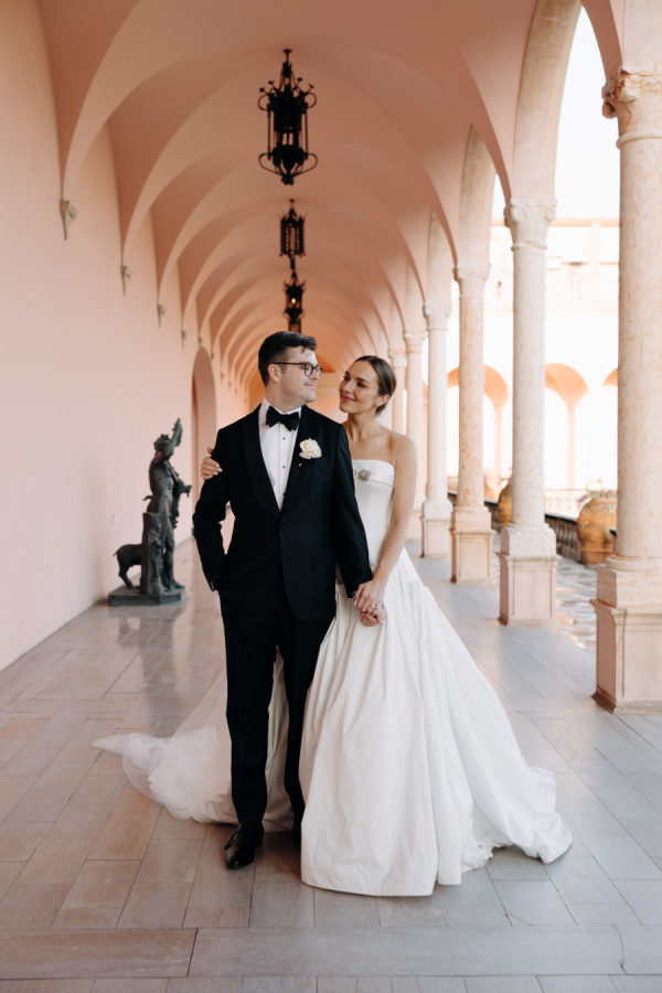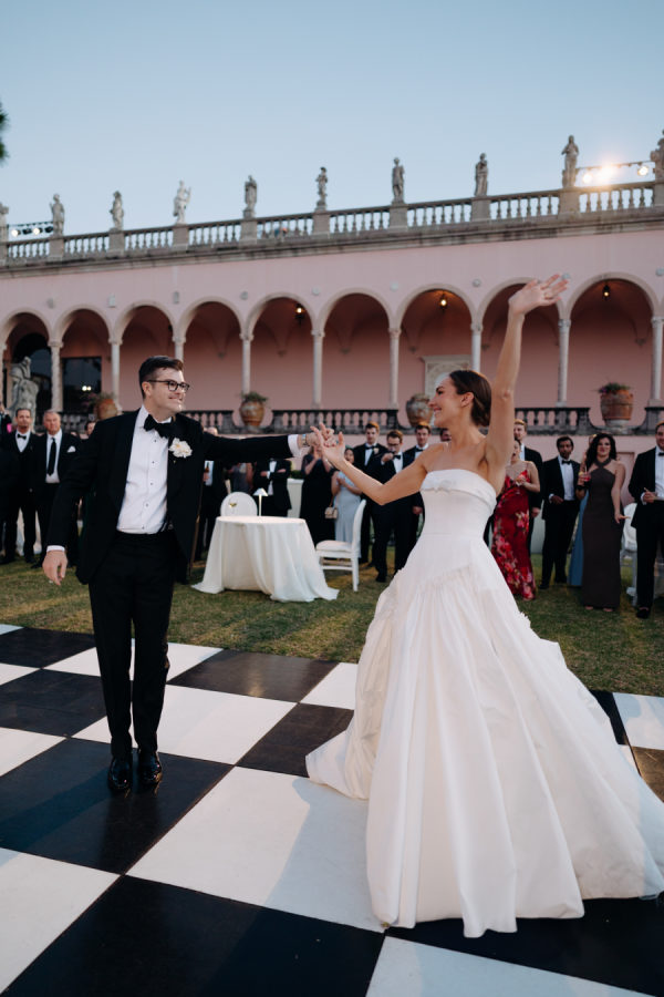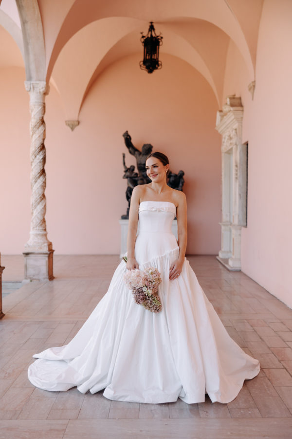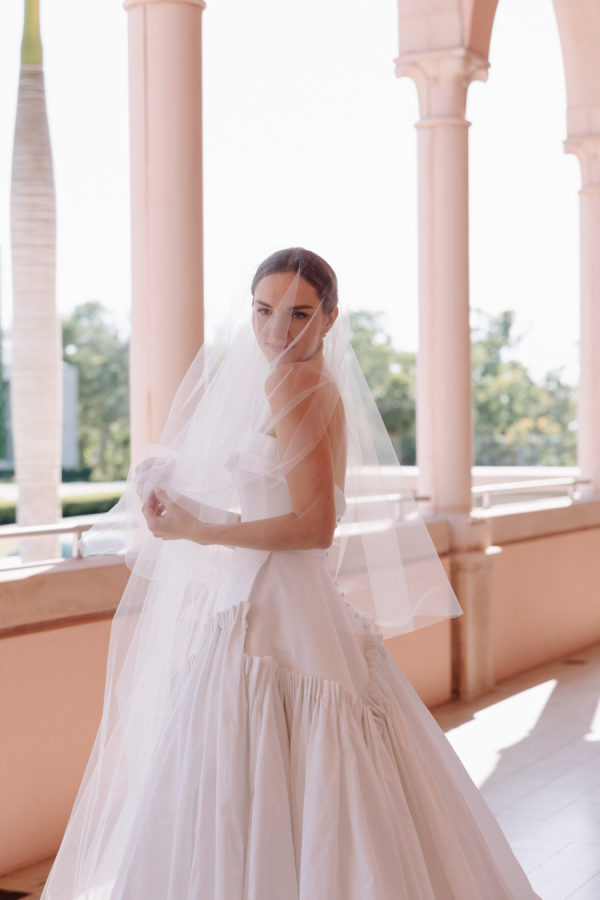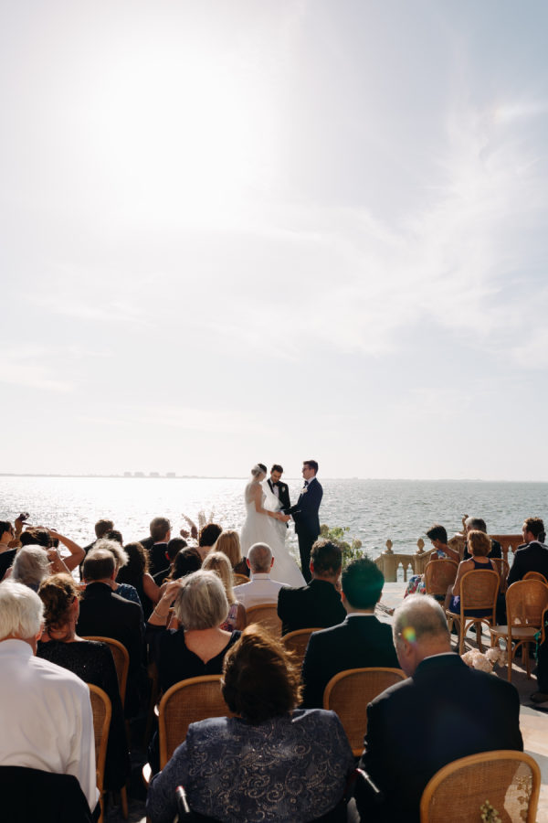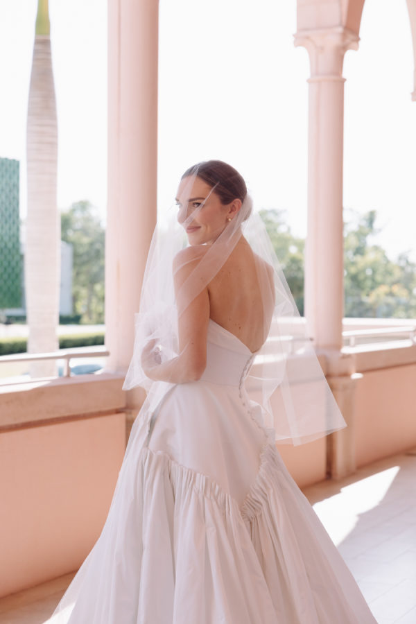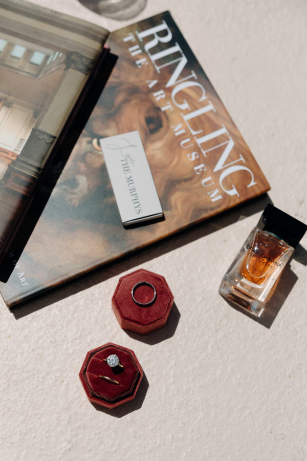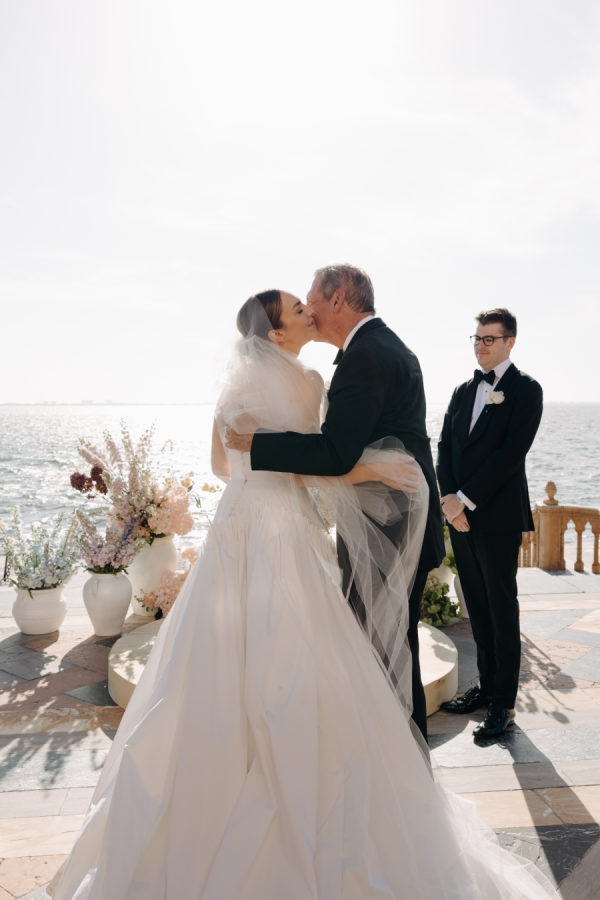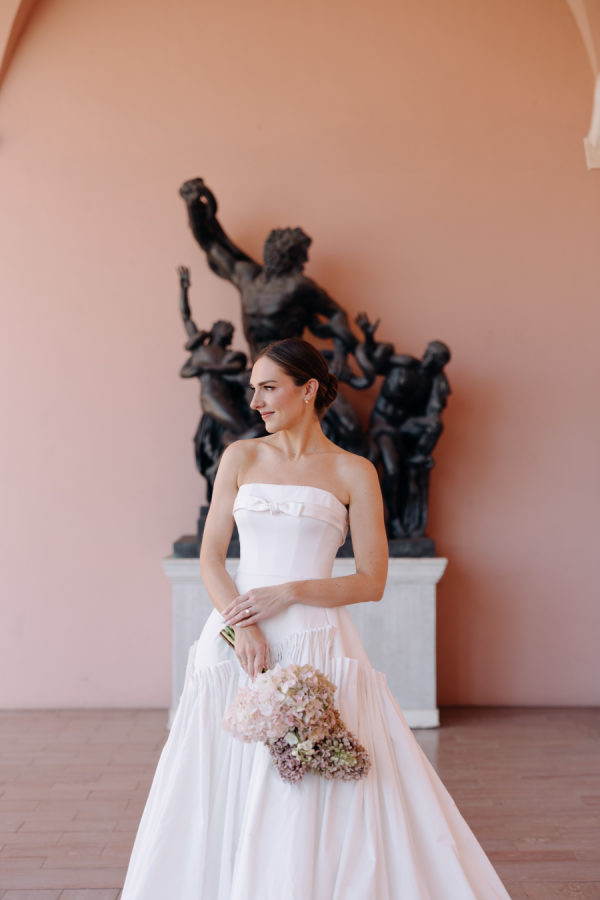 We wanted a wedding which was formal but not stuffy, traditional but memorable! A stateside destination wedding was the perfect fit for us. My (Alyssa) parents spend their winters in Sarasota, and Tim’s (groom) parents spend their winters in Bonita Springs, so we narrowed our search to the Gulf Coast. Luckily, the John and Mable Ringling Museum of Art was right under our noses in Sarasota. Its European architecture felt just as special on our wedding day as it did the first time we saw it — there are “wow” factors everywhere you turn. We didn’t want our decor to detract from (or compete with) the museum in any way, so we kept our decor complementary to each space. At our ceremony, for example, the chairs mimicked the rounded shapes and chestnut colors of the Ca’ d’Zan façade, and the florals emphasized light pink and cream tones in the terrace’s tiles. As a result, we did not have “wedding colors”. The “theme” we were always striving for was more of a feeling. Put as simply as I can, we wanted a refined and perfect balance of: simple yet memorable, European yet Florida, formal yet fun, traditional yet updated, Summery yet Spring!