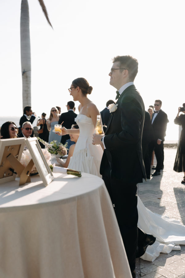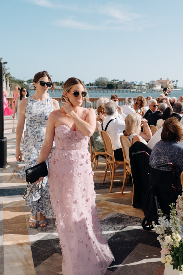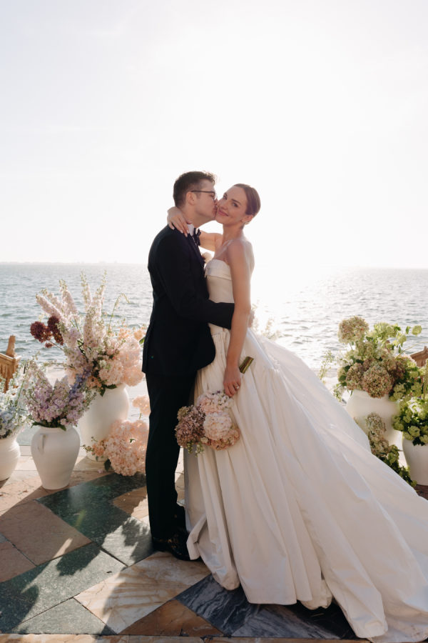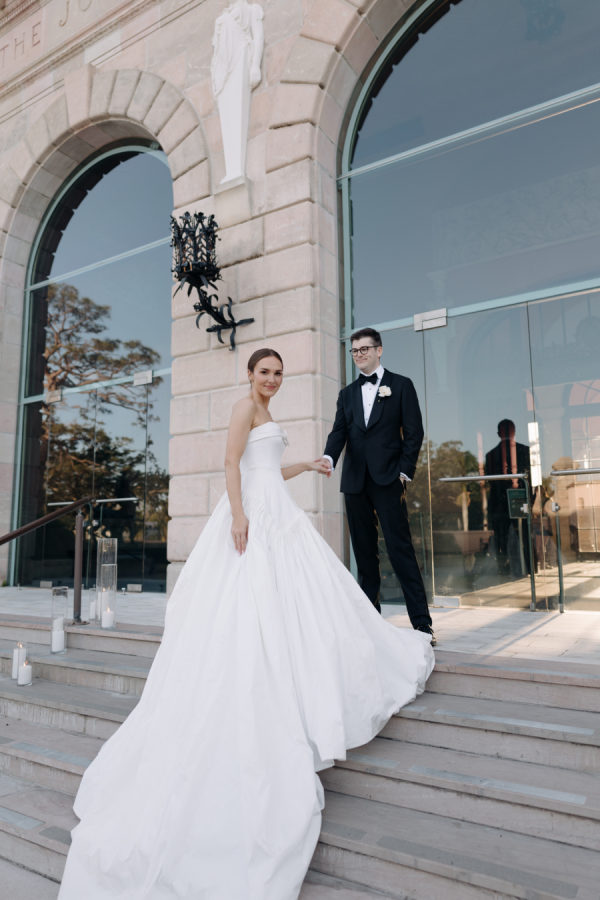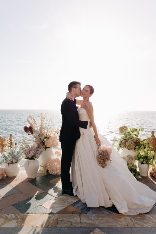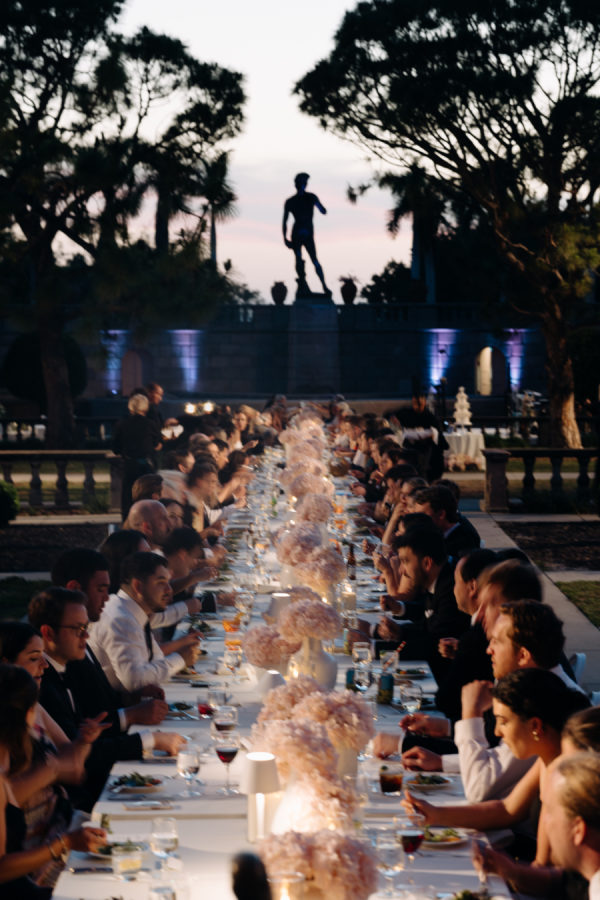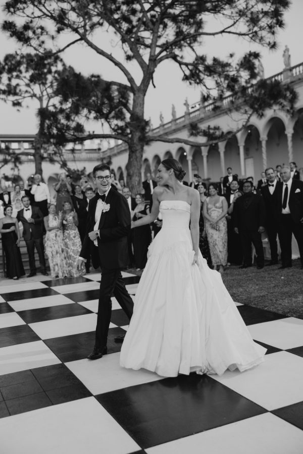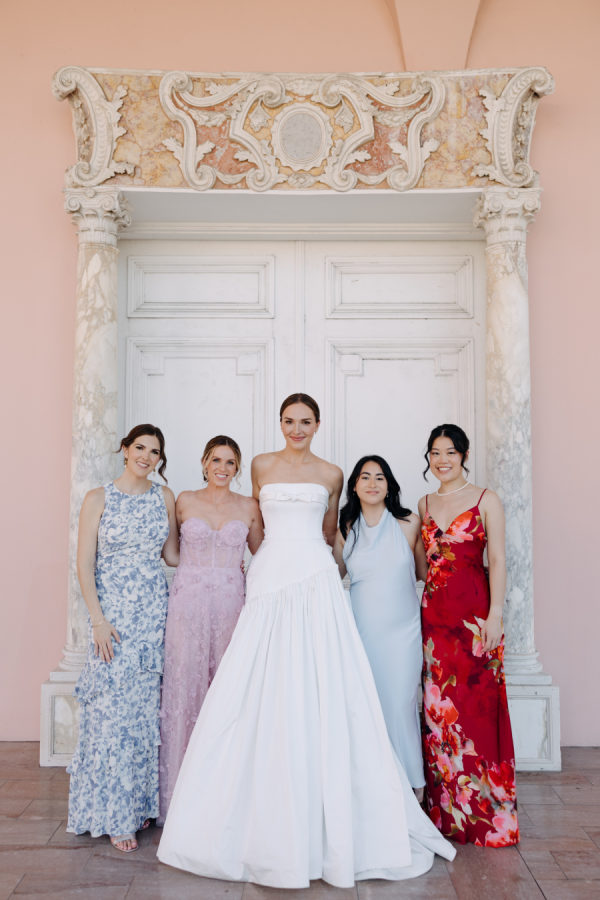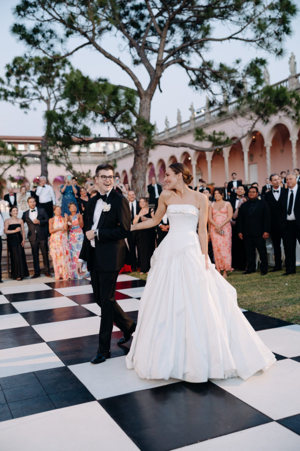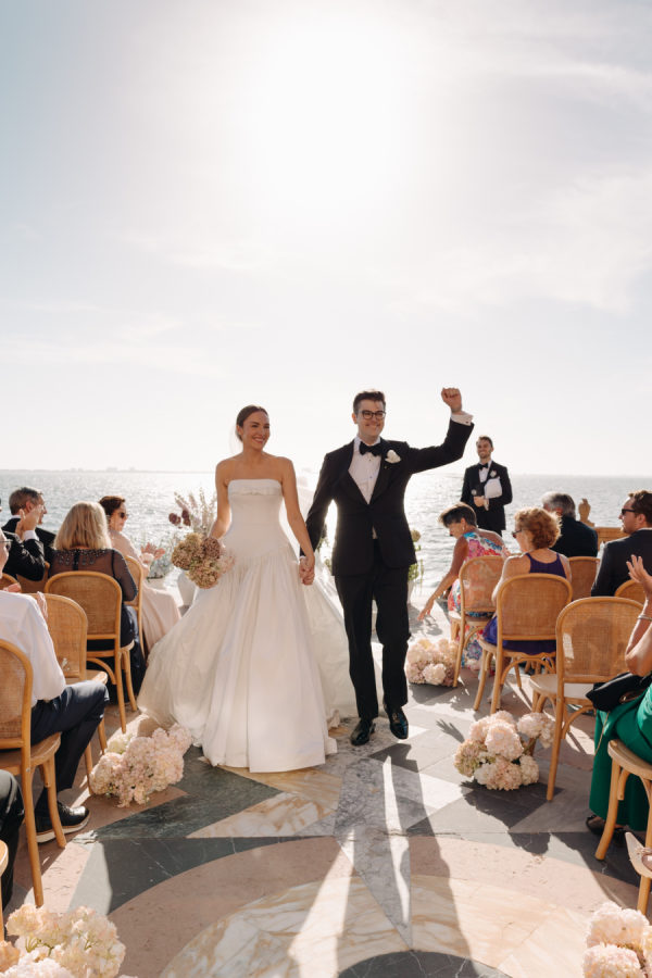 We wanted a wedding which was formal but not stuffy, traditional but memorable! A stateside destination wedding was the perfect fit for us. My (Alyssa) parents spend their winters in Sarasota, and Tim’s (groom) parents spend their winters in Bonita Springs, so we narrowed our search to the Gulf Coast. Luckily, the John and Mable Ringling Museum of Art was right under our noses in Sarasota. Its European architecture felt just as special on our wedding day as it did the first time we saw it — there are “wow” factors everywhere you turn. We didn’t want our decor to detract from (or compete with) the museum in any way, so we kept our decor complementary to each space. At our ceremony, for example, the chairs mimicked the rounded shapes and chestnut colors of the Ca’ d’Zan façade, and the florals emphasized light pink and cream tones in the terrace’s tiles. As a result, we did not have “wedding colors”. The “theme” we were always striving for was more of a feeling. Put as simply as I can, we wanted a refined and perfect balance of: simple yet memorable, European yet Florida, formal yet fun, traditional yet updated, Summery yet Spring!