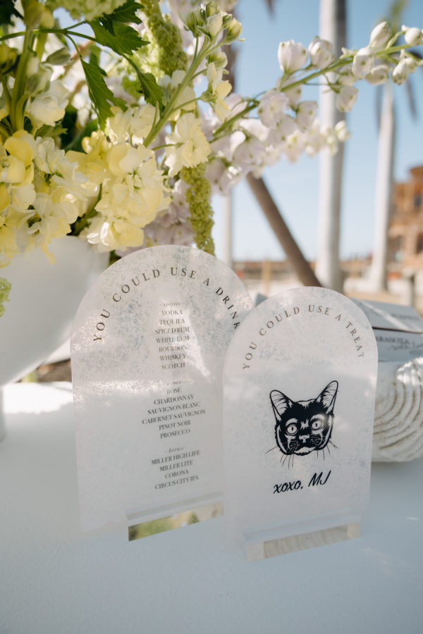 Signature Drinks: Making a signature cocktail with ingredients already stocked behind the bar typically means that you will not incur additional costs. We chose a Spaghetti made with Miller High Life (the “champagne of beers” and a nod to Tim’s hometown near Milwaukee). It is simple but beautiful when served in an old glass bottle — just beer, a splash of Aperol liqueur, and a splash of lemon juice. It is the perfect cocktail hour drink for Spring and Summer because it is colorful and relatively low ABV, so the party doesn’t get too crazy before the guests get something to eat.