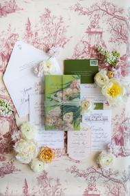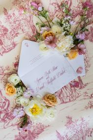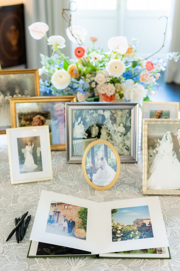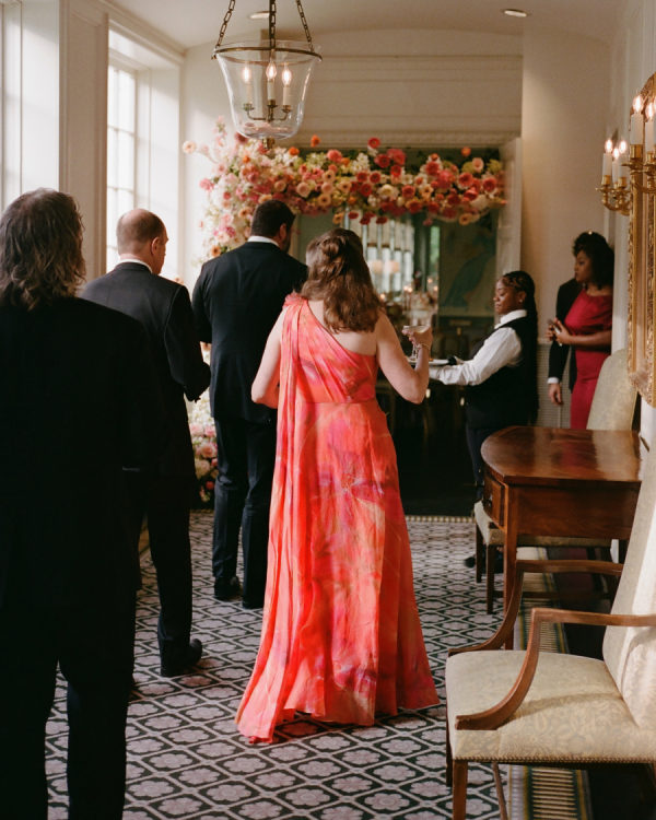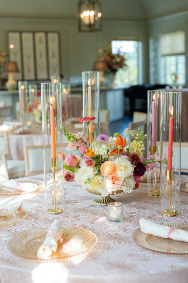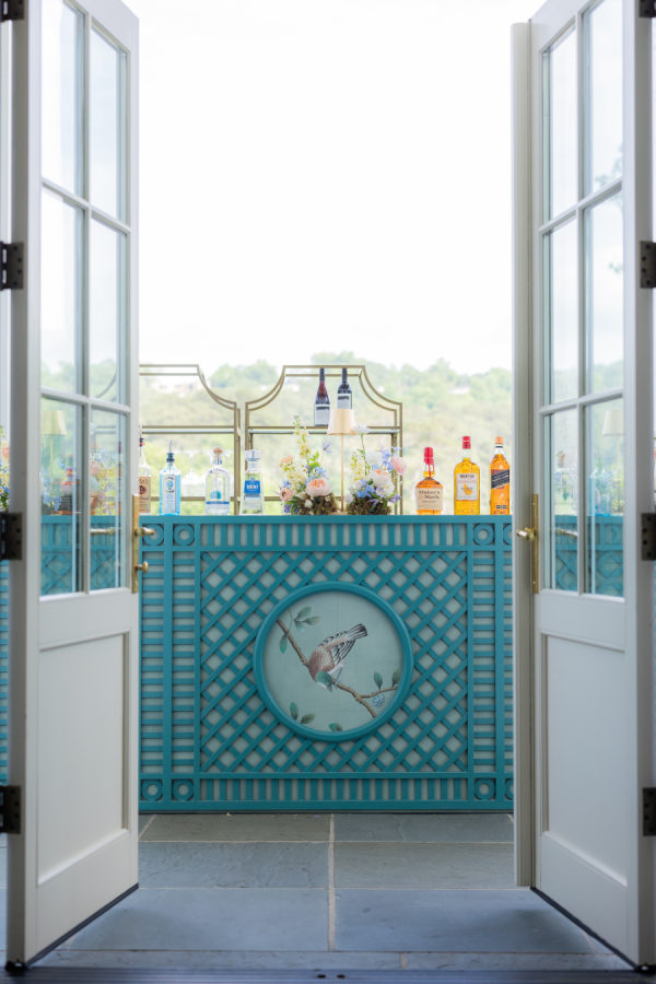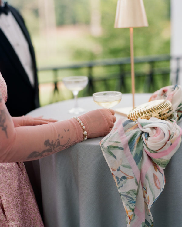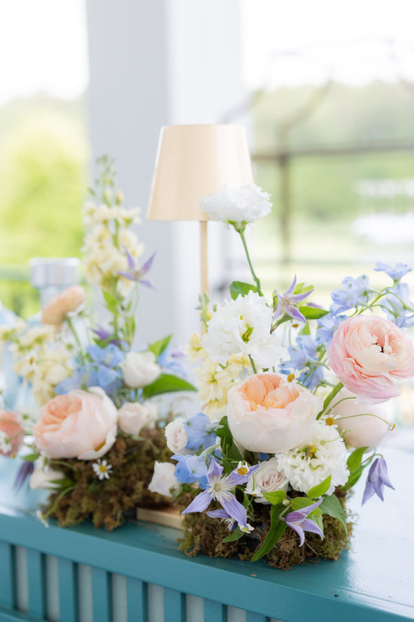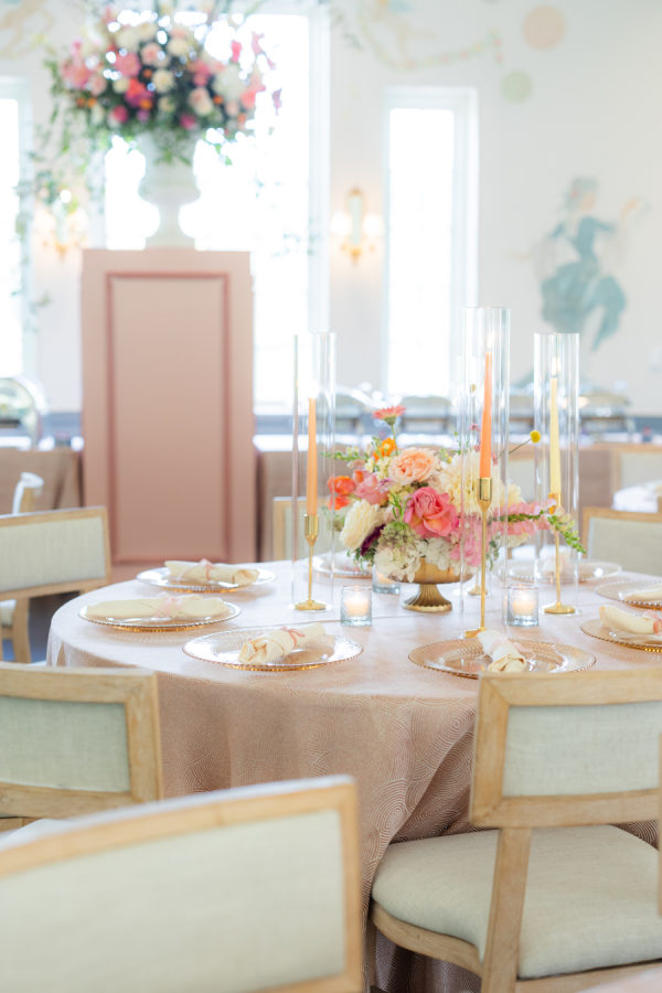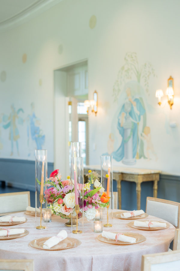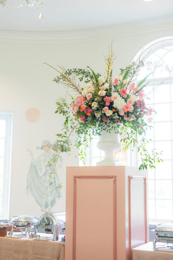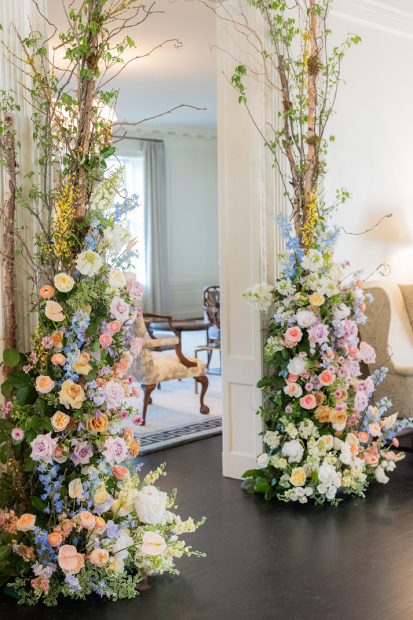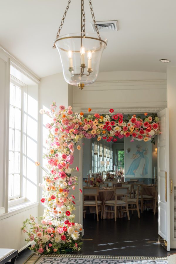 When choosing the design for the reception, I wanted to highlight my favorite color palettes that I have used throughout my nearly 10 years in the industry as a wedding and event designer. I aimed to select designs that have stood the test of time and would always be classically beautiful and true to my personal style. Due to the size of the Mountain Brook Club, I chose three different palettes to create separate experiences for guests within each room. Upon arrival, guests were greeted by full floral archways that reflected the color scheme of their respective rooms. The Bridgerton-inspired color palette that came to life in the living room and terrace focused on light blues, blushes, yellows, and an overall woodland garden style. Linens with as much texture as the florals are always a must, so I paired a two-tone green linen with rattan sofas and a neutral wooden chair to ensure guests felt all the comforts of al fresco dining throughout this southern summer evening. For the dining room, I selected a feminine dream palette of pinks, oranges, and peaches. I have always had a very “girly” side, so this was an instant yes! The abundance of natural light highlighted the classic attributes of this 1929 Colonial Revival, including the iconic dancing guest murals that share the same hues. Lastly, I couldn’t have a true Southern wedding without incorporating all-white florals in the ballroom. Traditionally, all-white wedding florals symbolize new beginnings, making the ballroom—the epicenter of the celebration—the perfect setting for this color scheme. I focused on emphasizing the room’s 1800s-inspired elegance with cascading installations and ornate focal arrangements.