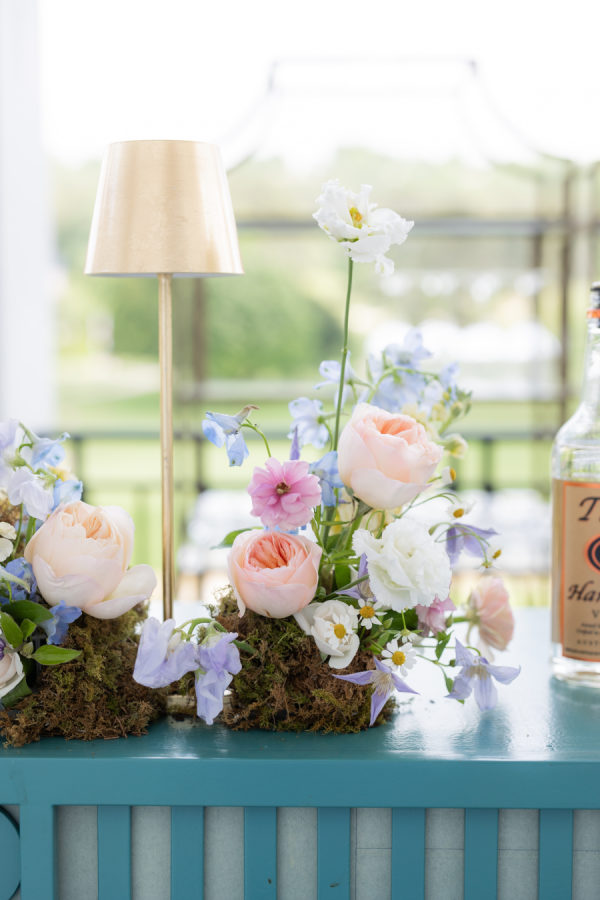 The reception design showcased Symone’s favorite color palettes, chosen for their timeless and personal appeal, with each room offering a unique experience. The living room and terrace highlighted a Bridgerton-inspired palette of blues, blushes, and yellows with textured linens and floral decor. The dining room radiated femininity with pinks, oranges, and peaches, while the ballroom emphasized elegance with all-white florals symbolizing new beginnings!