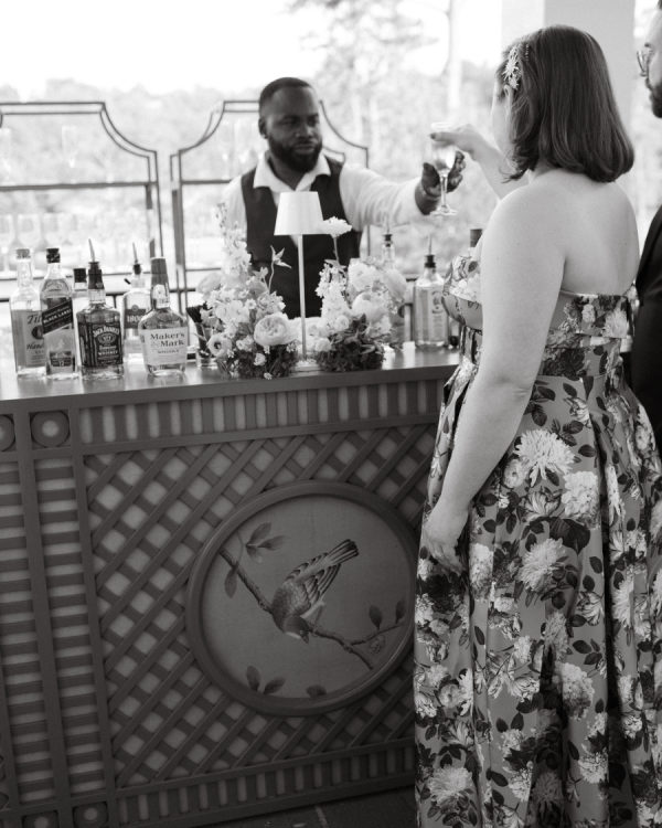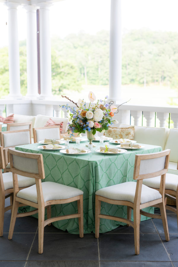 When choosing the design for the reception, Symone wanted to highlight her favorite color palettes that she has used throughout her nearly 10 years in the industry as a wedding and event designer. She aimed to select designs that have stood the test of time and would always be classically beautiful and true to her personal style. Due to the size of the Mountain Brook Club, she chose three different palettes to create separate experiences for guests within each room. Upon arrival, guests were greeted by full floral archways that reflected the color scheme of their respective rooms. The Bridgerton-inspired color palette that came to life in the living room and terrace focused on light blues, blushes, yellows, and an overall woodland garden style. Linens with as much texture as the florals are always a must, so she paired a two-tone green linen with rattan sofas and a neutral wooden chair to ensure guests felt all the comforts of al fresco dining throughout this southern summer evening. For the dining room, Symone selected a feminine dream palette of pinks, oranges, and peaches. She has always had a very “girly” side, so this was a no-brainer! The abundance of natural light highlighted the classic attributes of this 1929 Colonial Revival, including the iconic dancing guest murals that share the same hues. Lastly, Symone couldn’t have a true Southern wedding without incorporating all-white florals in the ballroom. Traditionally, all-white wedding florals symbolize new beginnings, making the ballroom—the epicenter of the celebration—the perfect setting for this color scheme. She focused on emphasizing the room’s 1800s-inspired elegance with cascading installations and ornate focal arrangements.