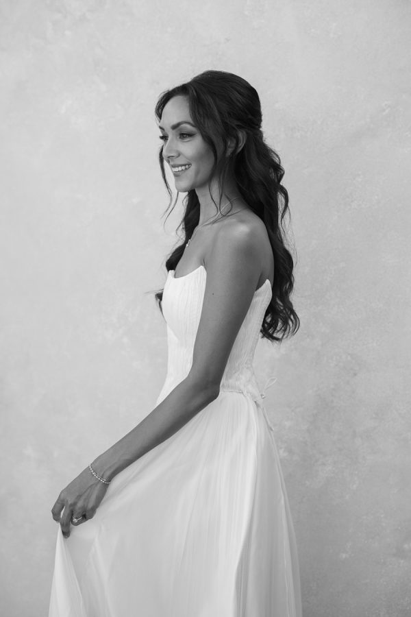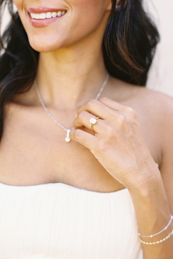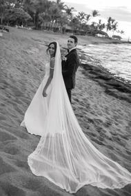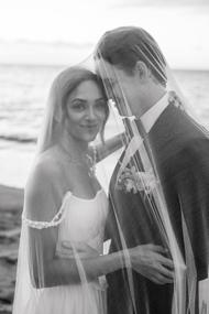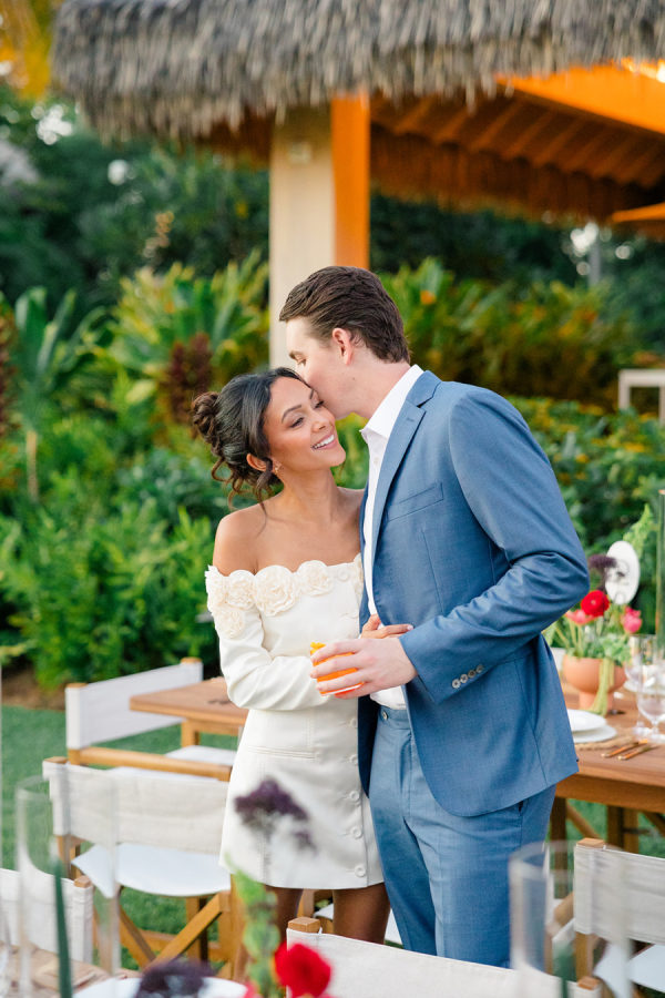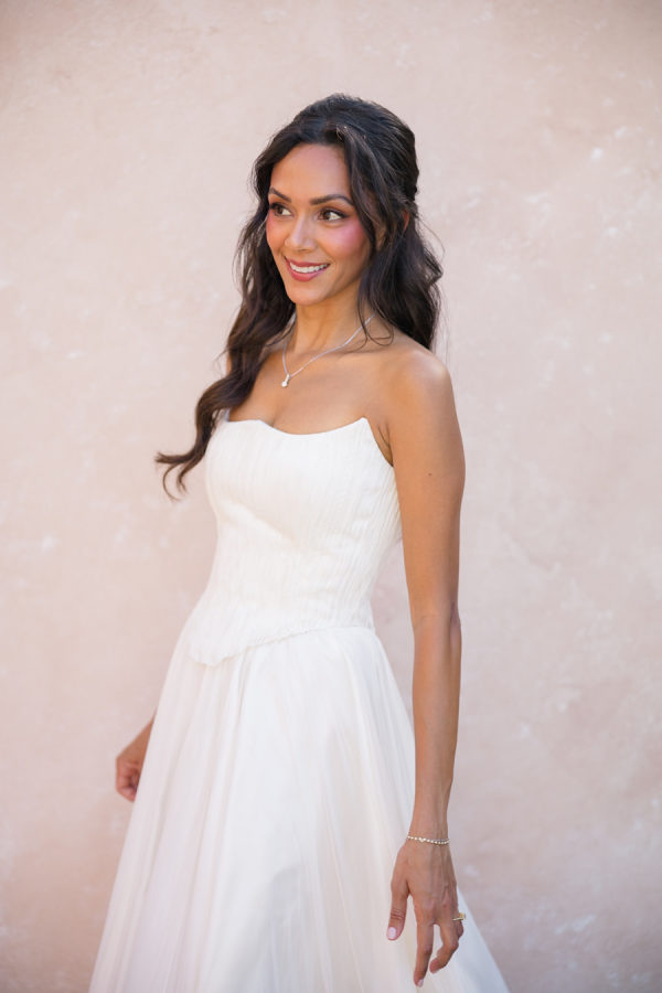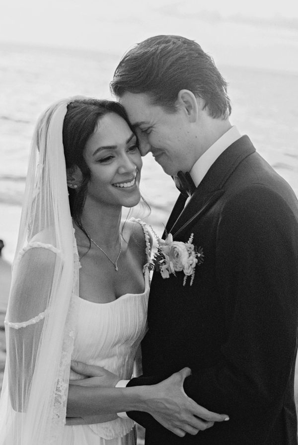 I wore a custom Cinq corset and skirt made of pleated silk tulle, along with a lace-trimmed veil. My favorite part of the attire was that I was able to create different looks over the course of the day through detachable pearl straps and a matching mini skirt for the reception. I loved that the pieces allowed for so much versatility – from a simple strapless gown for the ceremony, to nod at our beautiful beach setting for cocktail hour and sunset photos.