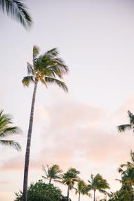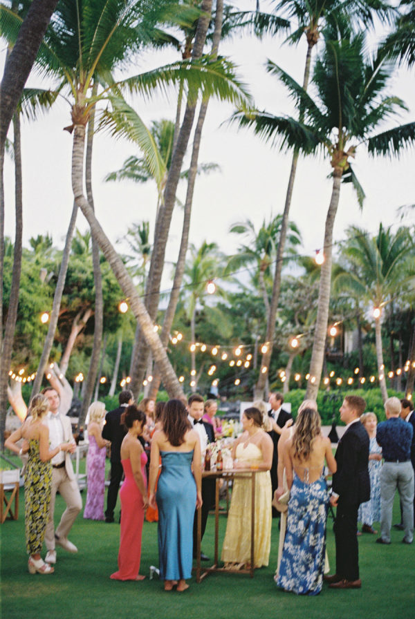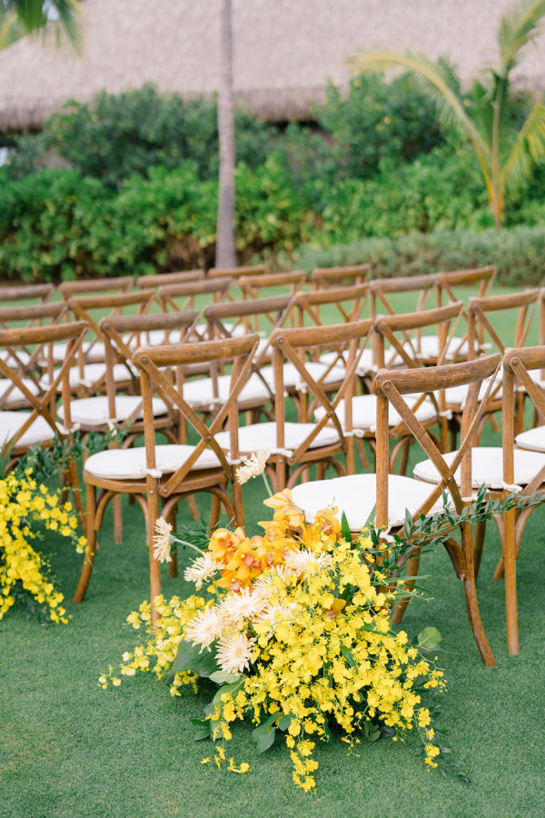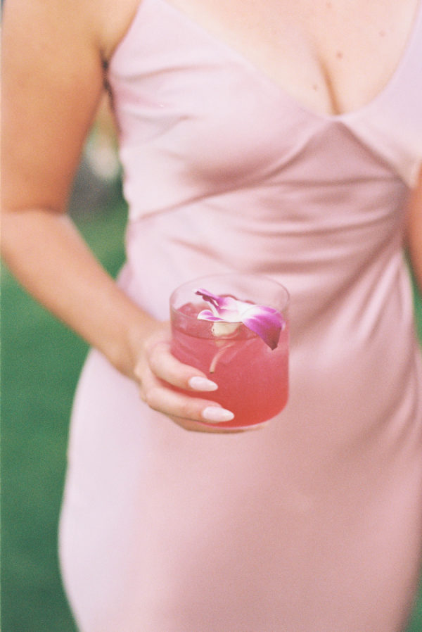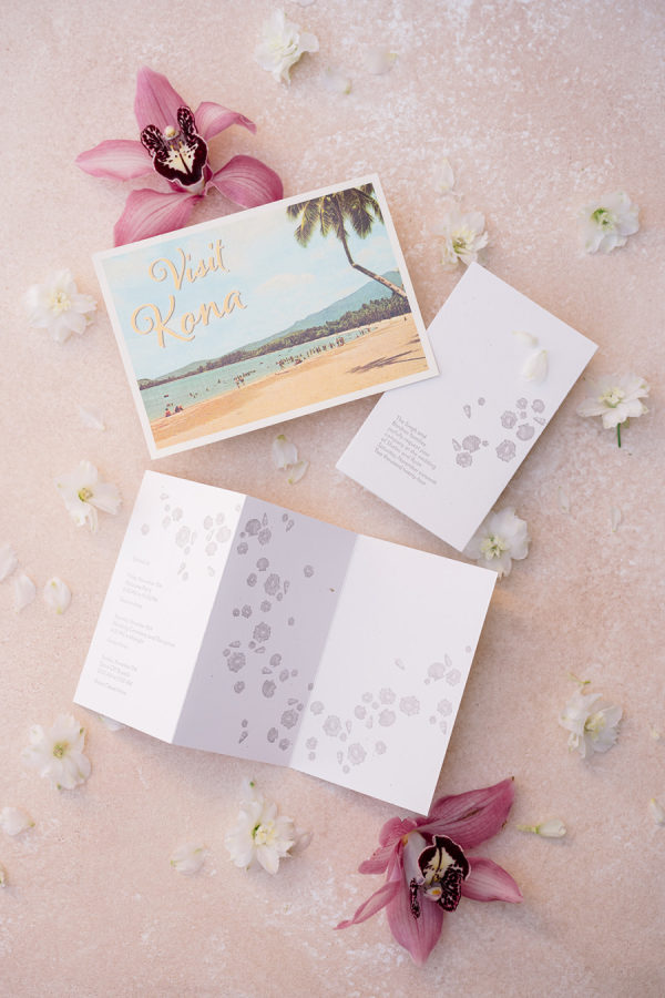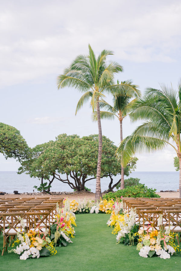 The color palette was inspired by the stunning sunsets of Kailua-Kona, Hawaii. Our wedding planner, Maurisa of Collis Co., had a really fun idea to progress the colors throughout the day in the same way a sunset would evolve. For the ceremony, the florals were soft and dreamy with pastel shades of yellow, pink, and purple mixed with white, similar to the sky right before the sun goes down. Then, as the evening kicked off, the palette got bolder and brighter, pulling in richer peach and coral mauve tones. The palette brought the magic of a Hawaiian sunset into every part of the day.