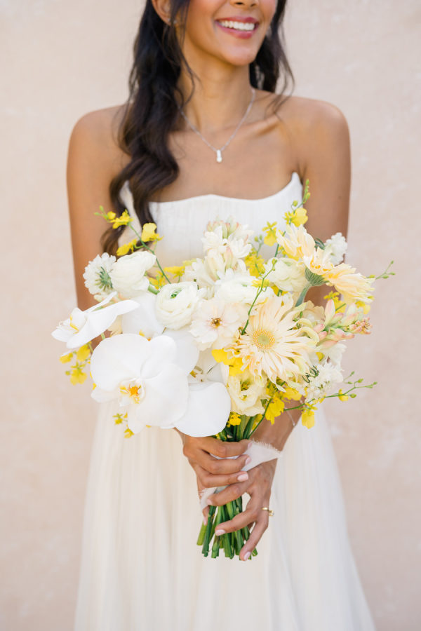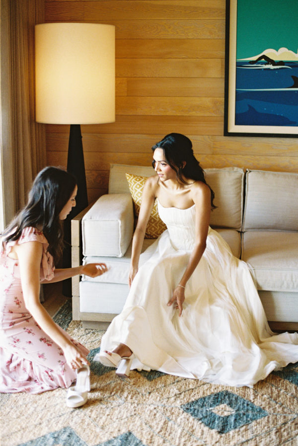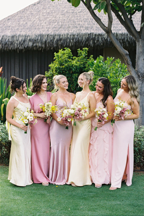 The bridesmaids wore a mix of dresses in different cuts and colors within our sunset palette – muted yellows, soft pinks, and peachy-mauves. It was important to make sure everyone felt confident, comfortable, and beautiful!