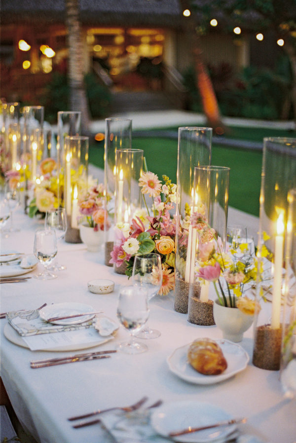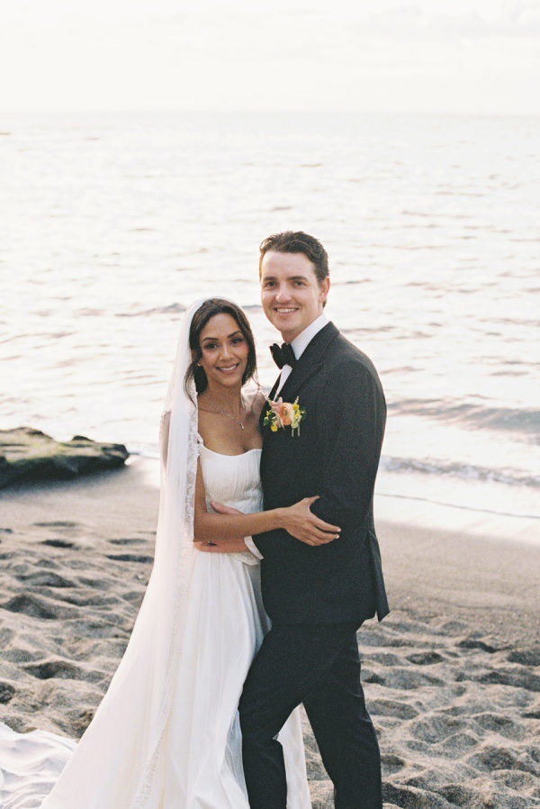 [field title=”Florals & Decor”]We had so much fun working with our planner, Maurisa, and florist, Flower Me Pretty, to create a garden oasis that flowed seamlessly with our beach surroundings. We made sure to use as many local blooms as possible to ensure the design felt natural and cohesive. One of our favorite details was adding black sand from the beach to the candle holders on the reception tablescape.
