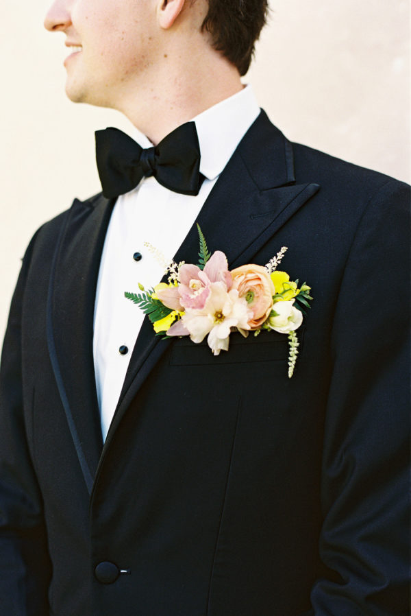The groomsmen wore classic black tuxedos and patent leather dress shoes. Groom Attire: Ryan wore a custom J.Hilburn tuxedo with a velvet-trimmed lapel and cufflinks engraved with our initials. Later in the evening, Ryan switched to a white tuxedo jacket with black trim, while I changed into my mini skirt for dancing!