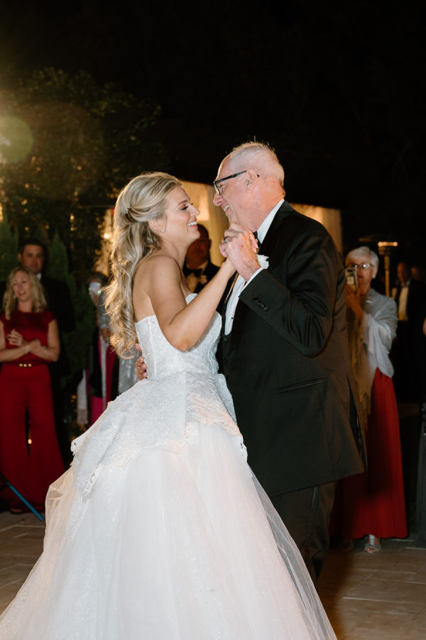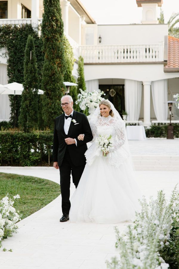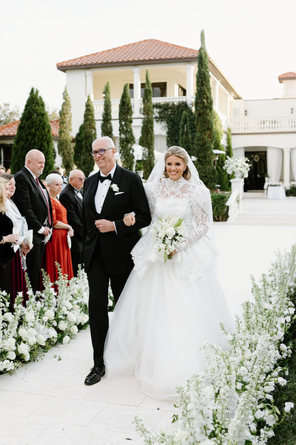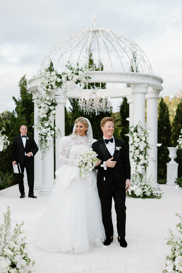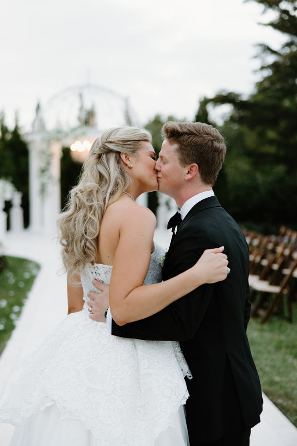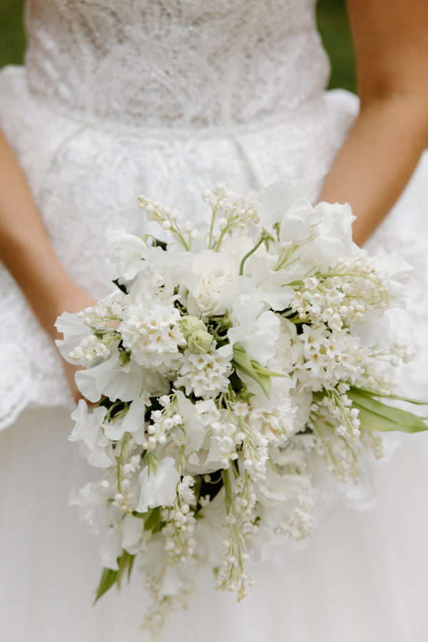 Flowers and romance go hand in hand for me, so I wanted as many floral decorations as possible. Our florist did an amazing job selecting the perfect flowers to make my dream a reality. I wanted a ton of white roses since they’re my favorite flower, so our florist hung them from the pergola. It truly felt magical eating dinner under them! Bouquet: My grandmother and mom both carried lilies of the valley on their wedding day. All of my grandparents passed before my wedding, so it was a must-have in my bouquet. I also wanted something small so it wouldn’t overpower my ceremony look. When I saw my bouquet for the first time, I cried (and I’m not a big crier). There were 57 lilies of the valley, and it felt like my grandmother was there with me.