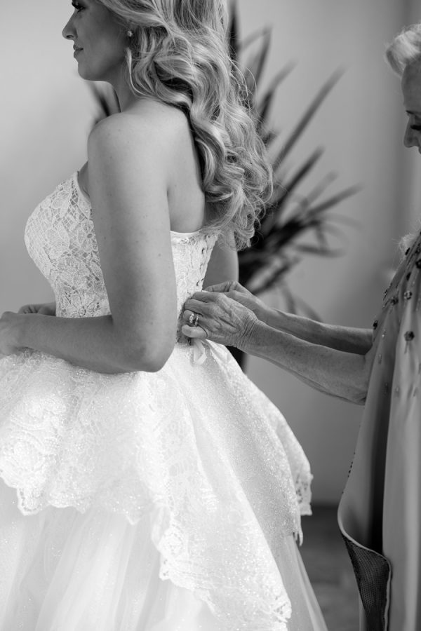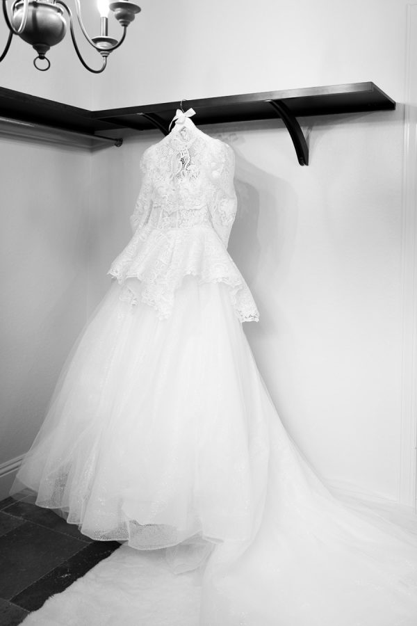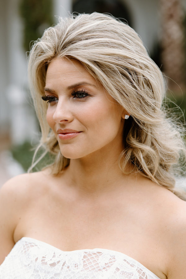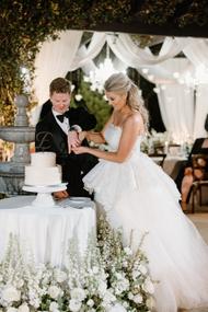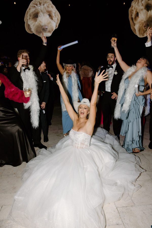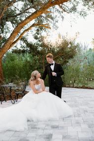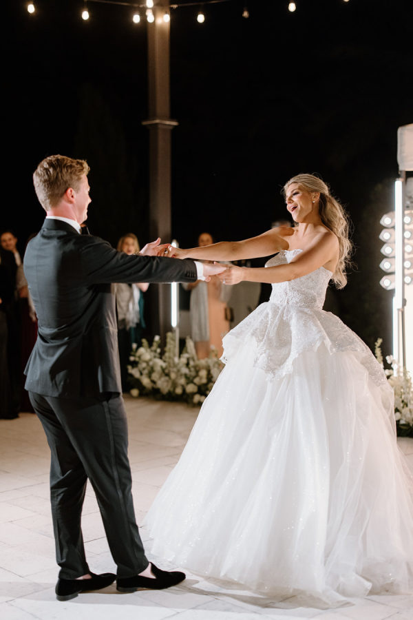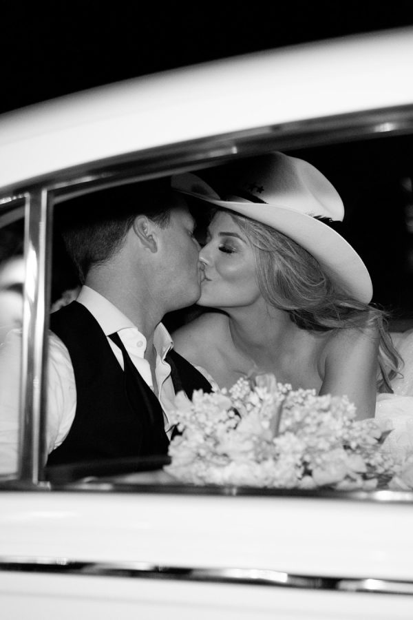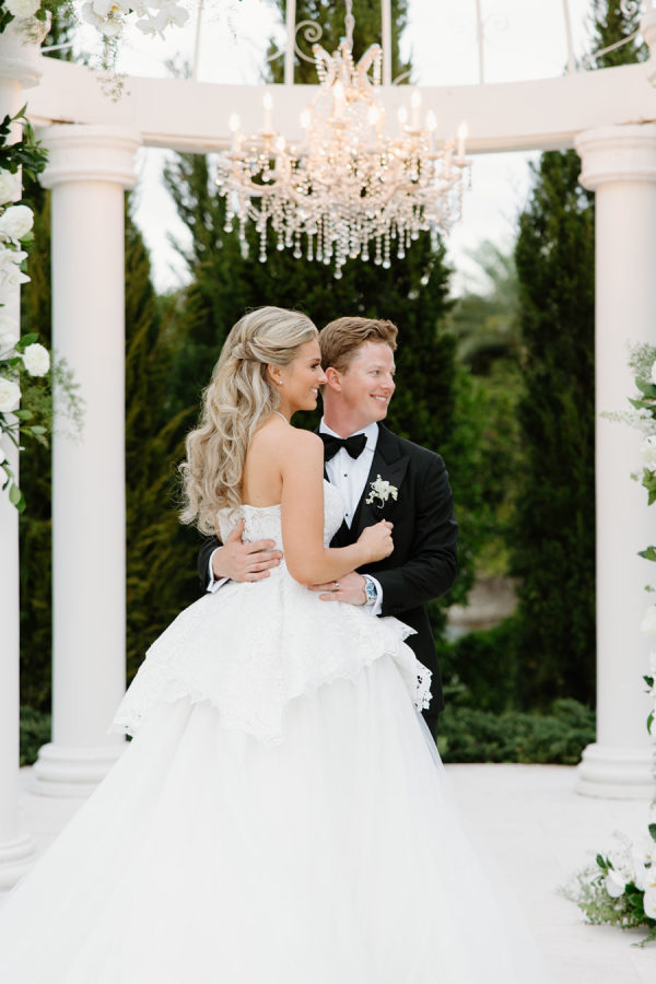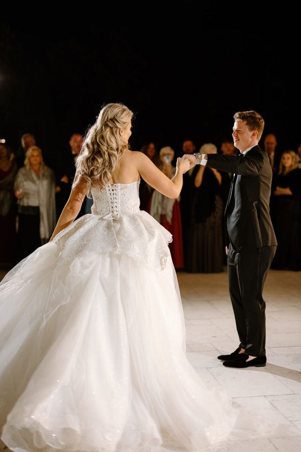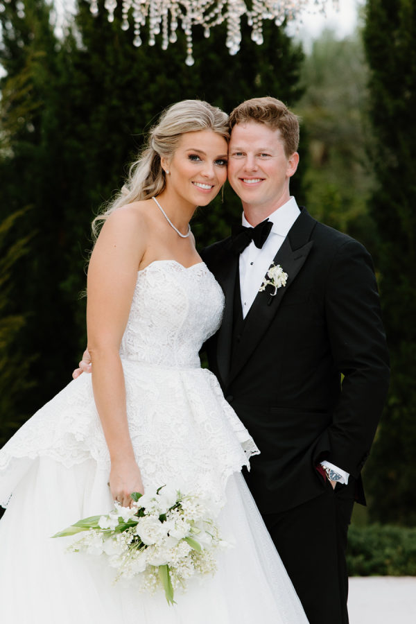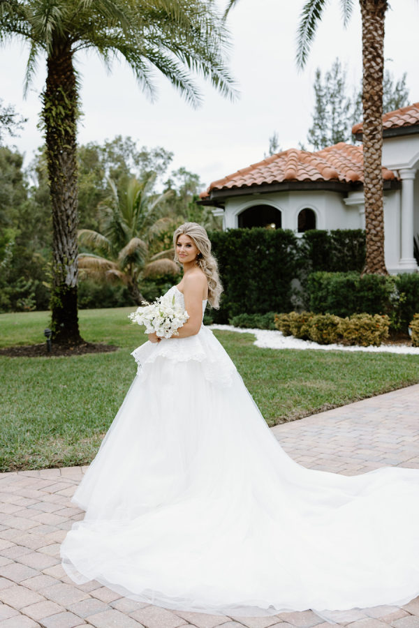My wedding truly captured my style. As Miss Florida USA and wearing a white gown while competing at Miss USA, I wanted something completely different from what I’ve worn before. I’ve always loved Grace Kelly’s style and wanted my wedding dress to be very traditional with an extremely long train. I knew I wanted to wear a Mila Nova dress, so I went to a bridal salon in Tampa and tried on every Mila Nova dress they had in store. My appointment was close to ending, and they went into the back to pull one last Mila Nova dress they had. I tried it on and immediately knew it was exactly what I wanted. The sleeve top and mantilla veil captured the traditional look I wanted during the ceremony. The second top was a peplum piece, and I felt that it showed off the fun side of my personality. During the reception, I took the peplum piece off and had a see-through bodice. I felt it was modern and the perfect look to finish the evening. I changed immediately into cowboy boots with my new initials branded into the side after the ceremony, so I could dance the entire time and really just have fun.