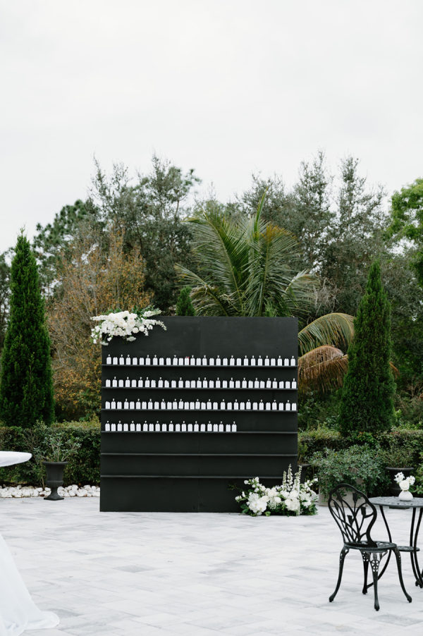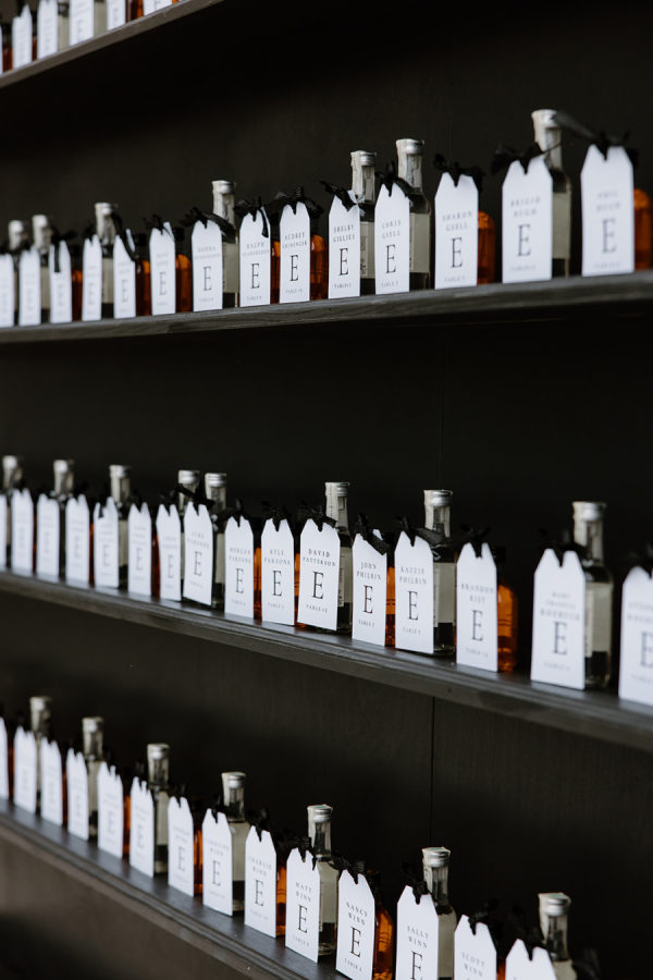 I wanted something fun for our seating chart, and since our friends and family love to have a good time, I felt a “take a shot, take a seat” chart would be perfect for them. We had bourbon and tequila mini bottles, and our guests took them with them to their seats.